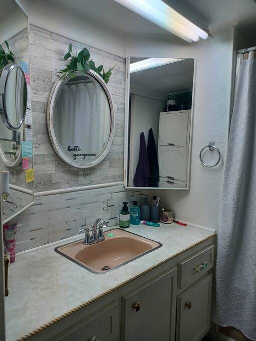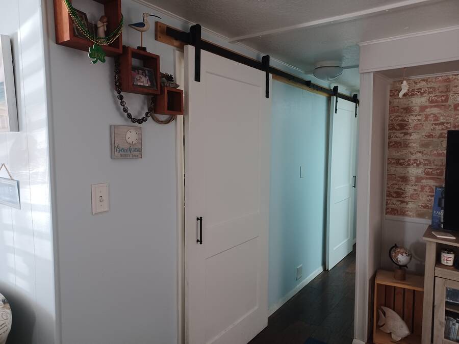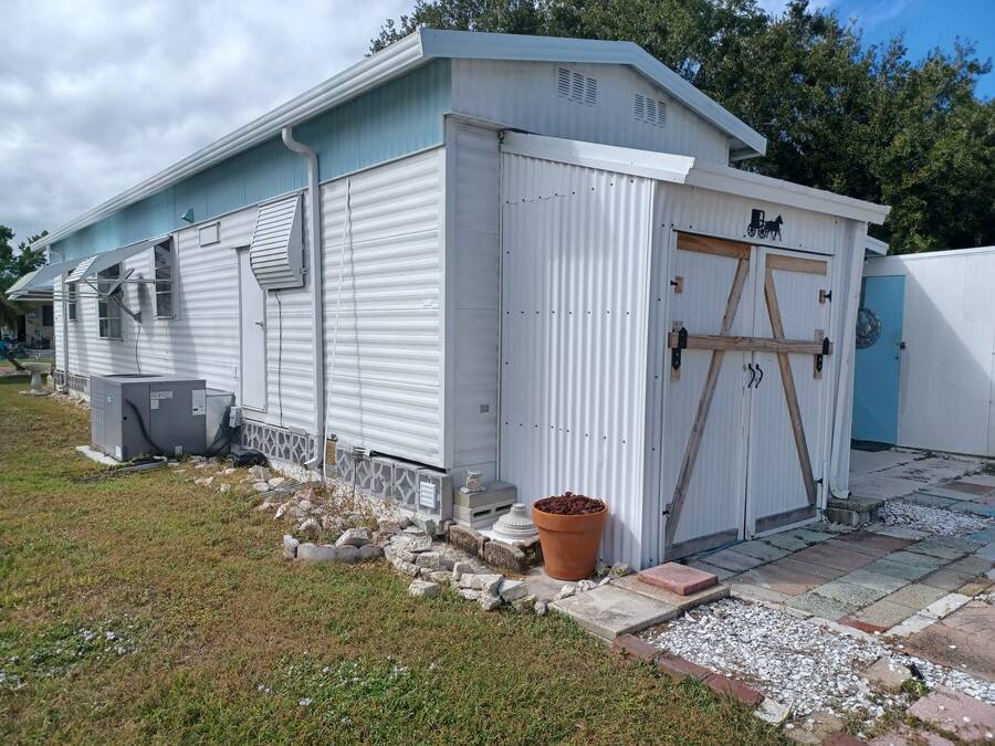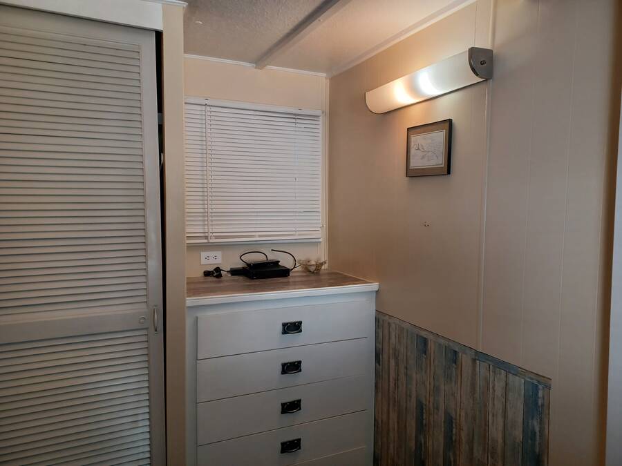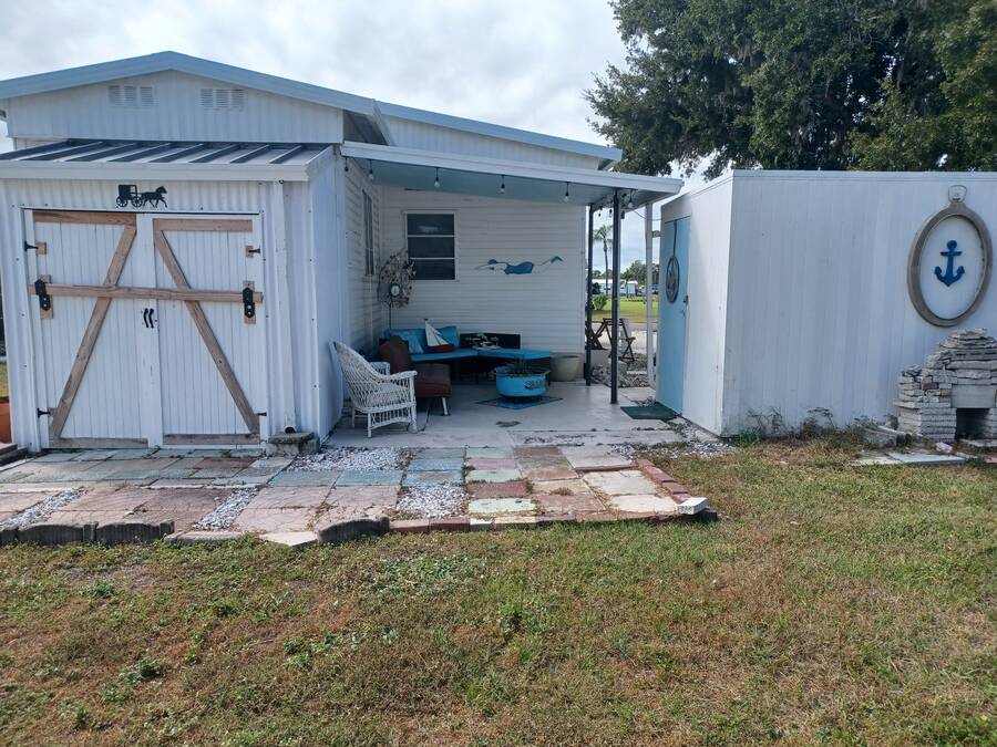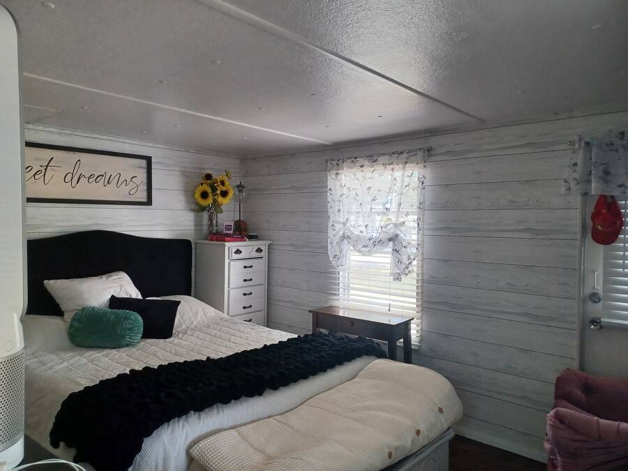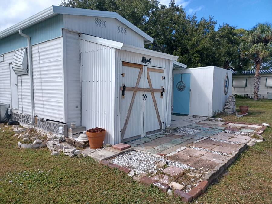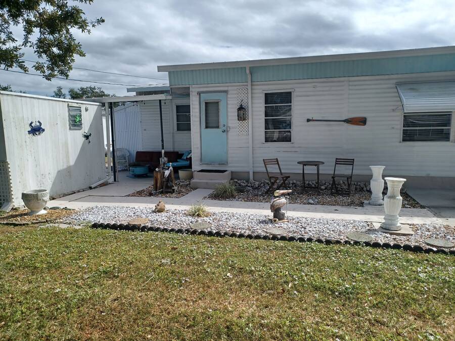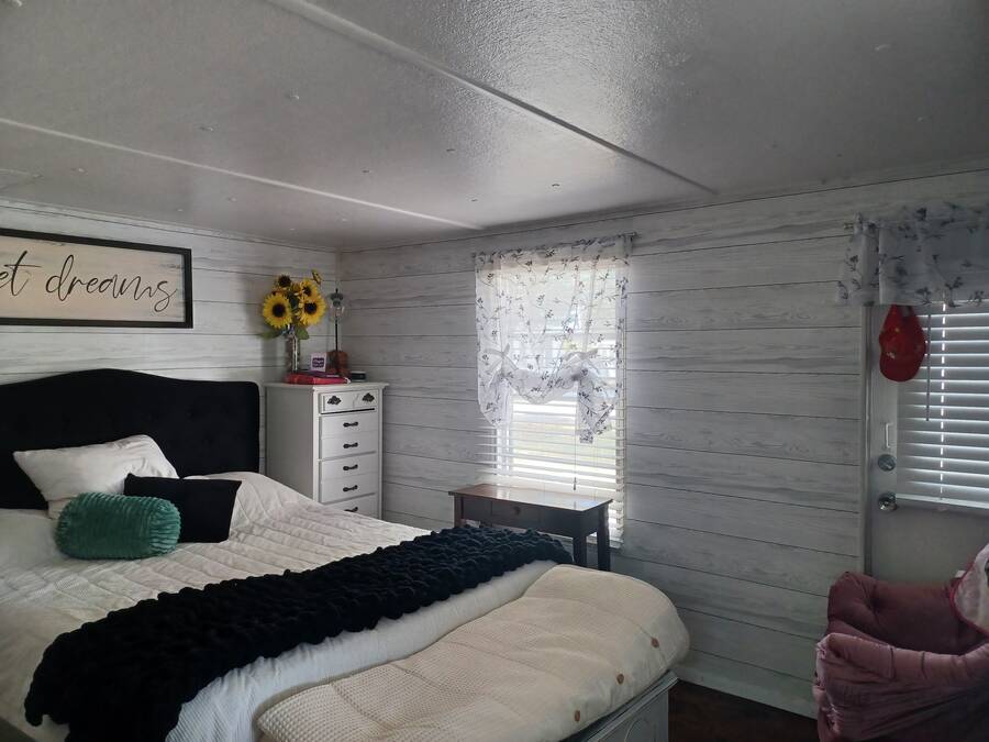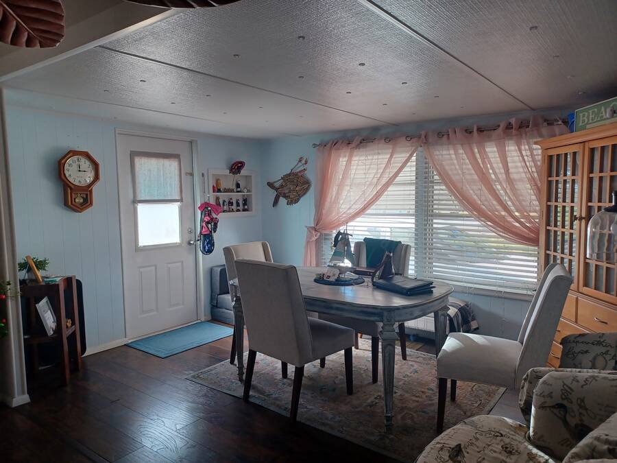 Welcome to your perfect little getaway in this active adult 55 plus community! This beautifully updated 2-bedroom, 1-bath mobile home is bursting with charm and modern touches. Step inside to find a bright, open layout with stylish finishes, fresh paint, and upgraded flooring throughout. The kitchen shines with a cute corner sink area and a great island, making it as functional as it is cute. Outside, enjoy your own private oasis with a spacious yard perfect for relaxing, gardening, or entertaining under the stars. Whether you're sipping coffee on the porch or hosting a weekend BBQ, the outdoor space is a true highlight. You'll love the convenience and lifestyle this home offers. Whether you're looking for a cozy year-round residence or a sunny seasonal retreat, this gem checks all the boxes! The inviting bedroom features a spacious, open layout that seamlessly blends rustic charm with modern elegance. Two sliding barn doors mounted on sleek black hardware, offering both visual warmth and functional versatility. Inside, natural light pours in through windows, illuminating soft neutral tones and cozy textures. The barn doors not only serve as a design focal point but also provide privacy when needed, gliding effortlessly to enclose the space. Whether styled with farmhouse flair or minimalist accents, this bedroom strikes a perfect balance between comfort and character.