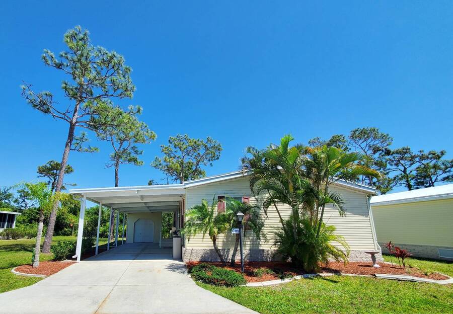 Become an Active Resident at Sunny Florida's 55+ Community Blue Heron Pines: 29200 Jones Loop Rd., Lot #125, Punta Gorda, Fl. 33950. Centrally Located to Airport's/Golf/Disney/Beaches & Braves or Ray's Sport's & More! Partially Furnished. Approx. 1152 sq. ft. 2003 Home of Merit manufactured Home. Three BedRoom Two Bath 4 Car Carport with Golf Cart Garage on an OverSized Lot with a BackYard Oasis! Golf Cart Negotiable. UpDates: Entire Home Water Softner by Rain Soft. Roof-Membrane. A/C maintained by Four Season's. 2024: Home Pressure washed. 2023: Washer & Dryer & Stainless French Door Refrigerator. 2020: Hot Water Heater. No Microwave. Enter into Vaulted Ceilings OPEN CONCEPT New Age Decor. Honey Oak Flooring. First Guest BedRoom will accommodate a Queen Size Grouping. Has a Full size currently. Guest Bath Tub/Shower Combo. Second Guest BedRoom currently an Office with French Door's & a Lockable Closet in case You would like to Rent out Seasonally. Master BedRoom has 12" Tile Flooring. Queen Size Grouping in place now with Walk-In Closet. Can fit a King Size Grouping if you prefer. Master Bath has an Additional Extra Large Linen Closet for Storage. Dual Vanities with storage cabinets below. Shower has Seating Too! Home has Neutral Painted Drywall thru the Home. Kitchen w/ 3 Seating Breakfast Bar. Wrap Around Bevelled Glass above Cabinets & Below Cabinets for More Storage. Stainless Dual Sink. No Disposal, But! wired for one. Dishwasher, Flat Range & French Door Bottom Freezer Refrigerator. Laundry Alcove with Washer & Dryer included in the Sale. Breakfast Nook for Coffee Time. Exit thru Slider's to Your Extra Large 10" Tiled & Screened Lanai with a Scenic View of Mature Landscaping & an Additional Patio for Your Back Yard Entertaining! Call Today! for Your Personal Tour!