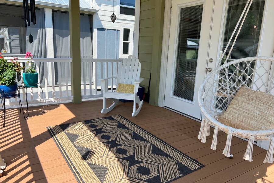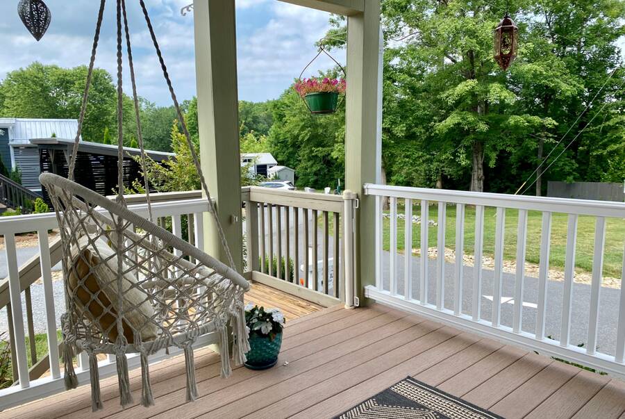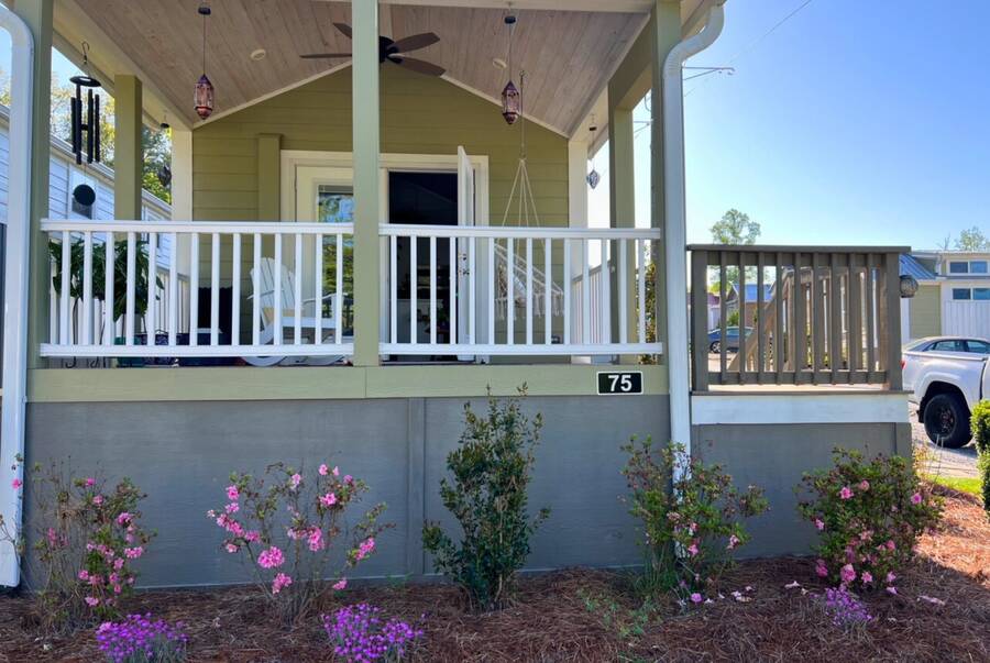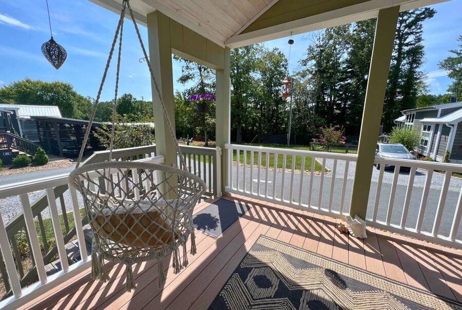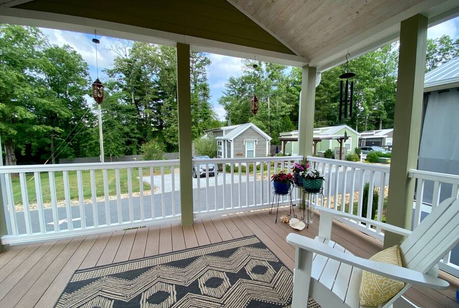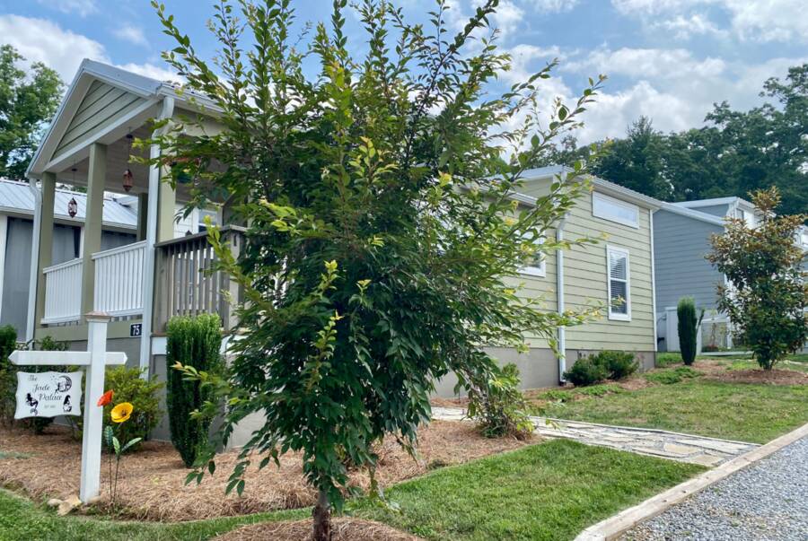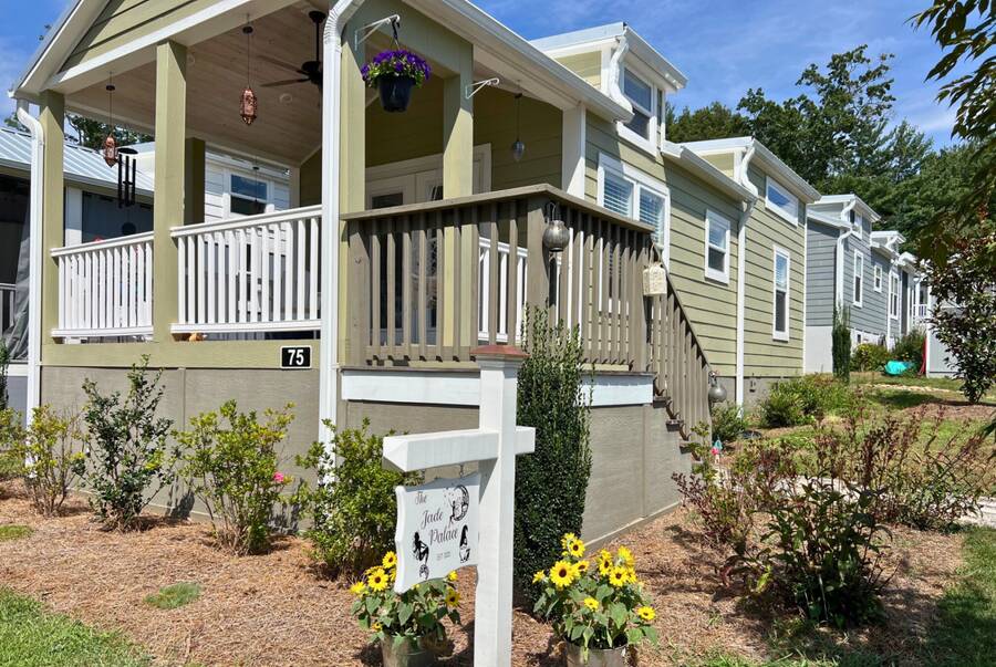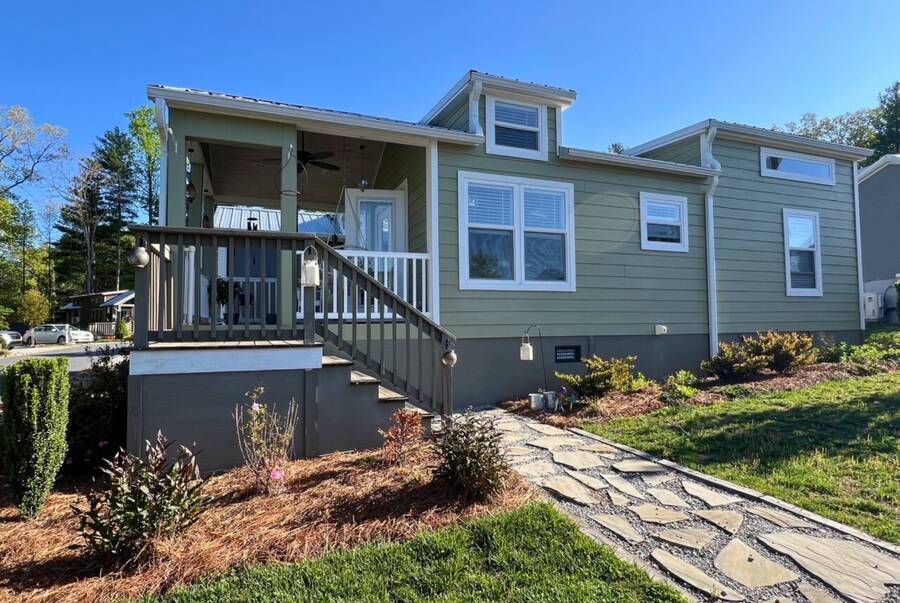 The home is located in The Village, 24 Empire Lane, Flat Rock, NC 28731, an all-ages, family-friendly, tiny-home community managed onsite by Simple Life.