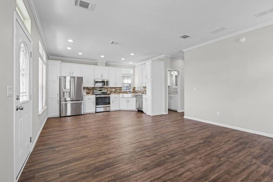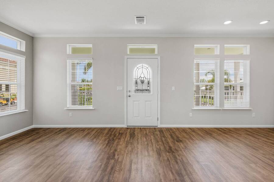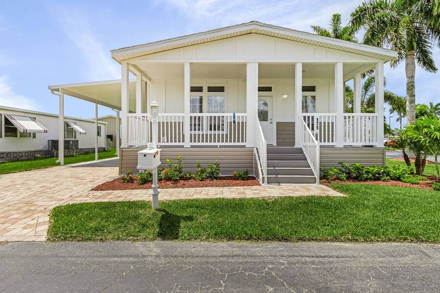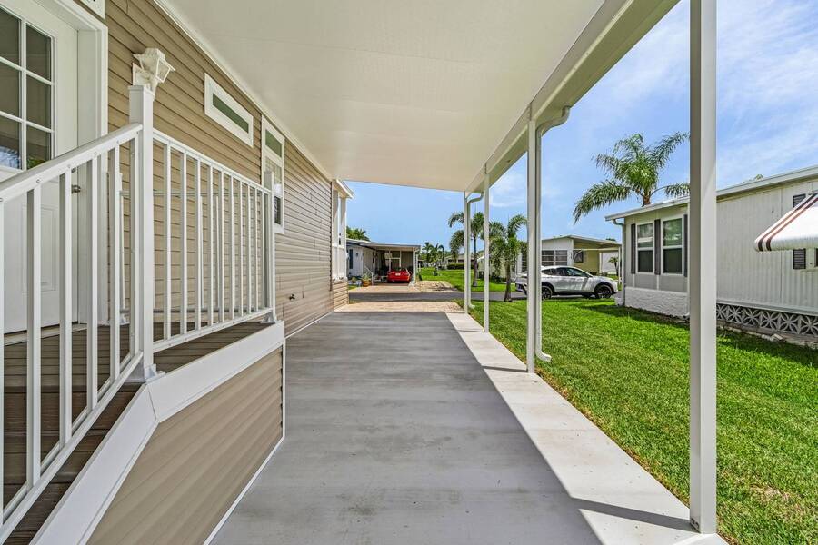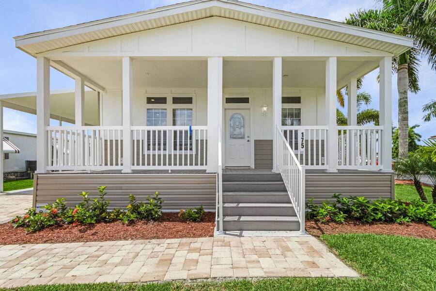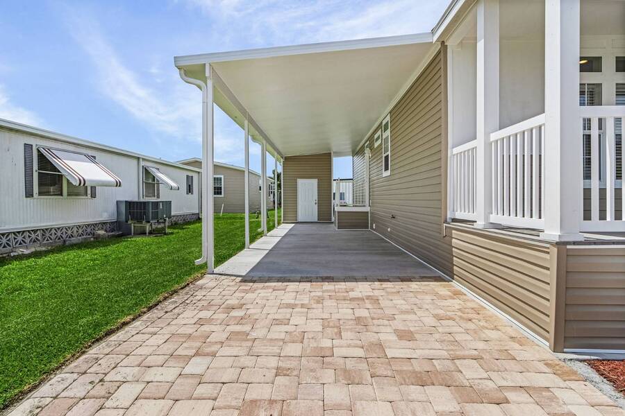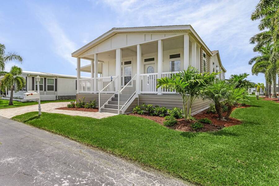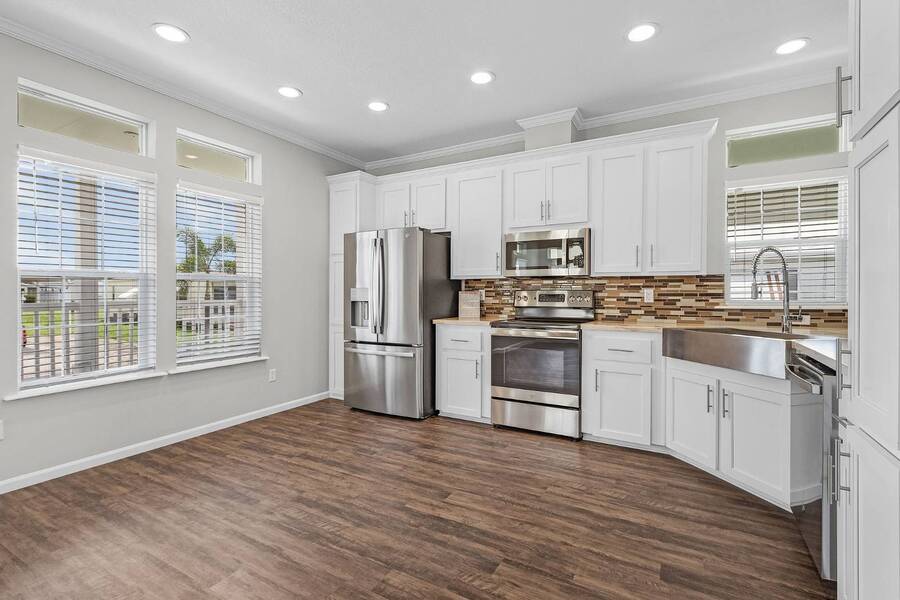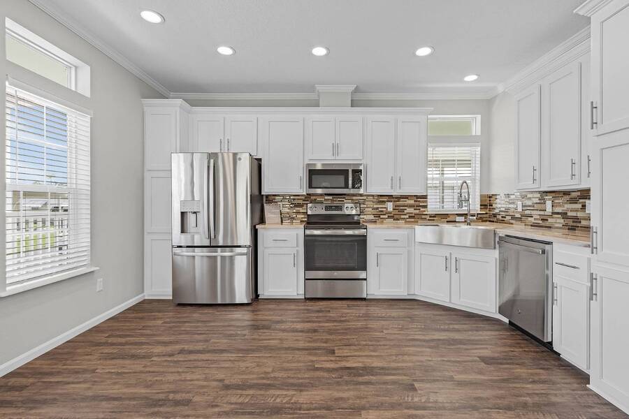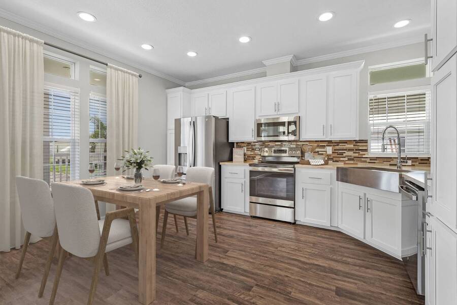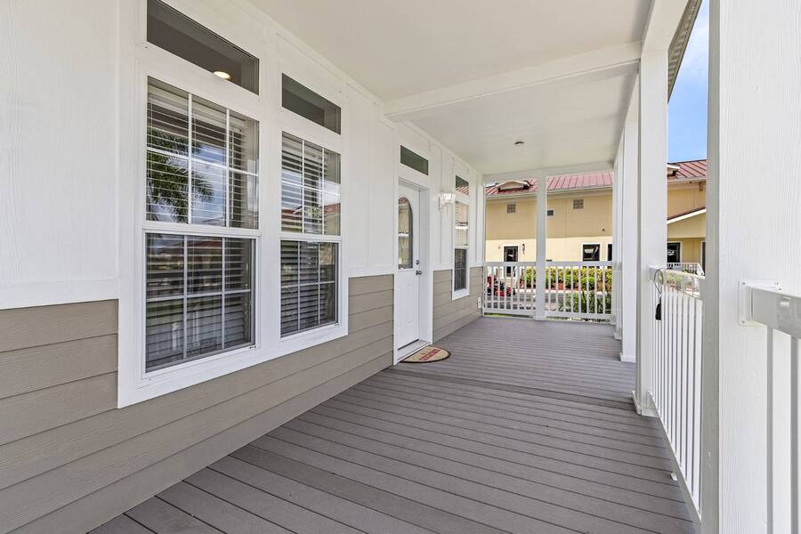 This 2024 Jacobsen Home offering two bedrooms, plus a den, is ready and waiting with wide open great room design, 9ft ceilings, transom windows, crown and base trim, luxury vinyl oak flooring throughout, cabinetry w/ satin nickel fixtures, plus a full GE S/S appliance package in kitchen, LED lighting through out, window blinds, and so much more! Bonus laundry room/pantry, with washer /dryer hook-ups at the side entrance. We will provide you with a gift card to fill in your preference for the washer/dryer. All Jacobsen homes are built to the highest wind zone standards and include storage shed, composite decking and porch, sodded lot with irrigation, paver sidewalks, and nice landscaping package. For those looking for an active 55plus community with resort style amenities, there is a lot of value for the investment with classes, parties, events, happy hours music and yes, we are pet friendly hosting two dog parks. The home is located just across from the 30,000 Sq. Ft. Amenity Center, or drive over in your new golf cart included with this purchase. When the grands visit, bring them to the Olympic style pool, ping pong, mini golf course, bocce, shuffle board, billiard room or fitness center and pickleball courts. Stop searching and start living a dream lifestyle, conveniently located close to downtown shopping, attractions, and the Beach. (Some photos virtually staged)
