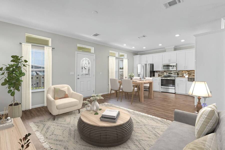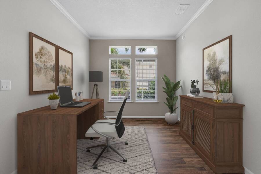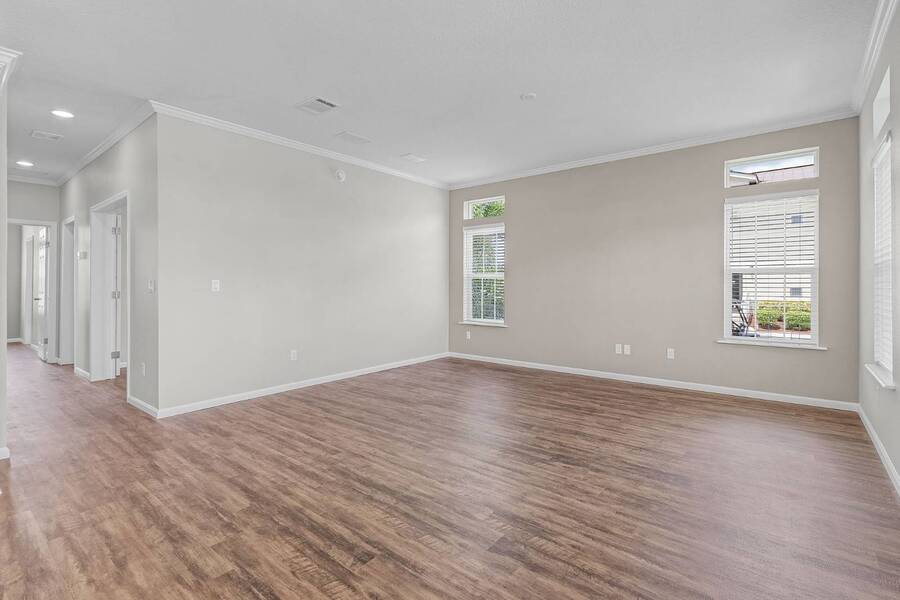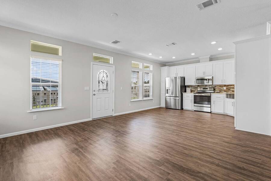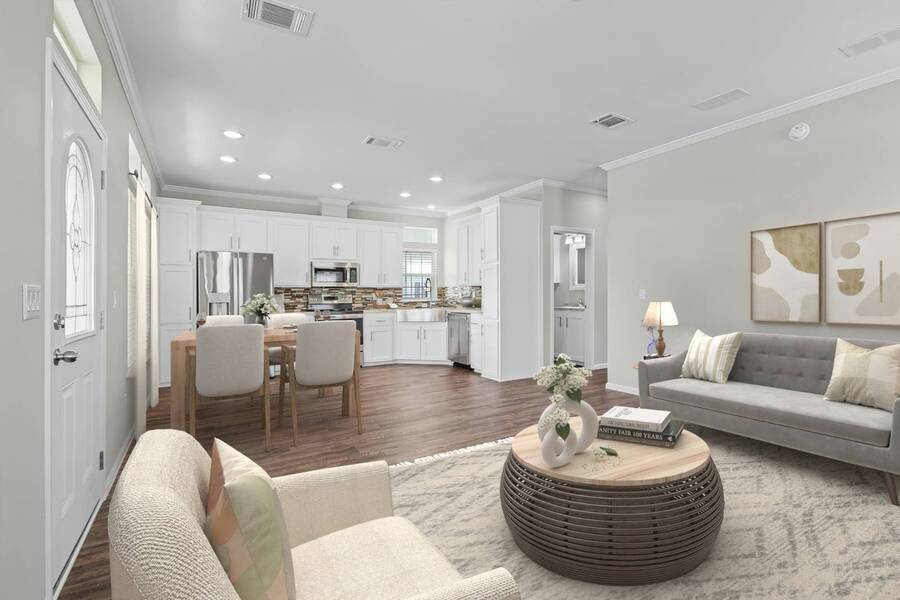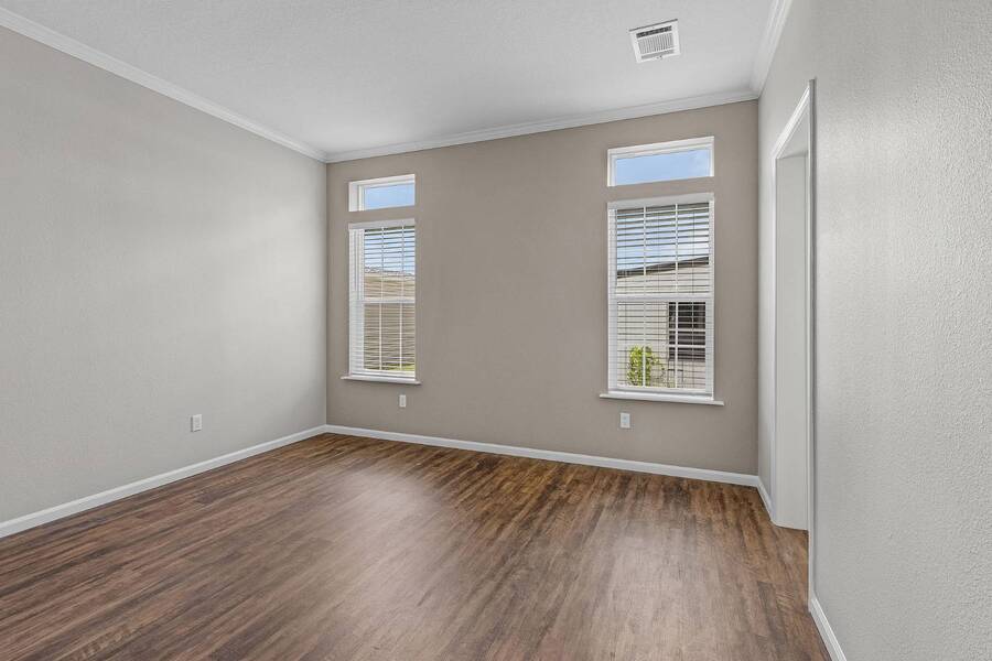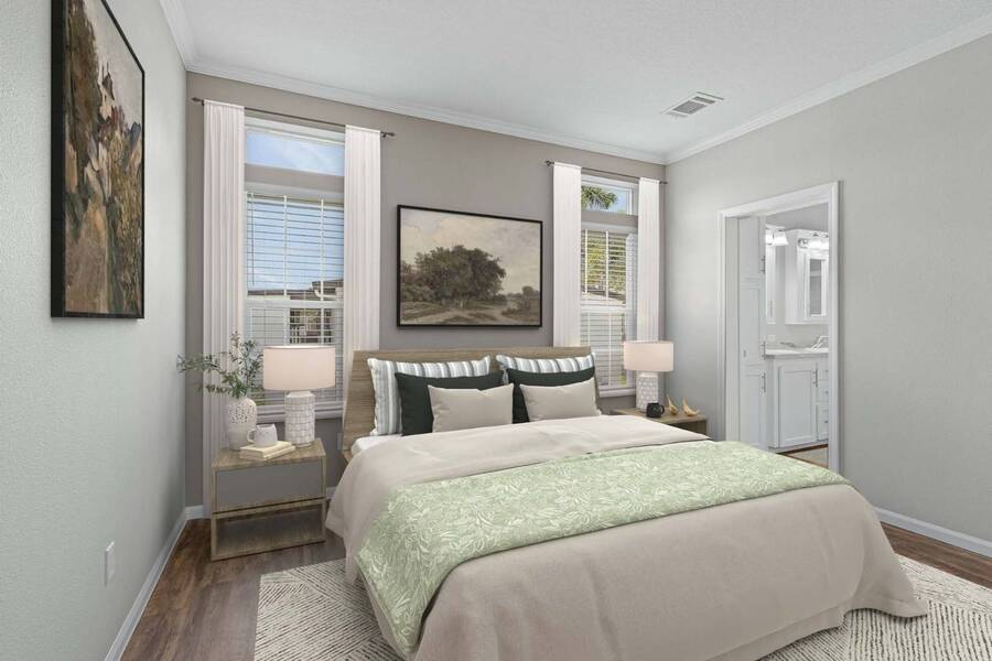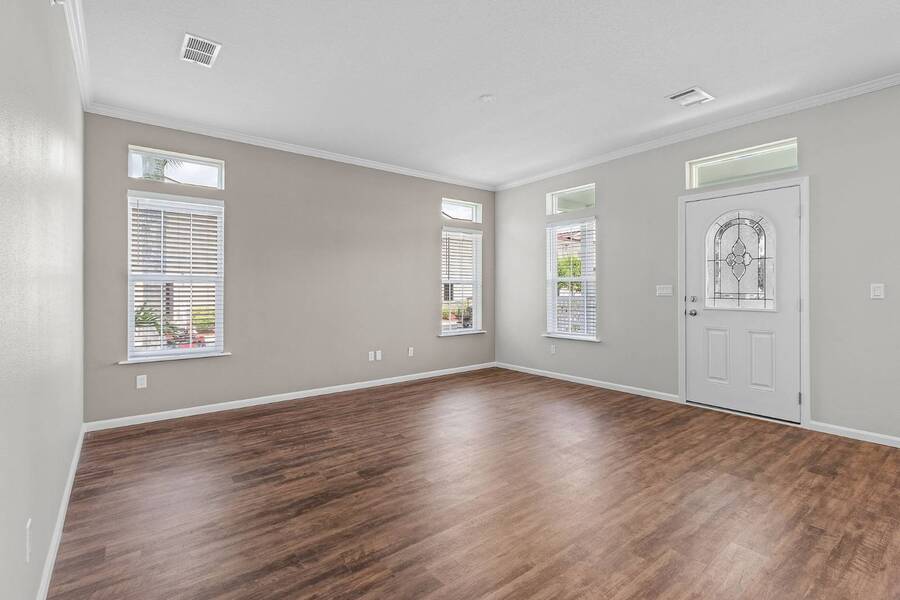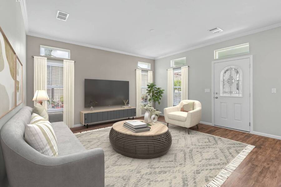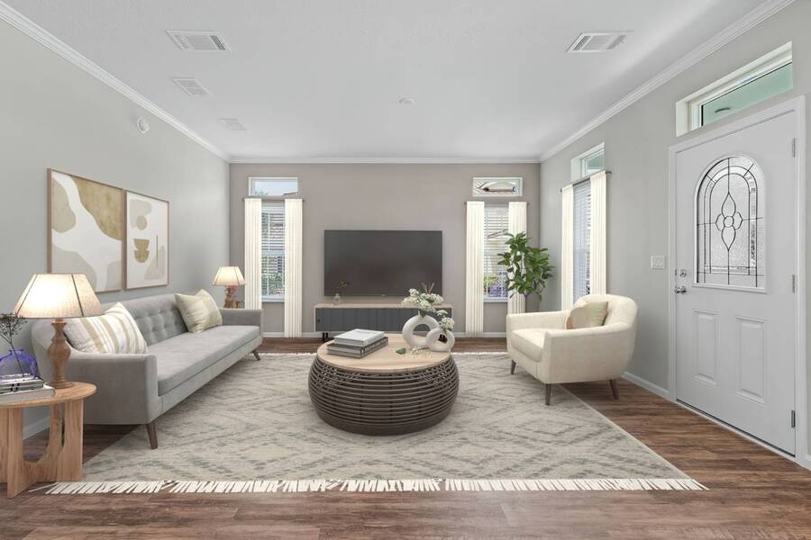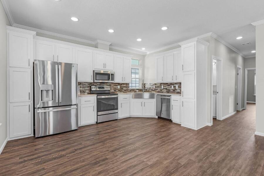 This 2024 Jacobsen Home offering two bedrooms, plus a den, is ready and waiting with wide open great room design, 9ft ceilings, transom windows, crown and base trim, luxury vinyl oak flooring throughout, cabinetry w/ satin nickel fixtures, plus a full GE S/S appliance package in kitchen, LED lighting through out, window blinds, and so much more! Bonus laundry room/pantry, with washer /dryer hook-ups at the side entrance. We will provide you with a gift card to fill in your preference for the washer/dryer. All Jacobsen homes are built to the highest wind zone standards and include storage shed, composite decking and porch, sodded lot with irrigation, paver sidewalks, and nice landscaping package. For those looking for an active 55plus community with resort style amenities, there is a lot of value for the investment with classes, parties, events, happy hours music and yes, we are pet friendly hosting two dog parks. The home is located just across from the 30,000 Sq. Ft. Amenity Center, or drive over in your new golf cart included with this purchase. When the grands visit, bring them to the Olympic style pool, ping pong, mini golf course, bocce, shuffle board, billiard room or fitness center and pickleball courts. Stop searching and start living a dream lifestyle, conveniently located close to downtown shopping, attractions, and the Beach. (Some photos virtually staged)