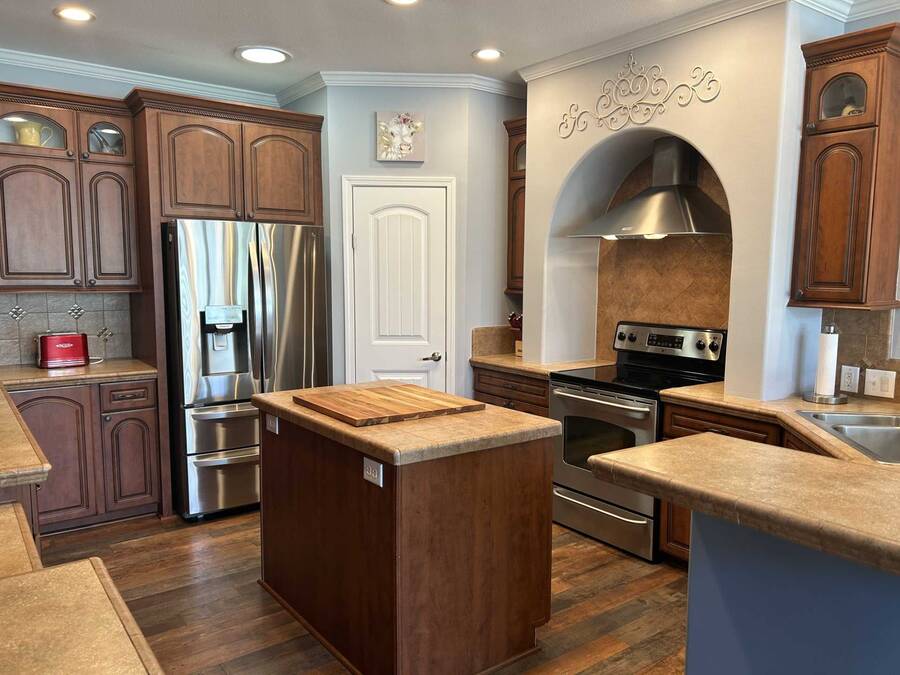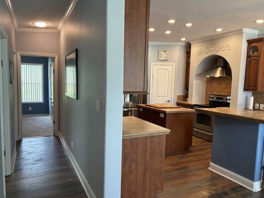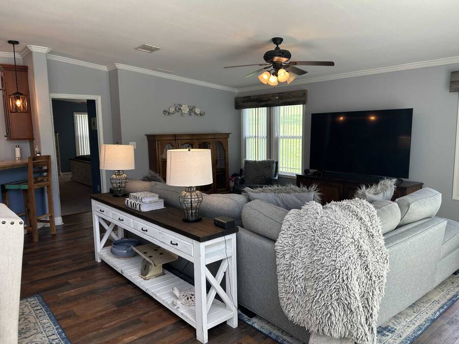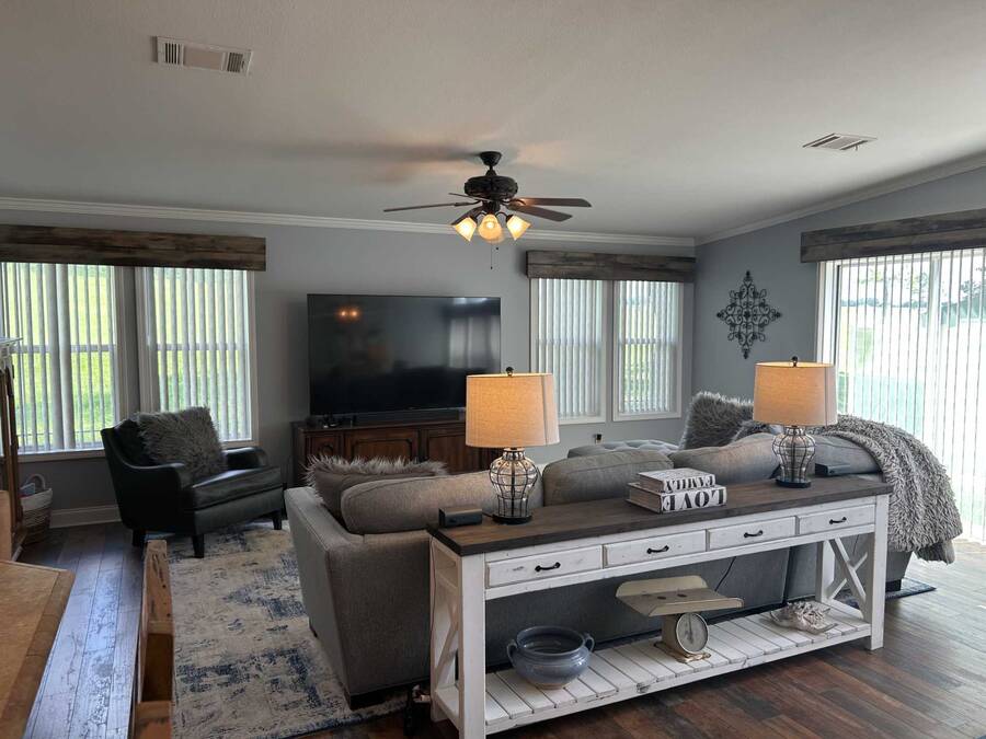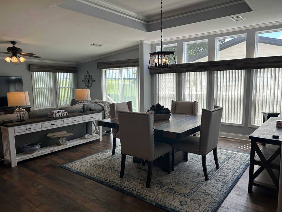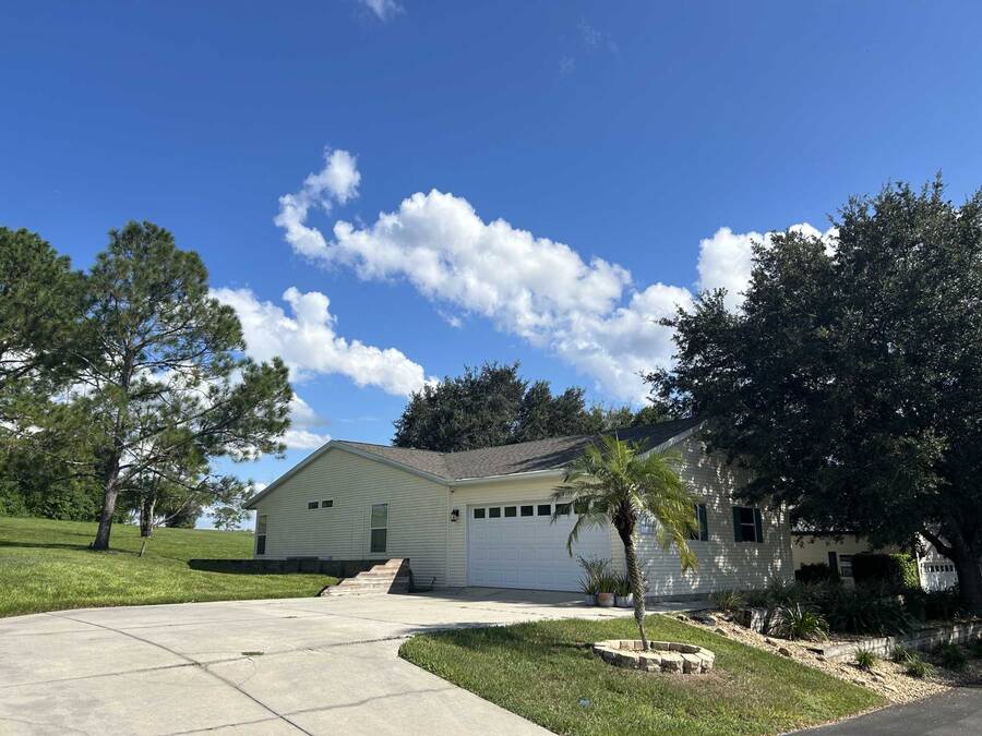 Wow - What a home! This 2007 Palm Harbor Triple-wide home has a roomy entryway for a Mud Area or Entry table. The French doors lead to the office and a north wing leads to the inside Laundry room and Private Guest bed and bathroom. This home is spacious and functional. The ""Top Notch"" Kitchen's Breakfast bar is open to both the dining and living room. It is gorgeous with its large working island, stainless steel appliances, the refrigerator has French doors, an icemaker, and a Flex-zone drawer. There's tons of counter space and cabinets, decorative glass cabinetry, built-in Bread-Box, Walk-in Pantry , Range-Hood with Niche, and a built-in Wine-holder. The dining room features an elegant Tray ceiling with lighting medallion and the large living room has great views of the golf course. The Primary bedroom has a lovely bay window and both bedrooms have plush carpet. The rest of the home has updated warm wood laminate flooring. The custom wood valences throughout, complete the home with a clean and natural feel. The many outdoor spaces of this home are enhanced by its high elevation - great for a spectacular view of the golf course at the rear, and additional gathering areas at the front enclosed porch and fire-pit seating area. The long driveway will accommodate extra vehicles, while the garage features handy loft storage with pull down stairs for easy access. This home has many window that let in lots of natural light and of course - those spectacular views of the golf course.