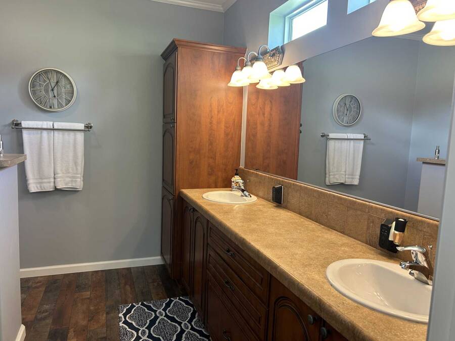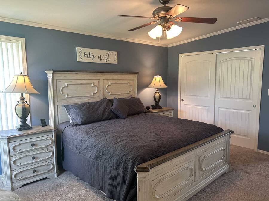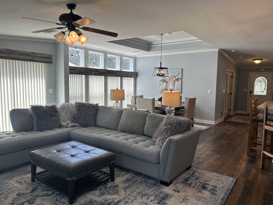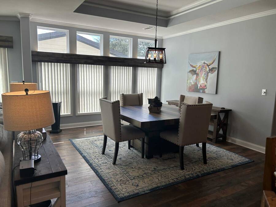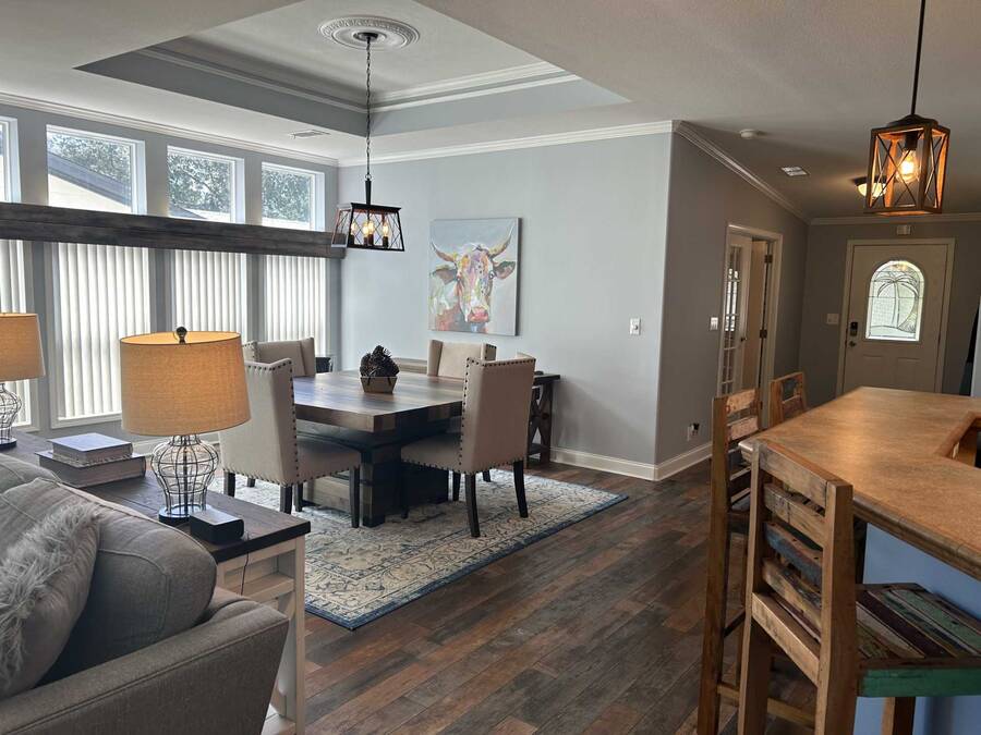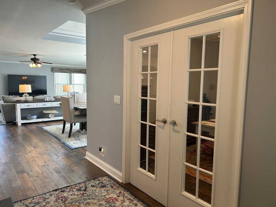 Wow - What a home! This 2007 Palm Harbor Triple-wide home has a roomy entryway for a Mud Area or Entry table. The French doors lead to the office and a north wing leads to the inside Laundry room and Private Guest bed and bathroom. This home is spacious and functional. The ""Top Notch"" Kitchen's Breakfast bar is open to both the dining and living room. It is gorgeous with its large working island, stainless steel appliances, the refrigerator has French doors, an icemaker, and a Flex-zone drawer. There's tons of counter space and cabinets, decorative glass cabinetry, built-in Bread-Box, Walk-in Pantry , Range-Hood with Niche, and a built-in Wine-holder. The dining room features an elegant Tray ceiling with lighting medallion and the large living room has great views of the golf course. The Primary bedroom has a lovely bay window and both bedrooms have plush carpet. The rest of the home has updated warm wood laminate flooring. The custom wood valences throughout, complete the home with a clean and natural feel. The many outdoor spaces of this home are enhanced by its high elevation - great for a spectacular view of the golf course at the rear, and additional gathering areas at the front enclosed porch and fire-pit seating area. The long driveway will accommodate extra vehicles, while the garage features handy loft storage with pull down stairs for easy access. This home has many window that let in lots of natural light and of course - those spectacular views of the golf course.