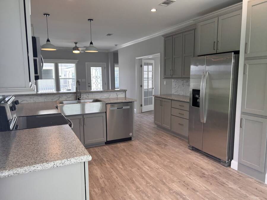 This beautiful 2024 home is built to last with Wind Zone II construction and boasts high-quality materials and craftsmanship throughout. Low-E insulated glass windows are designed to keep you comfortable year-round while being energy-efficient. The exterior includes vinyl lap siding and a 25-year algae-resistant roof for long-lasting reliability. The home also comes equipped with modern amenities like a Whirlpool stainless steel electric range, refrigerator with ice maker, and stylish ceramic tile backsplash in the kitchen. Inside, you'll find spacious rooms with seamless drywall, deluxe cove and baseboard trim, and plenty of closet space with built-in shelving. The bathrooms feature elegant ceramic tile, single-lever faucets, and walk-in shower in the primary bathroom. This home offers the perfect balance of style, function, and durability. Contact us to schedule a tour today!