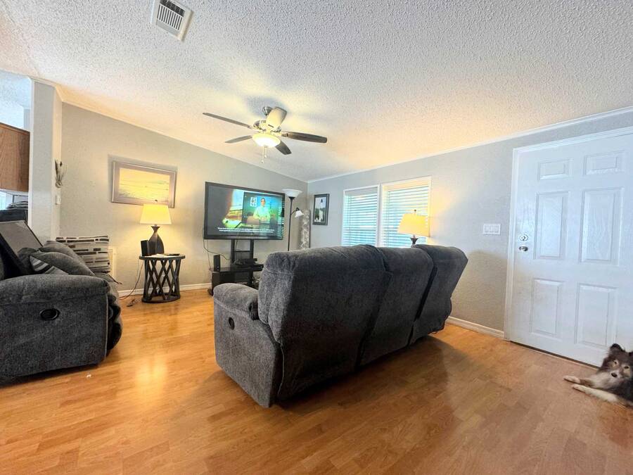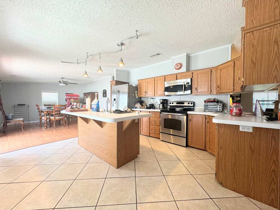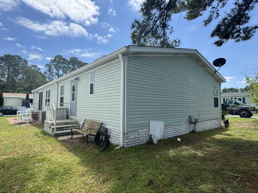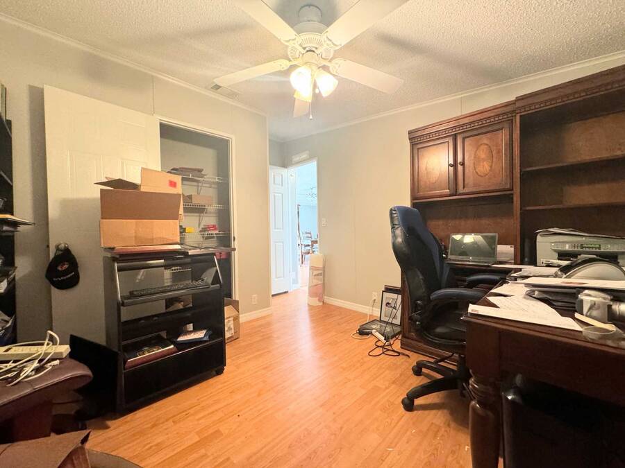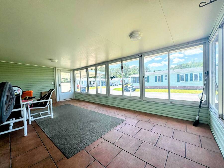 This 2001 Home of Merit features a double car side-by-side parking and a perfect split floor plan. Upon entering the home, you will find an oversized lanai that spans the length of the house (16 x 20) with glass windows and tile flooring. The lanai opens into a spacious living room and dining area, which includes a utility room off the dining room with an extra pantry, washer, and dryer. From the dining room, you can access the kitchen by going around the counter, where you will discover a large center island, perfect for baking cookies with the grandkids. The kitchen is open to the den, providing additional living space. There is a small hallway featuring a linen closet and three doors. To the left, you'll find a guest bedroom; to the right is currently an office that could easily be converted into a third bedroom. Straight ahead is the guest bathroom. Returning to the living room and heading to the left, you will find the master ensuite, which offers ample space for a king-size bed and a spacious closet. The ensuite includes a double vanity, a garden tub, and a shower with a small step. This 1,456 sq. ft. home could be yours today, so call or stop by to check it out!