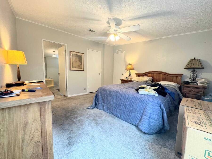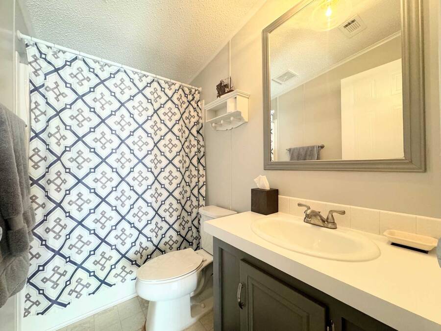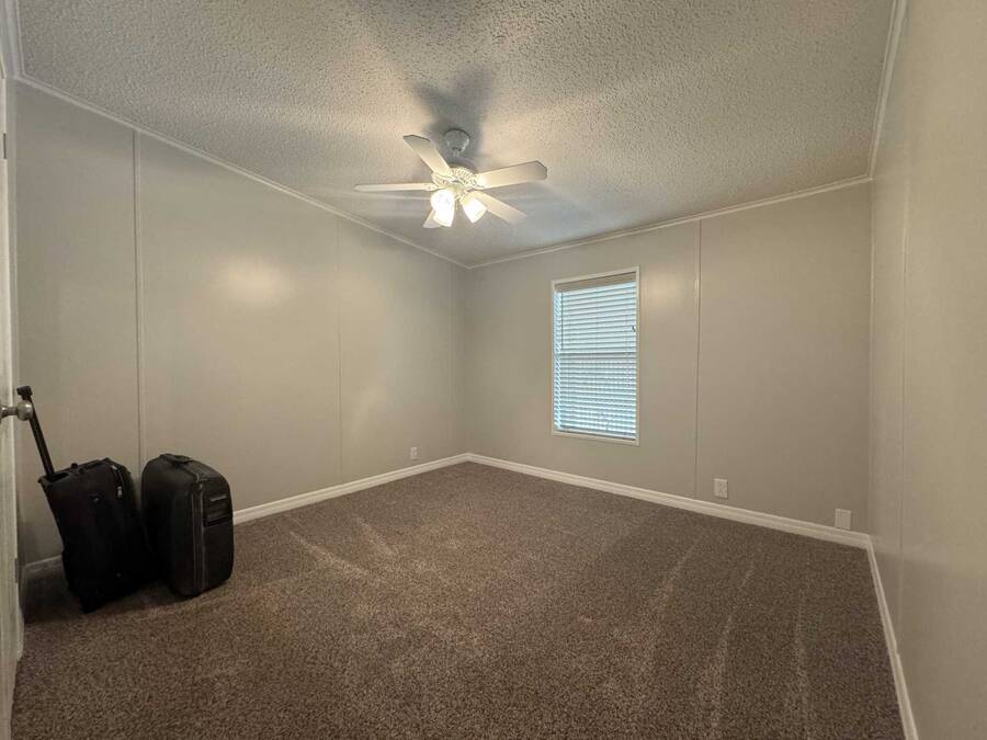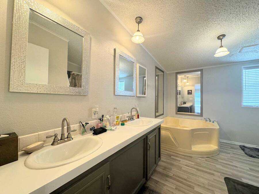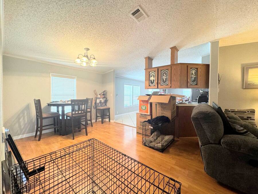 This 2001 Home of Merit features a double car side-by-side parking and a perfect split floor plan. Upon entering the home, you will find an oversized lanai that spans the length of the house (16 x 20) with glass windows and tile flooring. The lanai opens into a spacious living room and dining area, which includes a utility room off the dining room with an extra pantry, washer, and dryer. From the dining room, you can access the kitchen by going around the counter, where you will discover a large center island, perfect for baking cookies with the grandkids. The kitchen is open to the den, providing additional living space. There is a small hallway featuring a linen closet and three doors. To the left, you'll find a guest bedroom; to the right is currently an office that could easily be converted into a third bedroom. Straight ahead is the guest bathroom. Returning to the living room and heading to the left, you will find the master ensuite, which offers ample space for a king-size bed and a spacious closet. The ensuite includes a double vanity, a garden tub, and a shower with a small step. This 1,456 sq. ft. home could be yours today, so call or stop by to check it out!