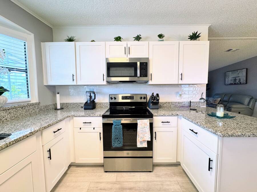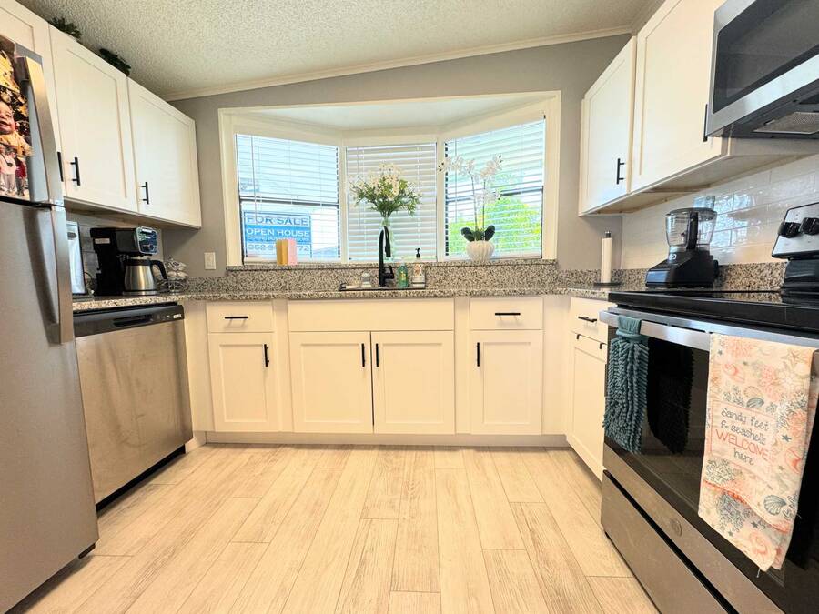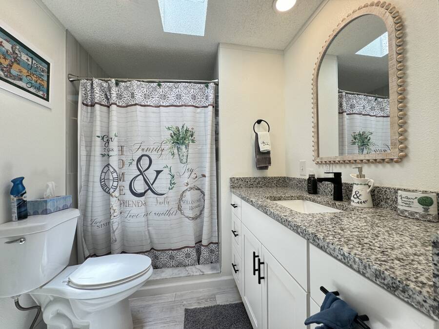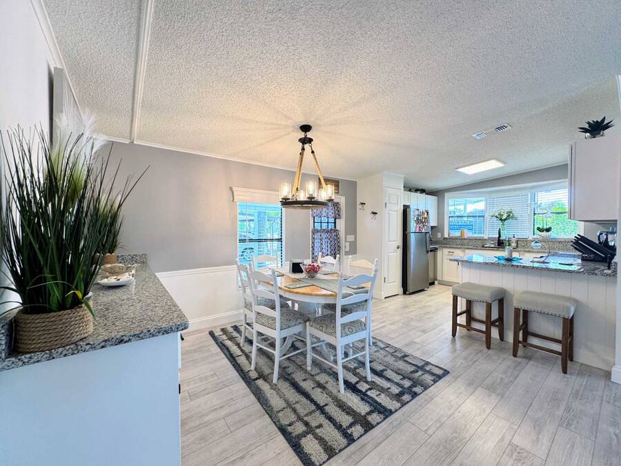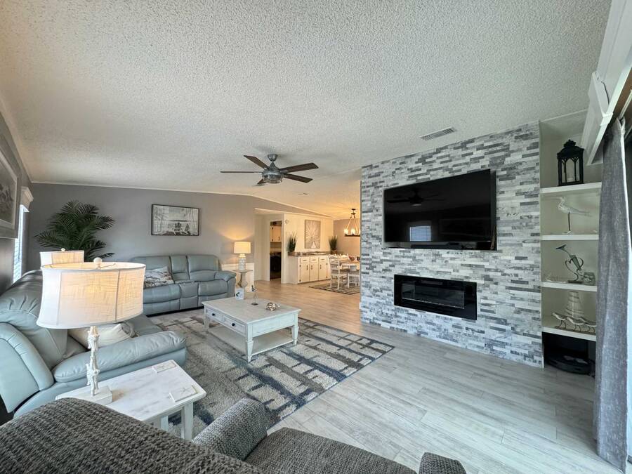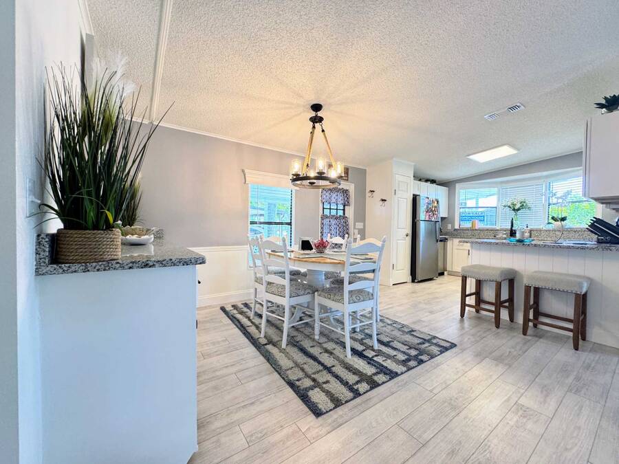 Are you searching for the perfect retirement home? Look no further! This 1,248 sq. ft. residence has been completely renovated and features new flooring, a new roof, new air conditioning, a new water heater, new tile showers, and many other upgrades! As you enter through the carport, you'll be welcomed by a spacious dining and living area, with the kitchen on the left side. Straight ahead is the living room, which boasts a stone fireplace and custom shelving. The living room walls are adorned with wainscoting and have a textured finish. The home includes a full-sized laundry room with new appliances and a Whirlpool package in the kitchen. The hallway offers a convenient storage closet, and the guest bathroom on the right features a six-foot shower that spans the width of the room. Granite finishes are present throughout the home, ensuring it will impress any visitor. The oversized guest room comes with a large walk-in closet. The fabulous master suite includes an ensuite bathroom, a spacious walk-in closet that can accommodate a California king bed, and another six-foot tile shower. There is ample parking space for up to four cars in the driveway, providing plenty of room for entertaining and creating wonderful memories with your neighbors. You won't be disappointed!