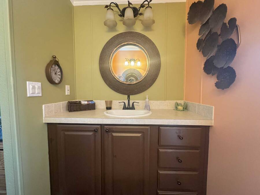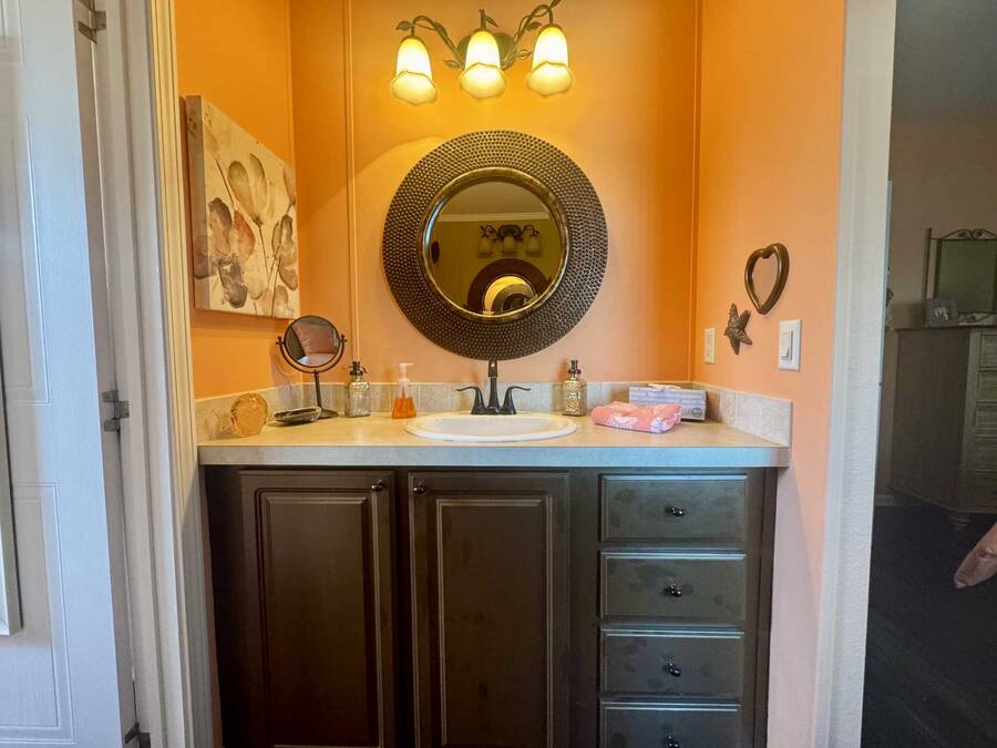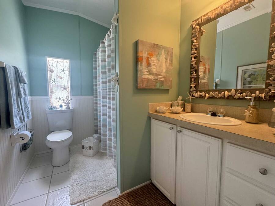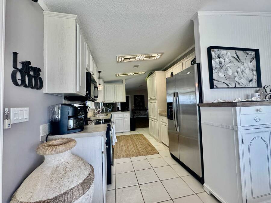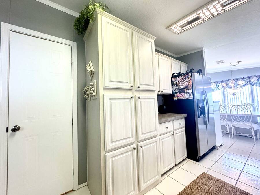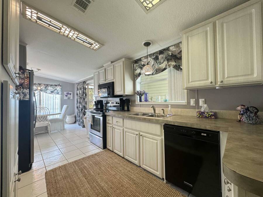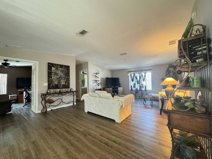 Upon entering, you will find a large, combined dining and living area, to the left of the entryway is the den, often referred to as a ""man cave."" While to the right is the gourmet kitchen, which includes plenty of counter space perfect for baking with the grandkids. Adjacent to the kitchen is the laundry area, along with a generously sized lanai ideal for entertaining. Continuing from the Living room, you will discover the master suite, which features an ensuite bathroom with double vanities and two closets in the main bedroom. On the opposite side of the living room is a small hallway leading to a guest bathroom and bedroom. The roof was installed in April 2024, and the AC unit was replaced in April 2022. With over 1,430 square feet of living space and no home directly behind you, this property offers both spaciousness and privacy. Don't hesitate to reach out to schedule a visit today!