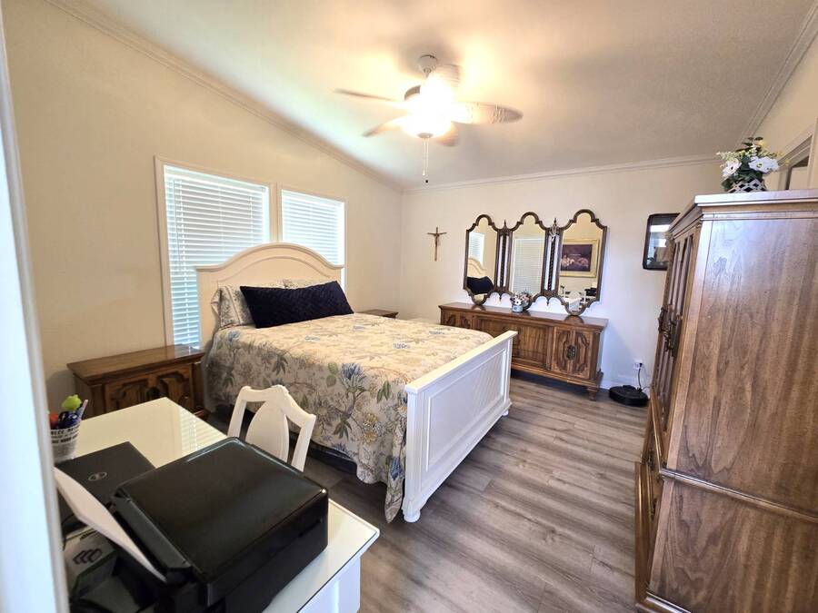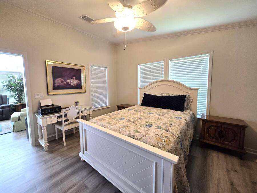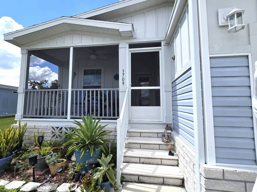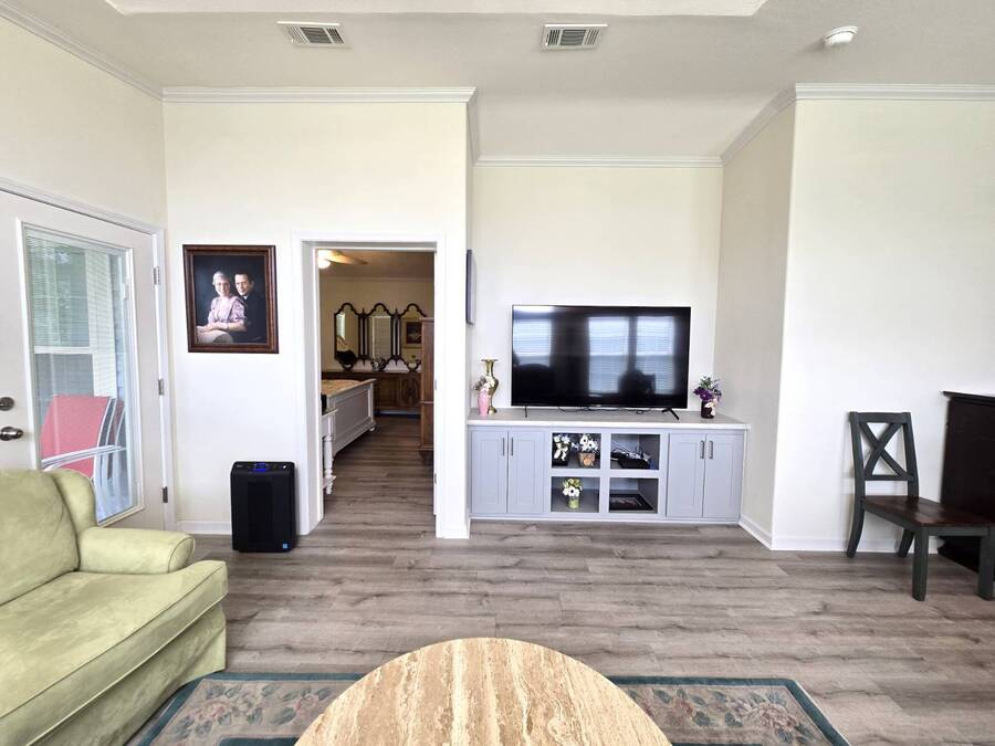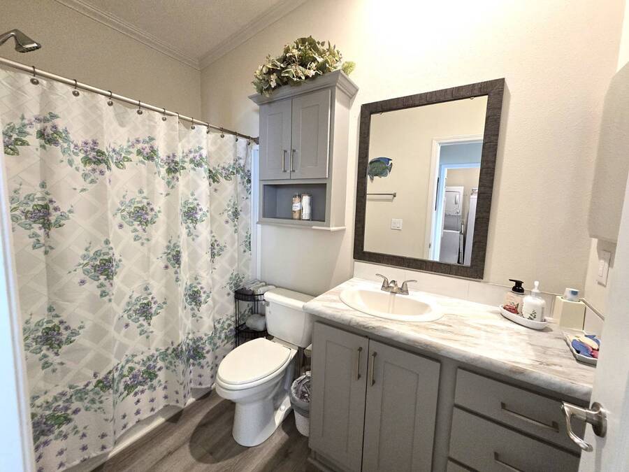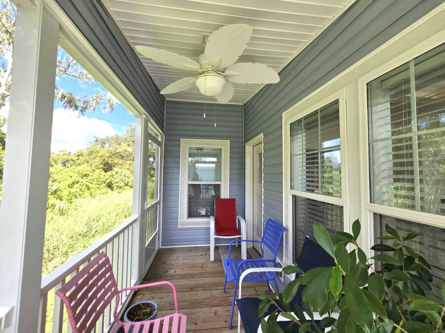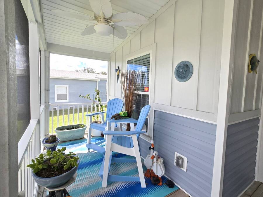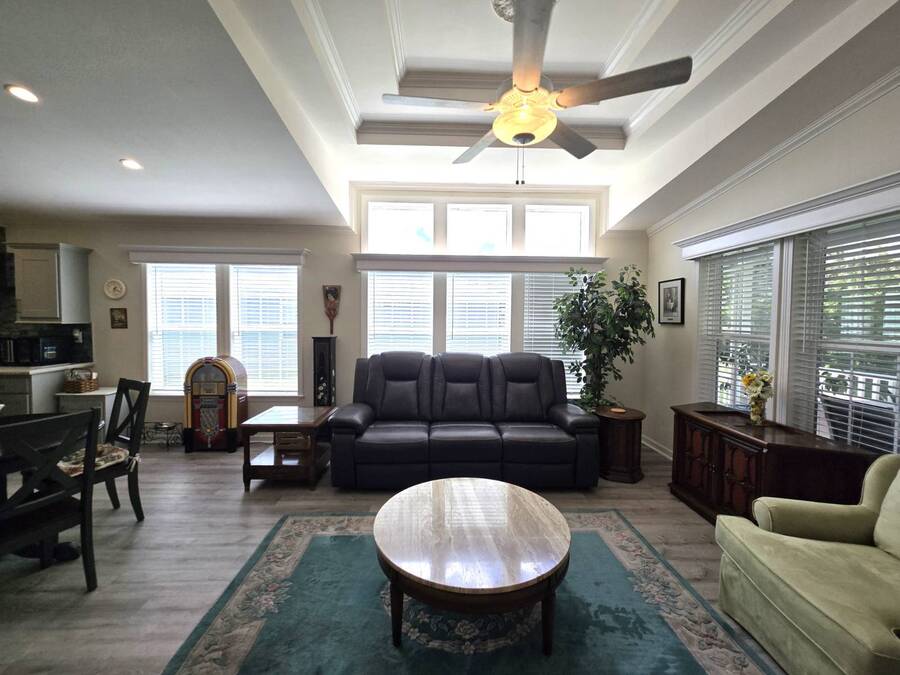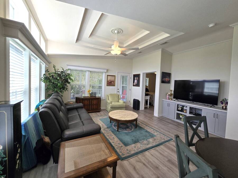 Welcome to this stunning 2022 Champion home, perfectly situated in the newer section of Colony Cove! This 3-bedroom, 2-bathroom gem boasts a 2-vehicle garage, and is loaded with upgrades and unique features that truly set it apart. The kitchen is a showstopper with stainless steel appliances, a stylish apron sink, high-end faucet, sleek glass tile backsplash, and a hood over the stove. You'll love the microwave seamlessly integrated into the cabinetry and the spacious island, ideal for entertaining. Crown molding adds an elegant touch to the kitchen cabinets and continues throughout the home. With vaulted ceilings and beautiful vinyl floors, this space feels expansive and welcoming. The living room is designed to impress with its striking coffered ceiling and large windows that fill the room with natural light. It also features a built-in entertainment center, perfect for your TV, and opens to a private, screened porch overlooking the reserve. This peaceful outdoor area comes with a specially designed screen door for capturing photos and videos of the wildlife. The oversized master bedroom is a bright retreat, complete with an ensuite that features double sinks, wall cabinetry, a tiled walk-in shower with a sliding glass door, and a spacious walk-in closet. Convenience meets style in the indoor laundry room, which includes a stackable washer/dryer, stand-up freezer, and shelving for extra storage. Both guest bedrooms offer ample closet space, and the guest bathroom is well-appointed with a tub/shower combo and vanity with additional storage. The home's curb appeal is enhanced by a beautiful etched glass front door and a charming covered front porch, perfect for enjoying your morning coffee. The exterior landscaping is beautifully maintained, and the driveway comfortably fits two vehicles. This home is move-in ready-just drop your bags and start enjoying the incredible amenities, including access to six heated community pools! This is more than a house, it's a welcoming, worry-free place to call home. Colony Cove is an age qualified (55+) five-star resort community of manufactured/mobile homes. The "Cove" boasts 5 clubhouses, 6 heated pools, a riverfront pavilion, and private fishing pier, a private marina, a fenced dog park (very pet friendly), tennis, shuffleboard, new pickleball courts, 2 new fitness rooms, 24-hour patrol, clubs of every interest, and much more. There are daily planned activities throughout the park. Bottom line, if you get bored here, it's your own fault! The lot rent in Colony Cove is based on the home's location. Not only does the monthly rent cover all of the amenities of the community listed above, but it also covers almost all other monthly expenses such as water, sewer, and trash pickup. All property taxes, lawn maintenance...pretty much every monthly expense except electricity and internet. All listing information given to us is considered appropriate and reliable but we always recommend home inspections by independent companies who have a background and thorough understanding of manufactured homes. We cannot guarantee the accuracy of the information given to us or the home's condition. Lot rents are determined by the community office, not our company.