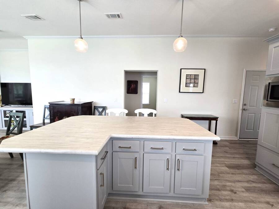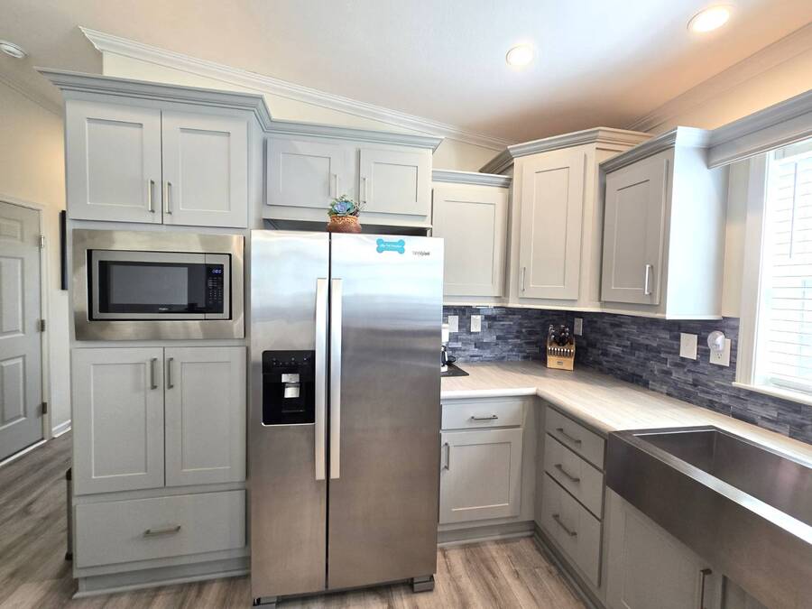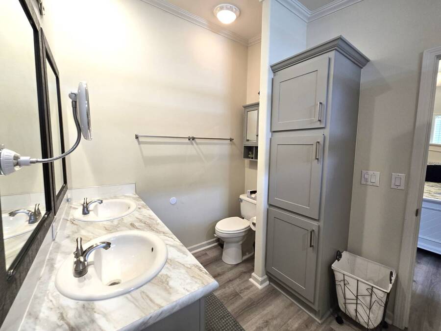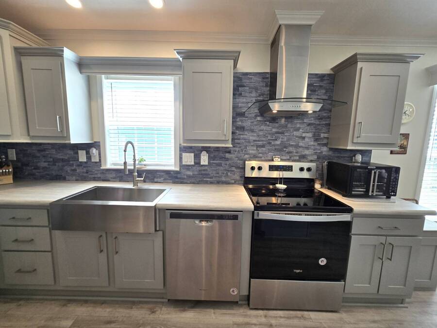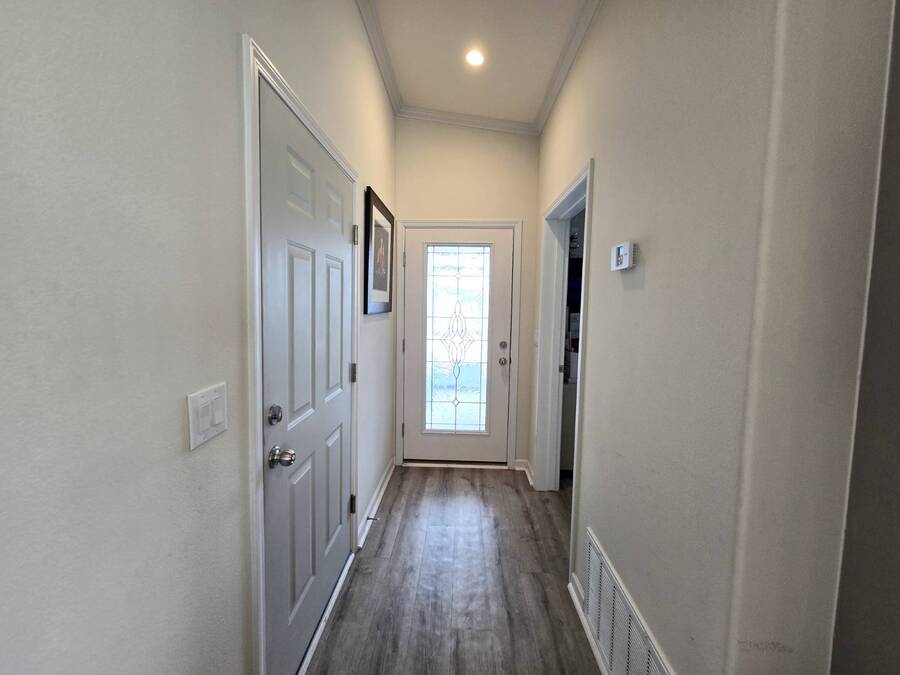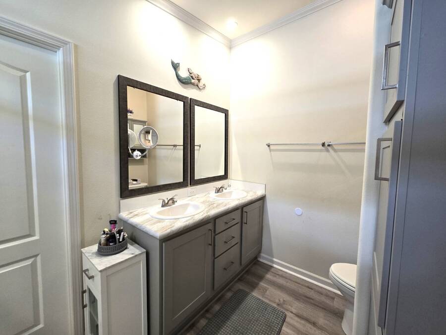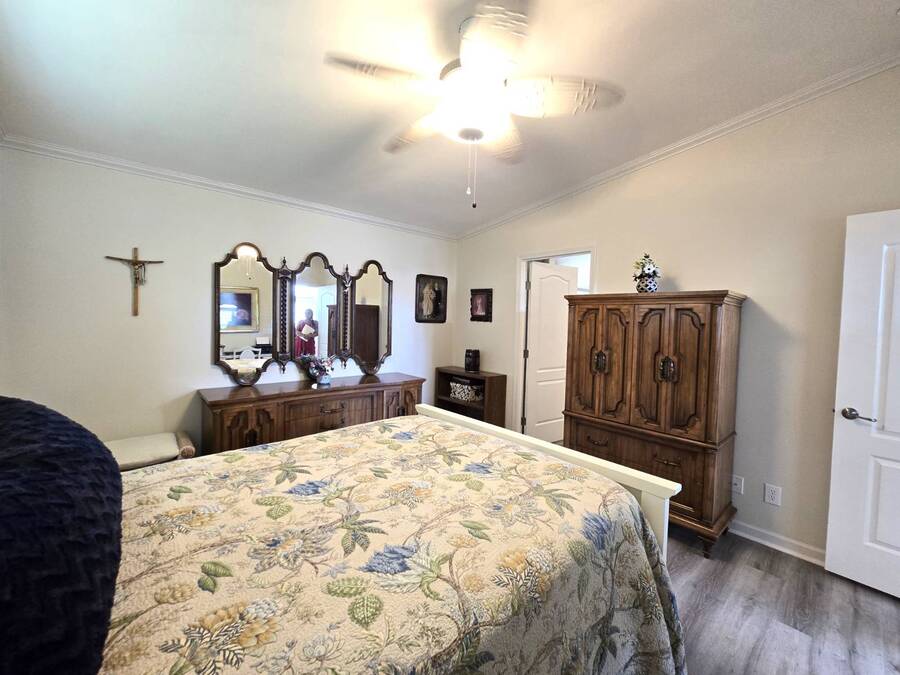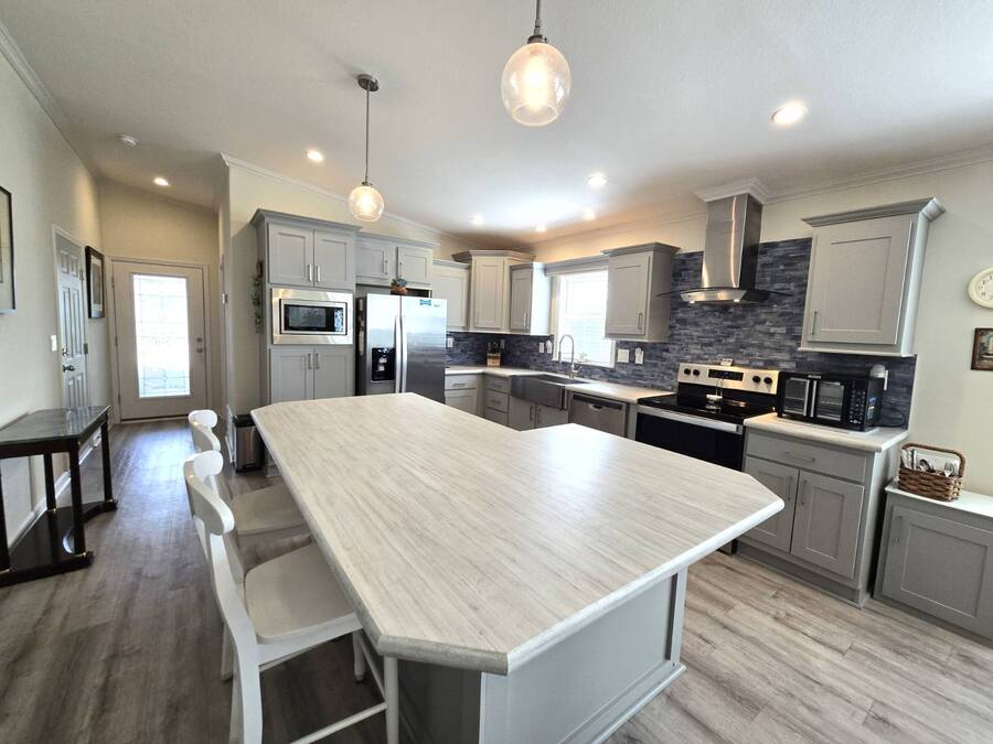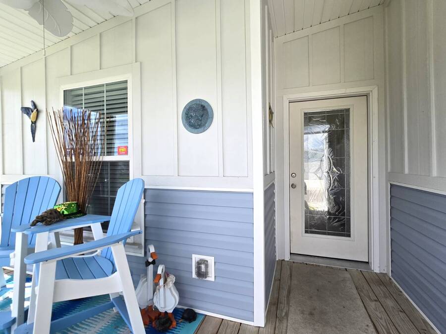 Welcome to this stunning 2022 Champion home, perfectly situated in the newer section of Colony Cove! This 3-bedroom, 2-bathroom gem boasts a 2-vehicle garage, and is loaded with upgrades and unique features that truly set it apart. The kitchen is a showstopper with stainless steel appliances, a stylish apron sink, high-end faucet, sleek glass tile backsplash, and a hood over the stove. You'll love the microwave seamlessly integrated into the cabinetry and the spacious island, ideal for entertaining. Crown molding adds an elegant touch to the kitchen cabinets and continues throughout the home. With vaulted ceilings and beautiful vinyl floors, this space feels expansive and welcoming. The living room is designed to impress with its striking coffered ceiling and large windows that fill the room with natural light. It also features a built-in entertainment center, perfect for your TV, and opens to a private, screened porch overlooking the reserve. This peaceful outdoor area comes with a specially designed screen door for capturing photos and videos of the wildlife. The oversized master bedroom is a bright retreat, complete with an ensuite that features double sinks, wall cabinetry, a tiled walk-in shower with a sliding glass door, and a spacious walk-in closet. Convenience meets style in the indoor laundry room, which includes a stackable washer/dryer, stand-up freezer, and shelving for extra storage. Both guest bedrooms offer ample closet space, and the guest bathroom is well-appointed with a tub/shower combo and vanity with additional storage. The home's curb appeal is enhanced by a beautiful etched glass front door and a charming covered front porch, perfect for enjoying your morning coffee. The exterior landscaping is beautifully maintained, and the driveway comfortably fits two vehicles. This home is move-in ready-just drop your bags and start enjoying the incredible amenities, including access to six heated community pools! This is more than a house, it's a welcoming, worry-free place to call home. Colony Cove is an age qualified (55+) five-star resort community of manufactured/mobile homes. The "Cove" boasts 5 clubhouses, 6 heated pools, a riverfront pavilion, and private fishing pier, a private marina, a fenced dog park (very pet friendly), tennis, shuffleboard, new pickleball courts, 2 new fitness rooms, 24-hour patrol, clubs of every interest, and much more. There are daily planned activities throughout the park. Bottom line, if you get bored here, it's your own fault! The lot rent in Colony Cove is based on the home's location. Not only does the monthly rent cover all of the amenities of the community listed above, but it also covers almost all other monthly expenses such as water, sewer, and trash pickup. All property taxes, lawn maintenance...pretty much every monthly expense except electricity and internet. All listing information given to us is considered appropriate and reliable but we always recommend home inspections by independent companies who have a background and thorough understanding of manufactured homes. We cannot guarantee the accuracy of the information given to us or the home's condition. Lot rents are determined by the community office, not our company.