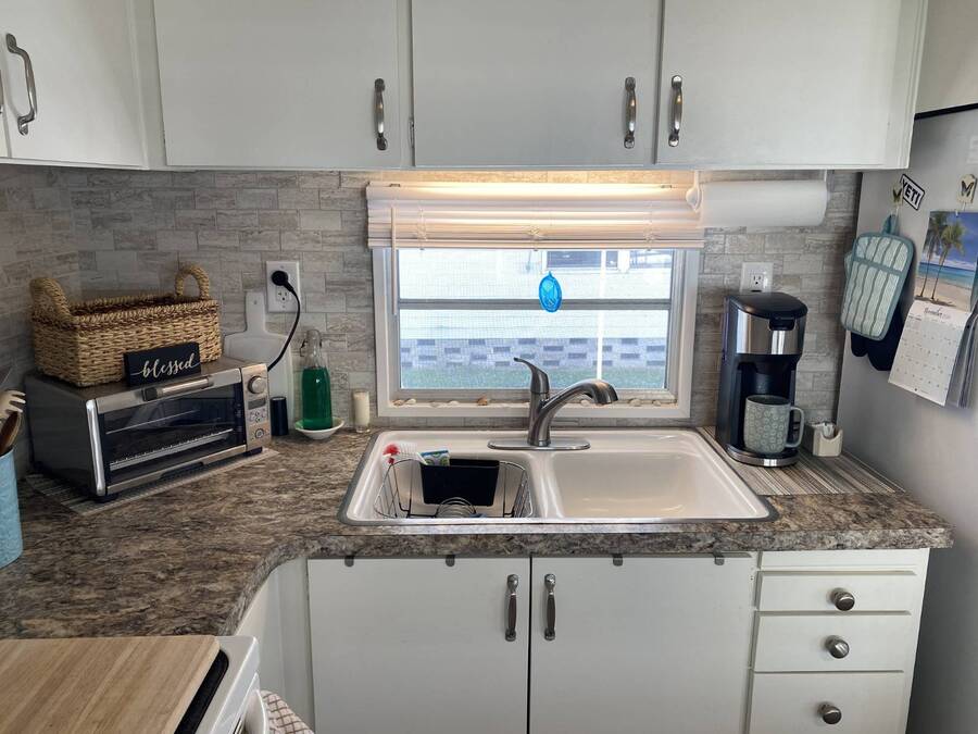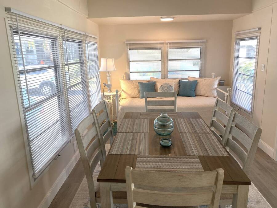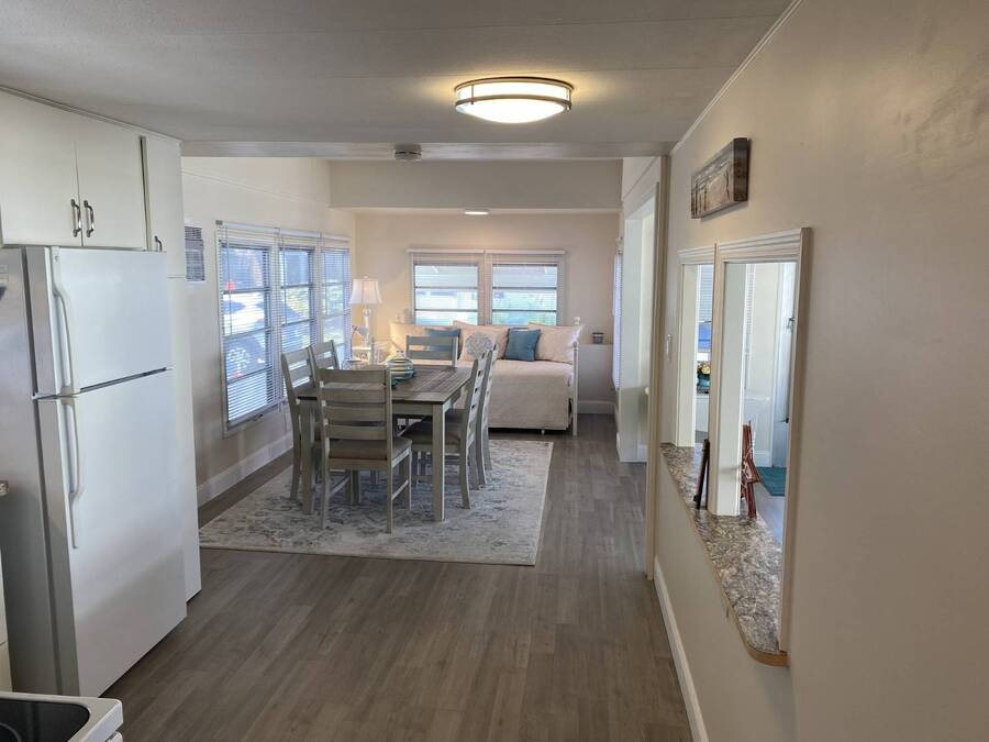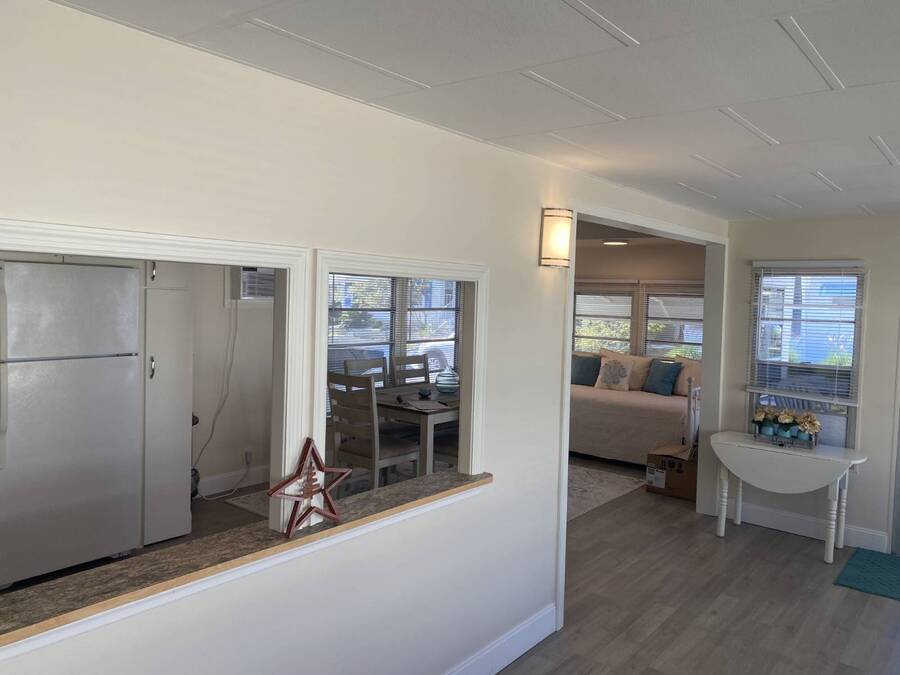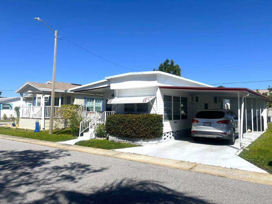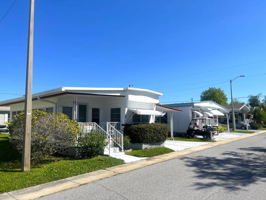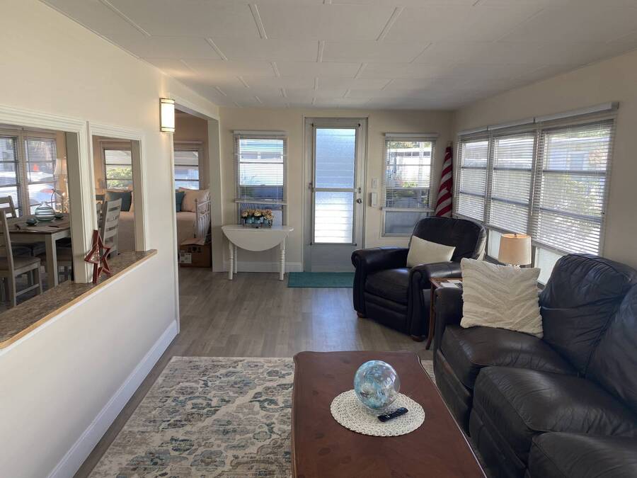 This beautifully updated, recently power-washed, 1-bedroom, 1-bath, fully furnished home is located in the premium resort community of Lake Haven, a 55-plus community in delightful Dunedin, FL. The home has over 800 sq. ft., with partial drywall walls, updated laminate floors, an updated bathroom with a walk-in shower, modern furniture, new blinds throughout, and coastal canvas art. The add-on living area is 10' x 25' with updated laminate floors, a leather sofa and leather recliner chair, new blinds, and lots of windows, which make the space nice and bright. The dining area has a newer high-powered built-in A/C unit and a dining room table by Ashley with seating for six. Right off the dining area is a trundle daybed that can sleep two guests comfortably. The kitchen has a newer refrigerator and full-sized electric stove, updated countertops, tiled backsplash, a built-in microwave, and plenty of cabinets. The primary bedroom has plenty of closet and storage space, an IKEA queen bed, and a newer window A/C unit. The Dyson heat fan keeps the space nice and warm. The renovated bathroom has a new walk-in shower, toilet, vanity, and updated coastal laminate floors. The home has a rebuilt covered front porch, an attached shed with a newer full-sized washer and dryer, and the carport can accommodate two cars. The home has recently been Power-washed. The home is only a short walk to the social clubhouse, pool, and Tiki Island. Start living the Florida lifestyle in this turnkey updated home while enjoying the Gulf breeze. Lake Haven is a beautiful 55-plus premium community located in delightful Dunedin, FL. Amenities include three pools, a clubhouse, gym, shuffleboard, horseshoes, and fishing. Lot rent of $1,200.00 per month includes water, sewer, trash, lawn care, and all the park amenities. Pet-friendly community - 2 pets under 30 lbs. -- CASH ONLY --