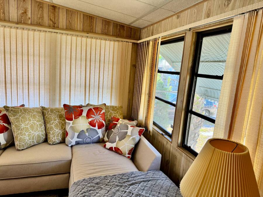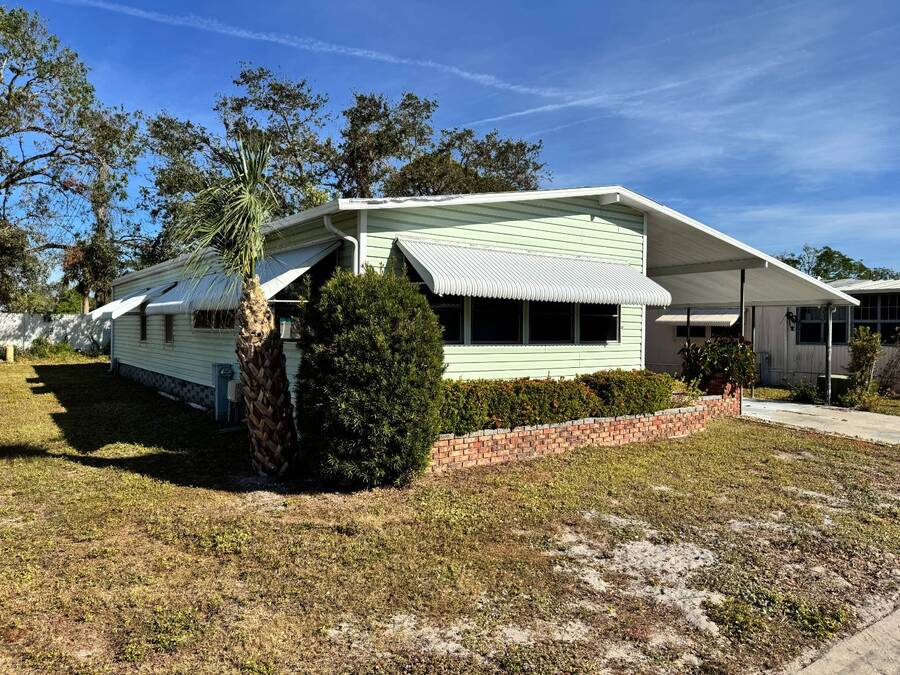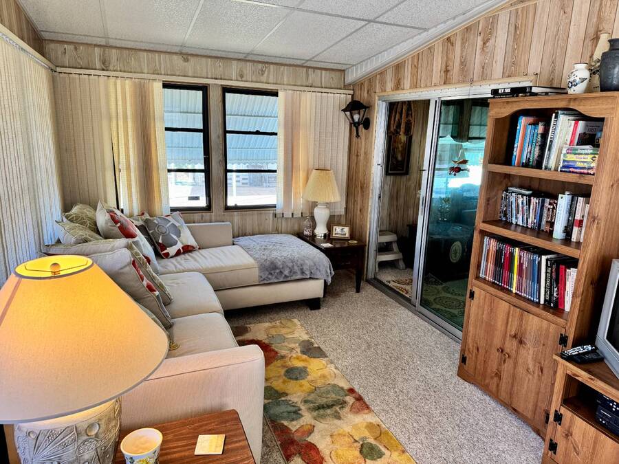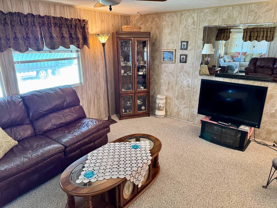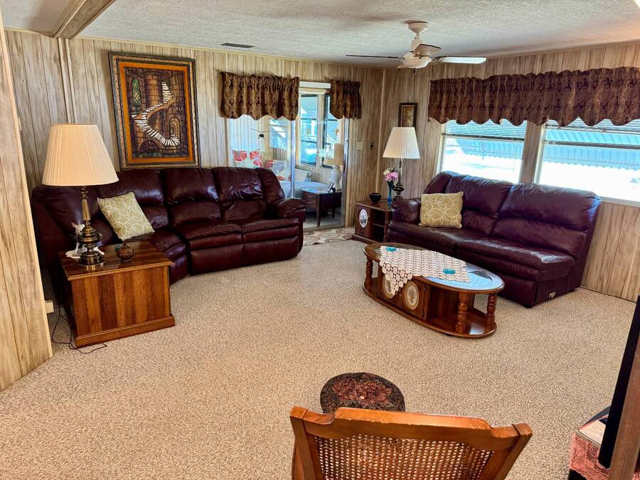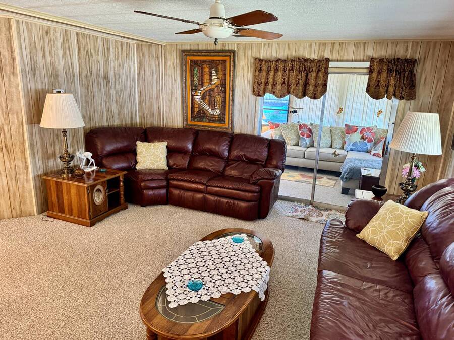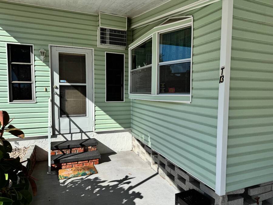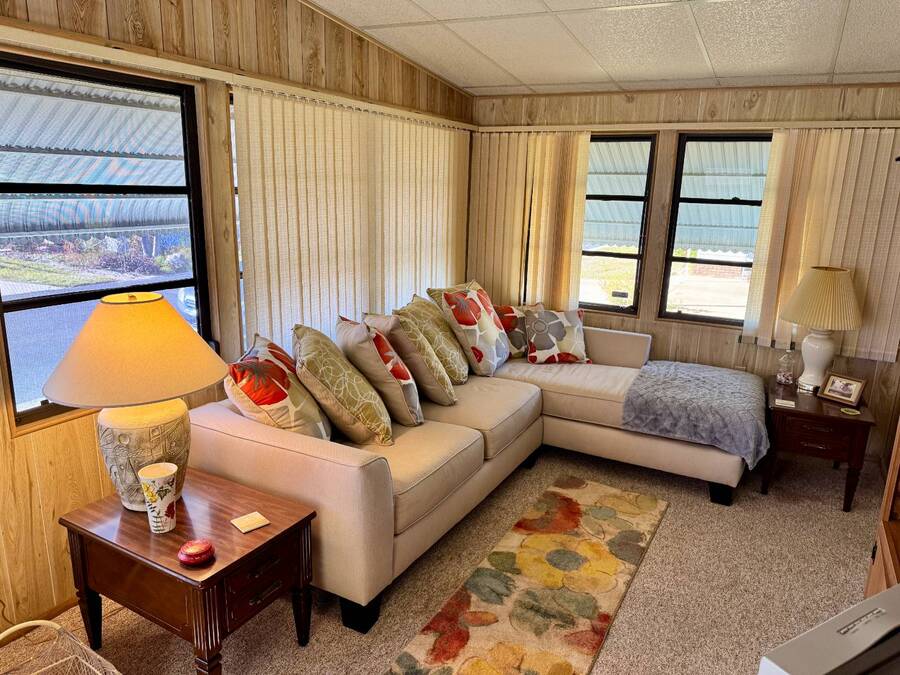 Welcome to your dream home! Situated on a desirable perimeter lot for added privacy, this beautifully maintained 1981 double-wide offers 2 bedrooms and 2 bathrooms with thoughtful features throughout. The fully-enclosed lanai with glass windows, screens, and a wall-mounted air conditioning unit creates an additional versatile year-round living space, perfect for relaxing or entertaining. Inside, the open floor plan boasts a large living room that flows seamlessly into the kitchen and dining area. The dining room features built-in storage, ideal for displaying your treasures or keeping everything organized. The kitchen is a cook's delight, complete with bay windows above the sink, a convenient breakfast bar, dishwasher, and a pantry for ample storage. A built-in desk and storage area in the hall provides the perfect spot for a home office or organizing daily essentials. The indoor laundry room adds convenience with even more storage options. The large guest bedroom features a walk-in closet and easy access to a full bathroom with a tub-shower combo. The primary suite, spanning the full width of the home, is a tranquil retreat with floor-to-ceiling bay windows, roll-down shutters, and two spacious closets. The suite also includes a built-in vanity and an en-suite bathroom with abundant storage and a step-in shower. Its perimeter lot location on a cul-de-sac road offers added privacy and space, this home is the perfect combination of functionality, charm, and comfort. This home is centrally located in Bradenton, just a few miles north of the Sarasota Bradenton International airport and about 15 minutes to Gulf Coast beaches. Bayshore Windmill Village is a gated, land lease community offering resort-style living for active adults. Normally a 55+ community, it is now welcoming residents 45+ for a limited time. Enjoy a clubhouse, swimming pool, shuffleboard, library, pool table, and a calendar full of organized activities. Lot rent is $1,173 and includes trash, tax pass-through, lawn maintenance, and use of all park amenities. Now pet-friendly-bring up to two pets, totaling 40 lbs. Subleasing is permitted with age and background application approval, at the discretion of management. AGENT MUST SHOW BY APPOINTMENT 603 63rd Ave W Lot T-13 (Park Street- Avenue T West) Bradenton, FL 34207