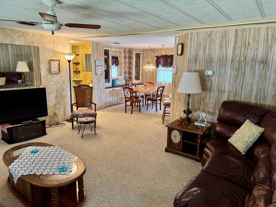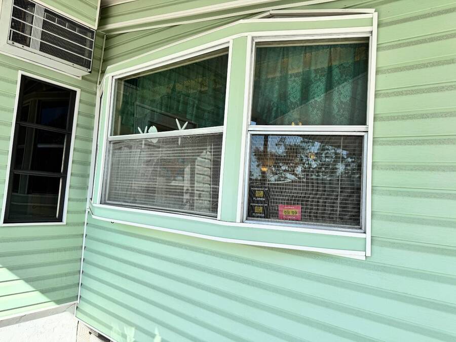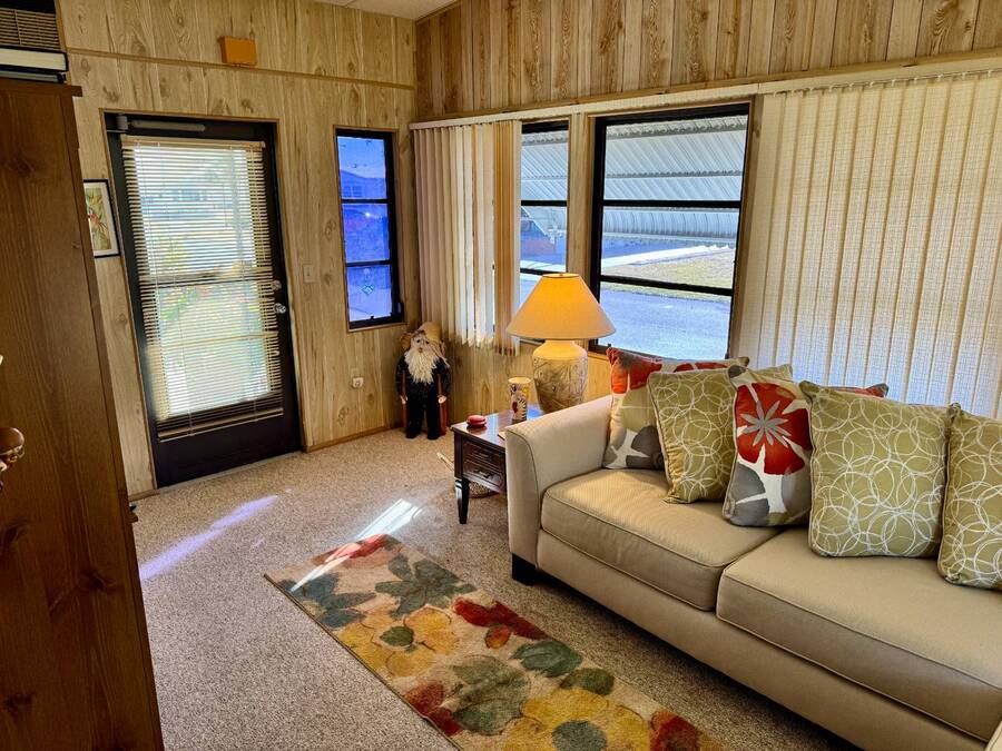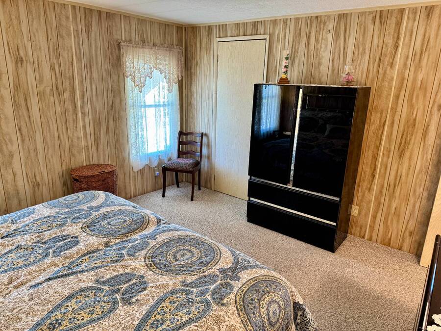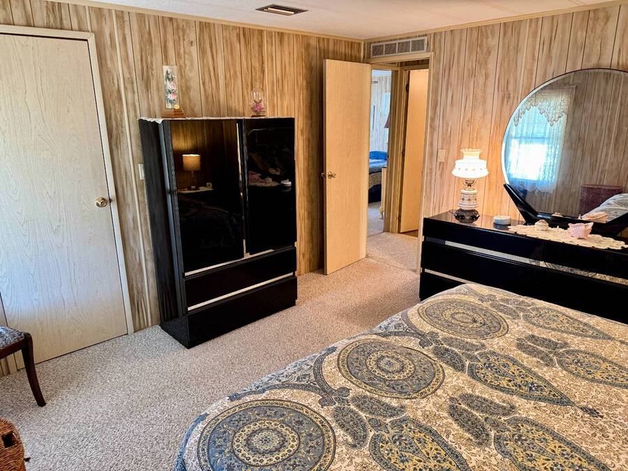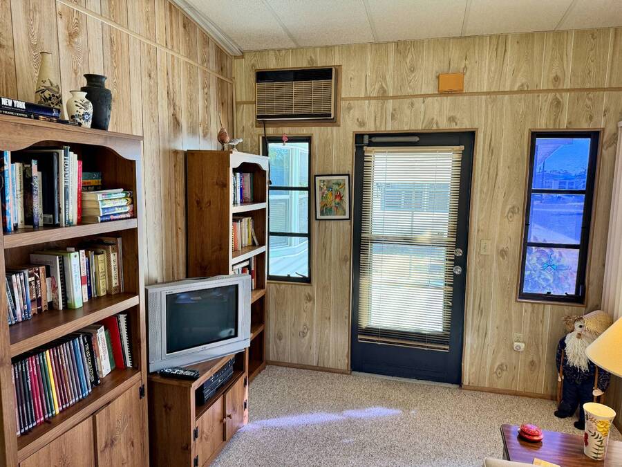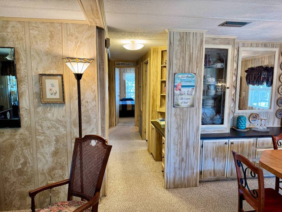 Welcome to your dream home! Situated on a desirable perimeter lot for added privacy, this beautifully maintained 1981 double-wide offers 2 bedrooms and 2 bathrooms with thoughtful features throughout. The fully-enclosed lanai with glass windows, screens, and a wall-mounted air conditioning unit creates an additional versatile year-round living space, perfect for relaxing or entertaining. Inside, the open floor plan boasts a large living room that flows seamlessly into the kitchen and dining area. The dining room features built-in storage, ideal for displaying your treasures or keeping everything organized. The kitchen is a cook's delight, complete with bay windows above the sink, a convenient breakfast bar, dishwasher, and a pantry for ample storage. A built-in desk and storage area in the hall provides the perfect spot for a home office or organizing daily essentials. The indoor laundry room adds convenience with even more storage options. The large guest bedroom features a walk-in closet and easy access to a full bathroom with a tub-shower combo. The primary suite, spanning the full width of the home, is a tranquil retreat with floor-to-ceiling bay windows, roll-down shutters, and two spacious closets. The suite also includes a built-in vanity and an en-suite bathroom with abundant storage and a step-in shower. Its perimeter lot location on a cul-de-sac road offers added privacy and space, this home is the perfect combination of functionality, charm, and comfort. This home is centrally located in Bradenton, just a few miles north of the Sarasota Bradenton International airport and about 15 minutes to Gulf Coast beaches. Bayshore Windmill Village is a gated, land lease community offering resort-style living for active adults. Normally a 55+ community, it is now welcoming residents 45+ for a limited time. Enjoy a clubhouse, swimming pool, shuffleboard, library, pool table, and a calendar full of organized activities. Lot rent is $1,173 and includes trash, tax pass-through, lawn maintenance, and use of all park amenities. Now pet-friendly-bring up to two pets, totaling 40 lbs. Subleasing is permitted with age and background application approval, at the discretion of management. AGENT MUST SHOW BY APPOINTMENT 603 63rd Ave W Lot T-13 (Park Street- Avenue T West) Bradenton, FL 34207