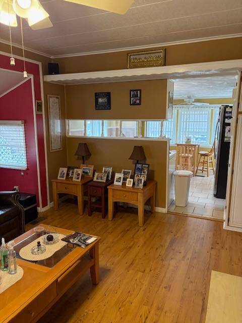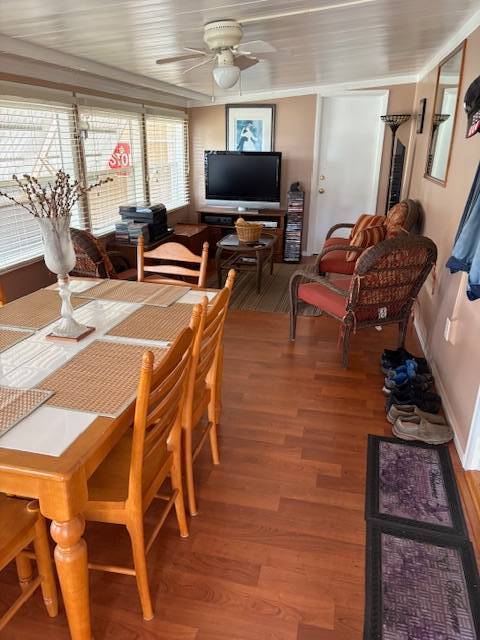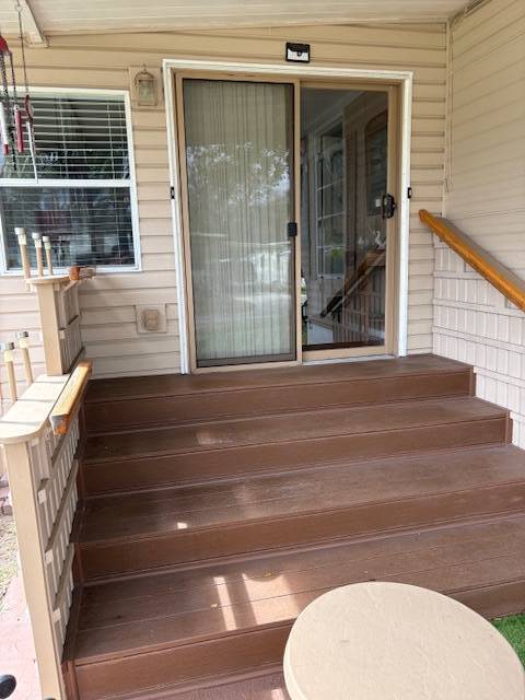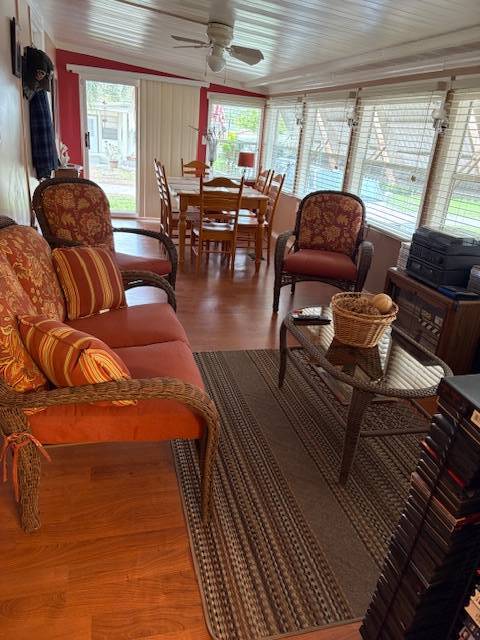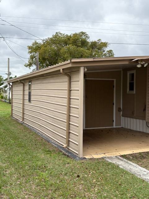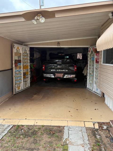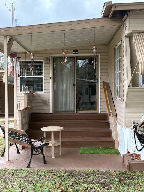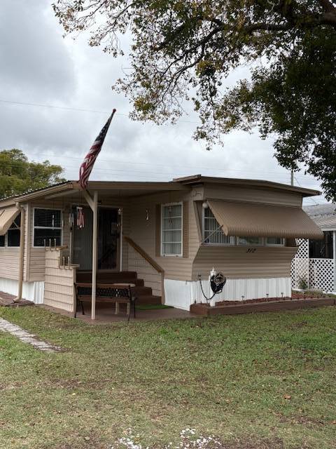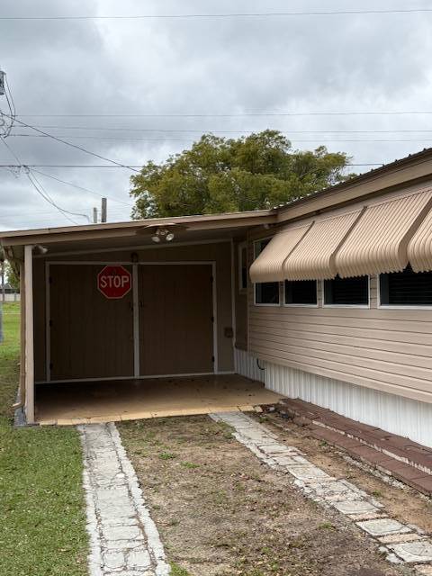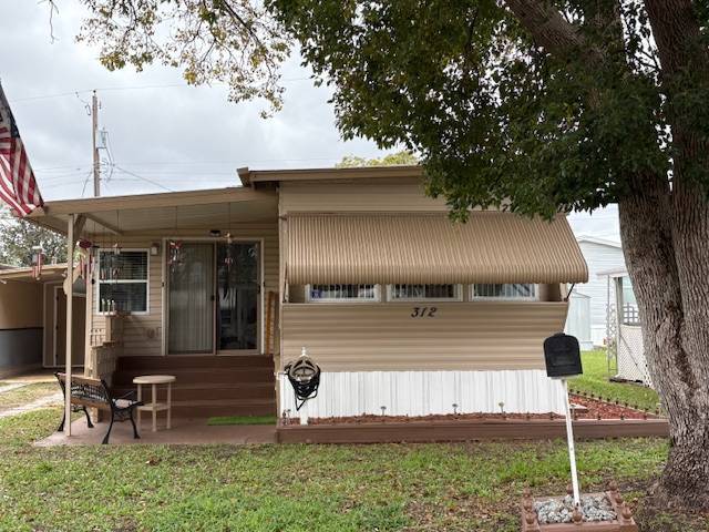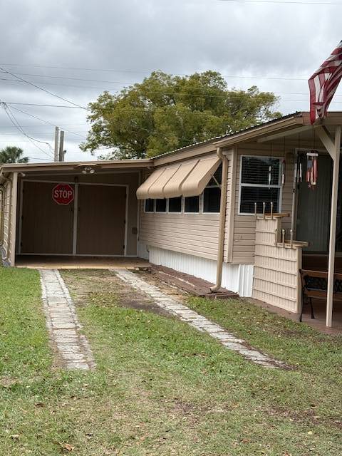 Extremely well maintained 2 bedrooms, 2 bath, with inside laundry and a nearly 500 square foot workshop/garage. Yes, you can park your vehicle inside! This light and bright home includes five ceiling fans and a newer a/c unit. Tile or vinyl are in every room. No carpet here! The 300 square foot, air-conditioned Florida room offers additional space for entertaining, dining, relaxing. game playing, etc. Spacious living room, kitchen, bedrooms, and bathrooms. There is a brand new refrigerator! The washer and dryer remain with the home. The front entry steps are upgraded to no maintenance composite deck boards and there are attached hurricane shutters. Multiple furnishings may remain with the home. Included in the lot rent are water, sewer, trash, and lawn maintenance. This charming 55+ community offers a clubhouse for social events, billiards, shuffleboard, on site laundry facilities, storage, and a bark park. Close to many options for shopping, dining, and entertainment. Make this your new home home!