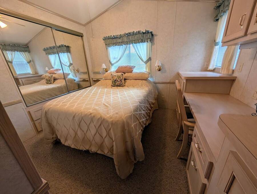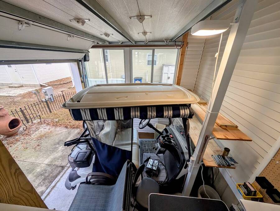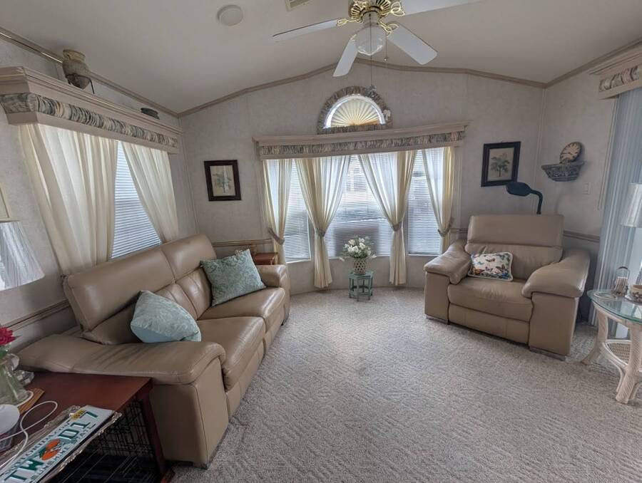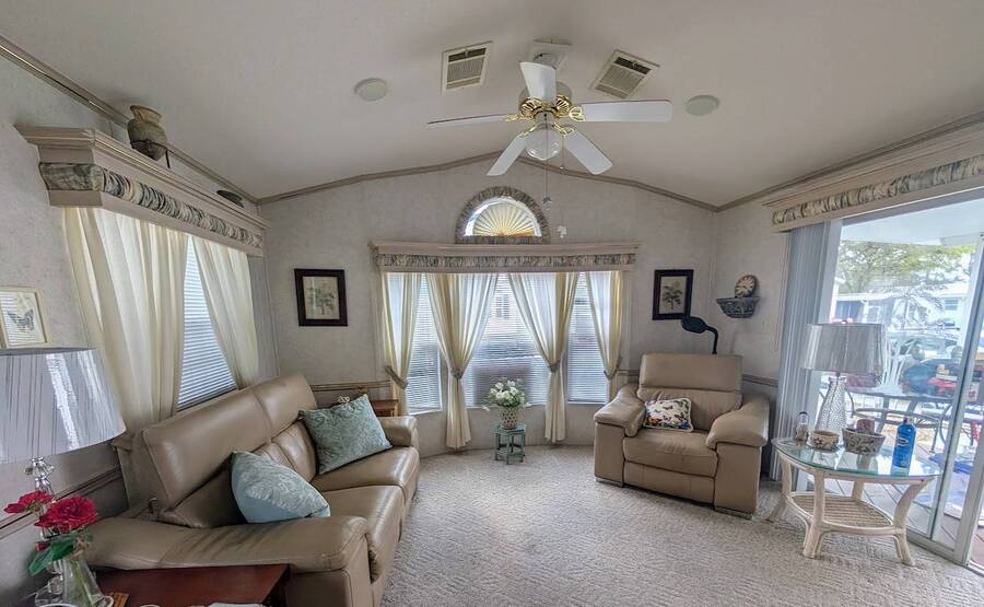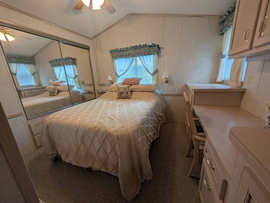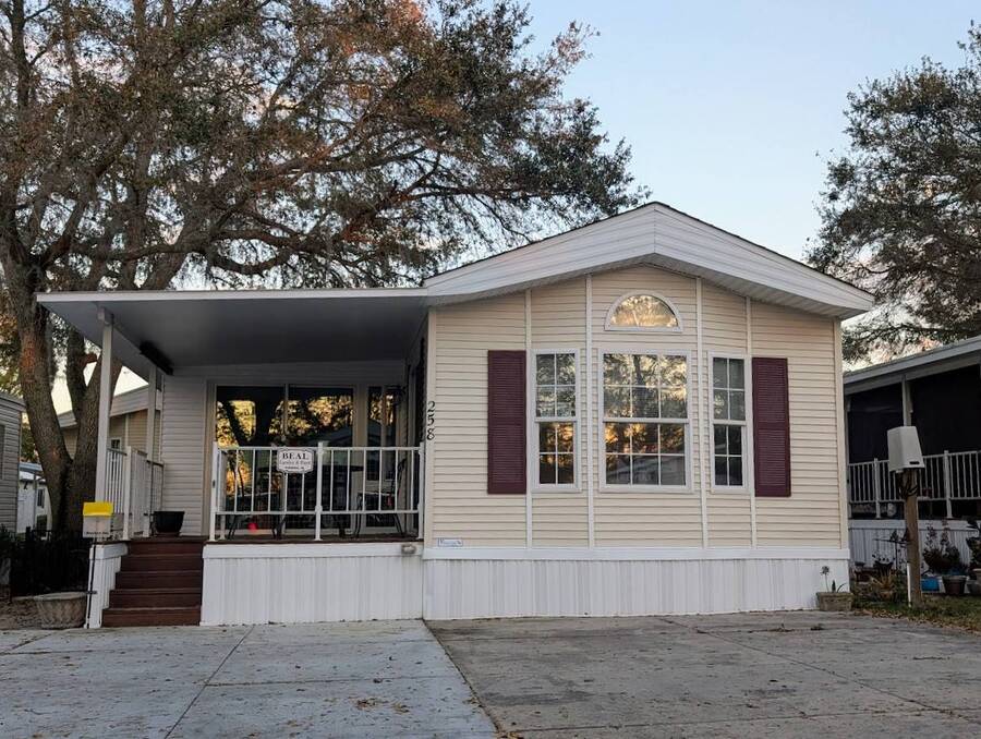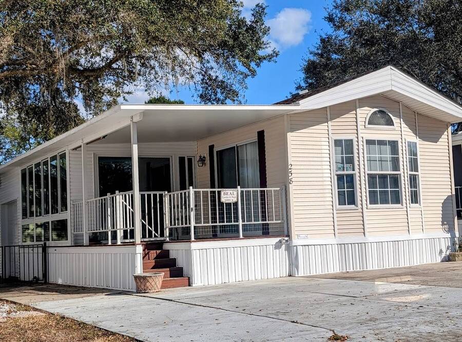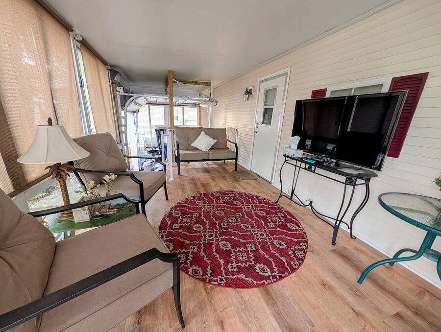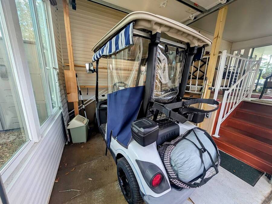 Not a 55+ community! Major Price reduction. You'll want to consider this one when you are considering a winter home in Florida or a forever home getting ready for retirement. This Unit has a golf cart garage and the golf cart inside (with new batteries in 2025) is included too. this turn-key Unit comes furnished, all you have to do is bring your 'personals'. An all in one washer/dryer Unit, a pantry, ceiling fans, volume ceilings, a dining area, a coffee bar, and a site built addition is a 4 season (ducted heat and air) Florida room with low E slinding glass windows and a sliding glass door to the covered country front porch. The bayed windows expand the living and dining rooms, sliding glassed doors from the living room to the covered front porch and a gorgeous glassed in sunroom. There's also a small fenced area for your pet and a garden shed for outdoor storage. The golf cart garage has a doggie door to the yard and there's an Electric car charger for your electric car in the future. The primary bedroom is located privately at the back of the Unit. The bathroom is located in the center of the Unit. The kitchen is a mini chefs delight with ample cabinet storage and there's a dishwasher! The golf cart garage is conditioned and has doggie bathing area. Under the 4 season Florida room is lots of storage including storage for the hide a bed for guests.. You won't want to miss seeing this great Unit. It's 14' wide and has smooth ceilings and ample parking for you and your guests.