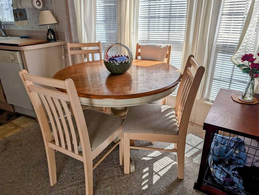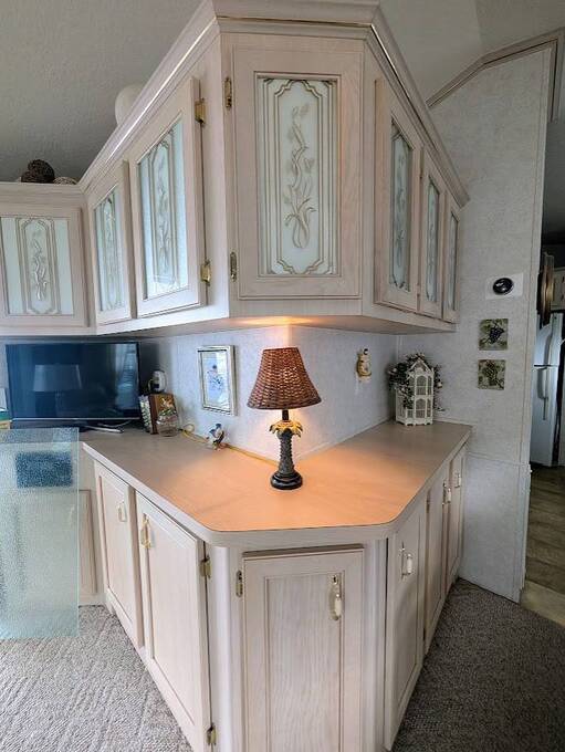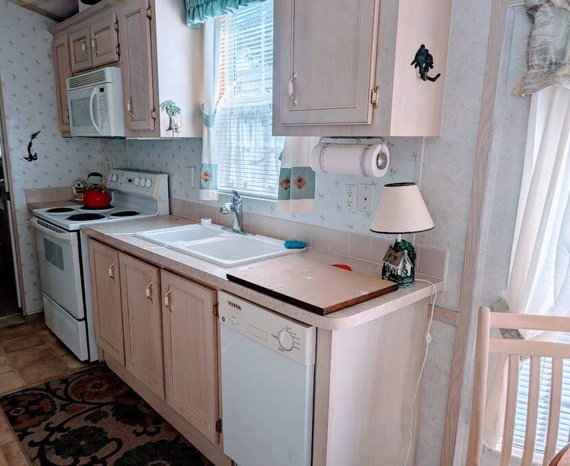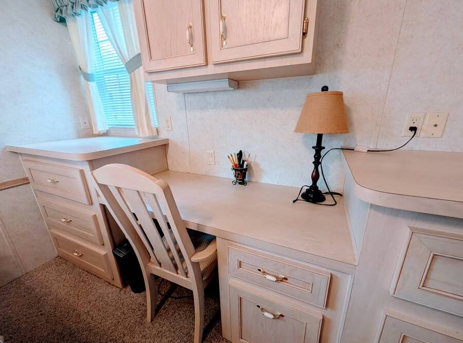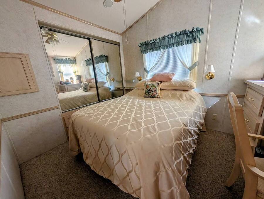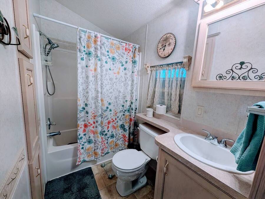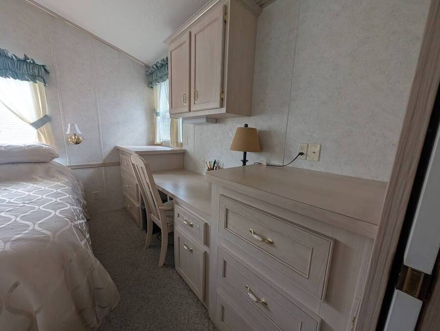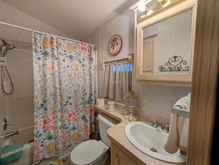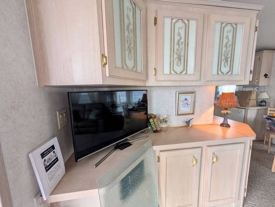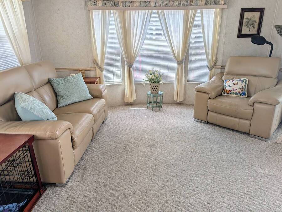 Not a 55+ community! Major Price reduction. You'll want to consider this one when you are considering a winter home in Florida or a forever home getting ready for retirement. This Unit has a golf cart garage and the golf cart inside (with new batteries in 2025) is included too. this turn-key Unit comes furnished, all you have to do is bring your 'personals'. An all in one washer/dryer Unit, a pantry, ceiling fans, volume ceilings, a dining area, a coffee bar, and a site built addition is a 4 season (ducted heat and air) Florida room with low E slinding glass windows and a sliding glass door to the covered country front porch. The bayed windows expand the living and dining rooms, sliding glassed doors from the living room to the covered front porch and a gorgeous glassed in sunroom. There's also a small fenced area for your pet and a garden shed for outdoor storage. The golf cart garage has a doggie door to the yard and there's an Electric car charger for your electric car in the future. The primary bedroom is located privately at the back of the Unit. The bathroom is located in the center of the Unit. The kitchen is a mini chefs delight with ample cabinet storage and there's a dishwasher! The golf cart garage is conditioned and has doggie bathing area. Under the 4 season Florida room is lots of storage including storage for the hide a bed for guests.. You won't want to miss seeing this great Unit. It's 14' wide and has smooth ceilings and ample parking for you and your guests.