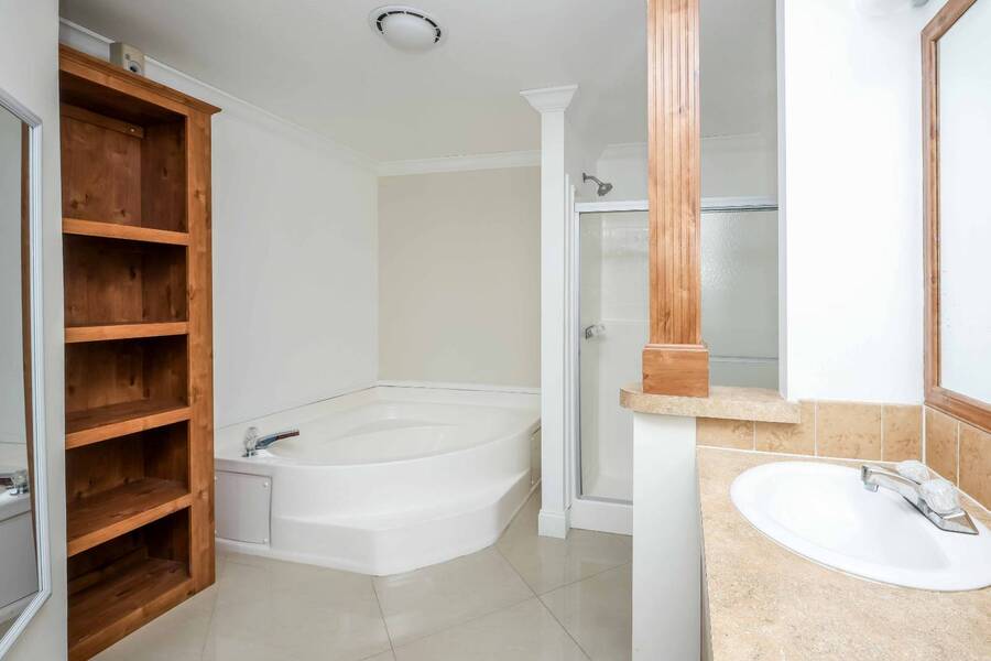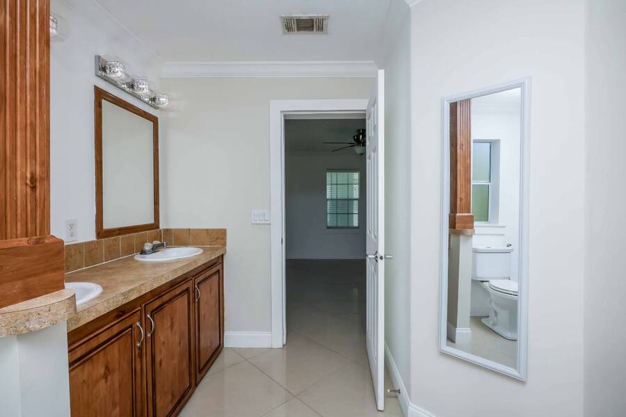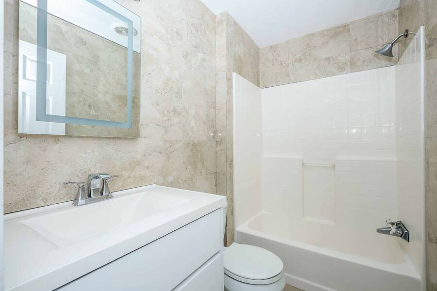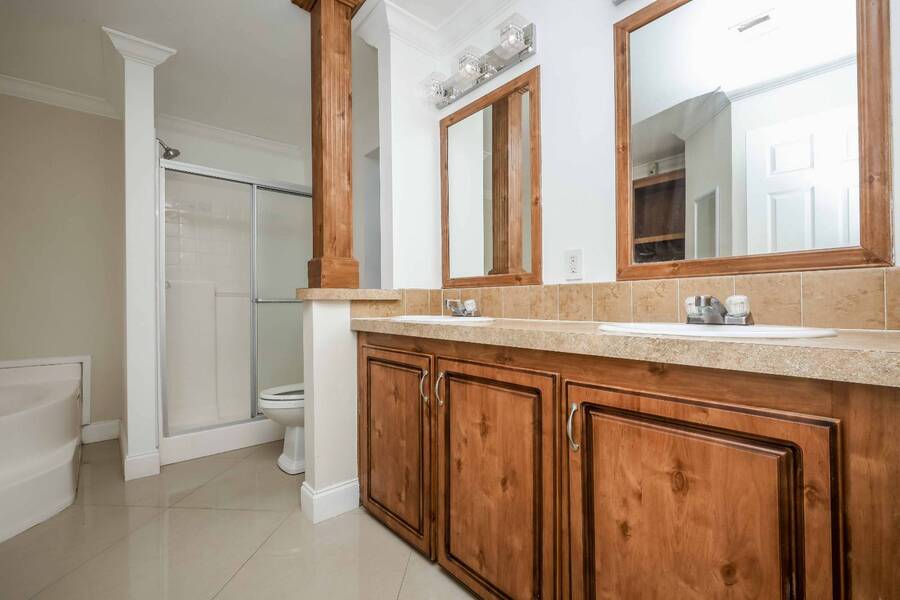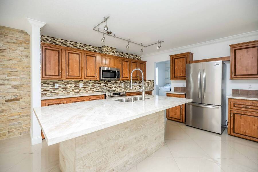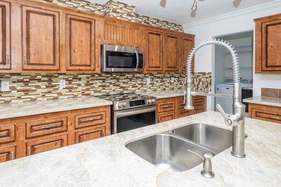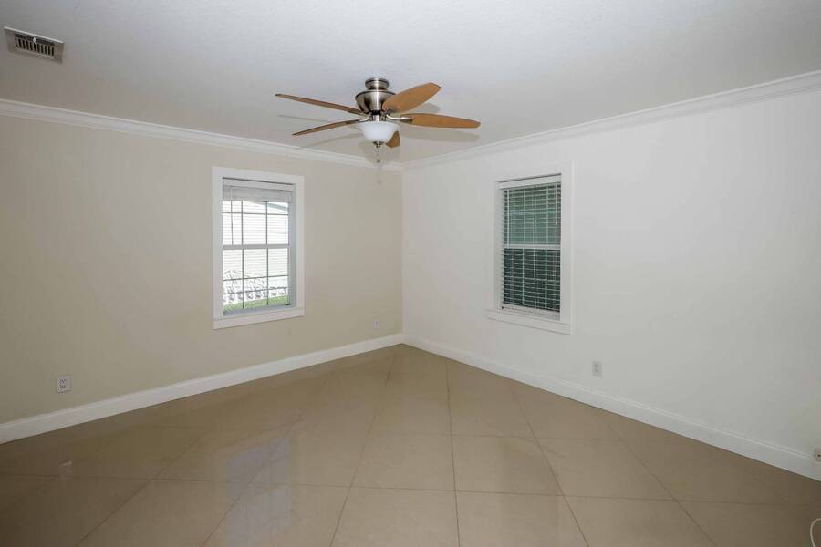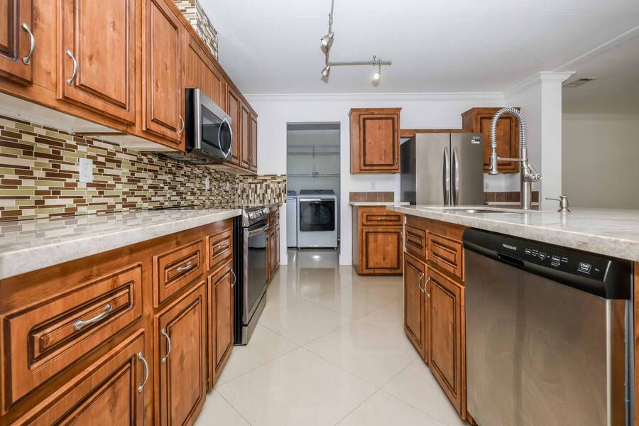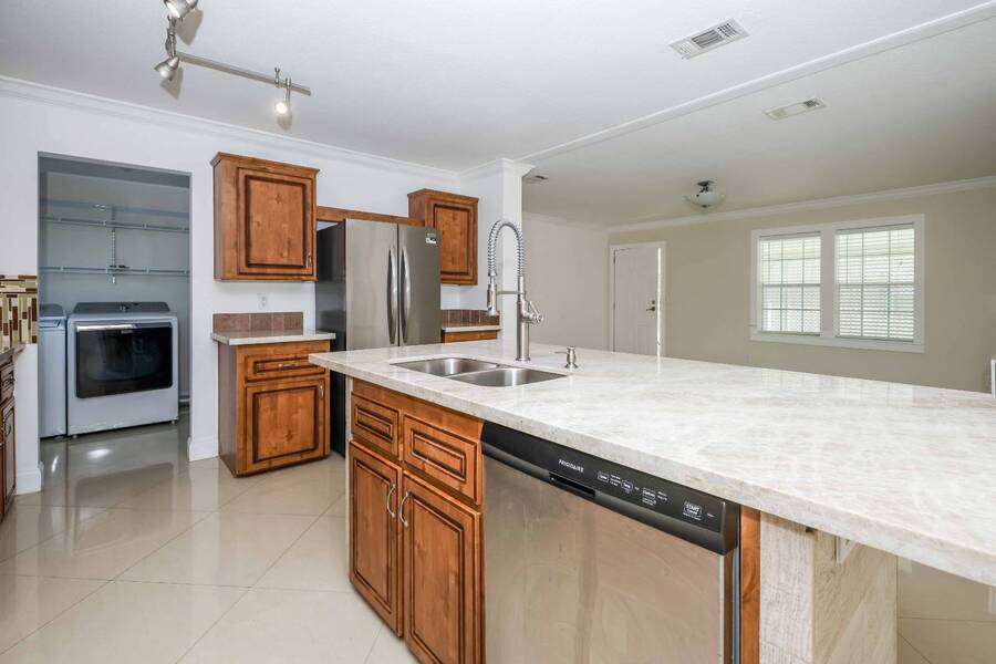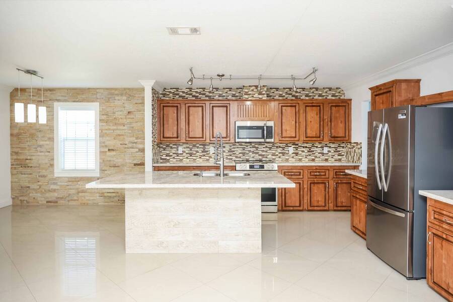 MAJOR PRICE IMPROVEMENT! Step inside Marbella Manor, a breathtaking 4-bedroom, 2-bathroom retreat designed for ultimate comfort and style. Nestled in Rexmere Village, this spacious and upgraded home is truly one of a kind. From the moment you arrive, the attractive pale yellow exterior, covered half porch, and charming box bay window create a welcoming first impression. Inside, highly polished seamless beige ceramic tile flooring flows throughout, providing a bright, airy, and sophisticated feel. The open-concept living, dining, and kitchen areas are perfectly designed for both entertaining and everyday relaxation. The seller left a stylish "European design" built in entertainment console in the common living space reserved for a large flat screen television. The dining room is a showstopper, featuring a gorgeous stacked stone accent wall that adds warmth and elegance, while the adjacent chef's kitchen boasts a stunning stone-covered island with quartz countertops, a double-bowl stainless steel sink and dishwasher, a glass tile backsplash in earthy beach tones of sand and shell, and higher-end stainless steel appliances including a French-door refrigerator with a bottom freezer drawer, smooth-top range, and built-in microwave. A separate laundry room off the kitchen (with a full-sized washer and dryer included) adds convenience. The luxurious master suite is a private retreat, featuring an en suite bathroom with his-and-hers sinks and a Roman soaking tub and separate shower for the ultimate spa-like experience. High-end decorative lighting and ceiling fans are found throughout, enhancing the home's elegance. Three additional bedrooms provide flexibility for a larger family, guests, or a live-work setup, while the guest bath is equally impressive with a modern LED-lit mirror and a bidet conversion for added indulgence. Like all homes in this charming lakeside community, you will enjoy off-street covered parking, your own outdoor storage shed, professional landscaping with an irrigation system, and access to resort-style amenities including a heated pool complex, fitness center, tennis and basketball courts, clubhouse, sauna, relaxation room, library, and lake recreation. A truly breathtaking and stylish beauty that must be seen to be appreciated. Seller went ALL OUT!