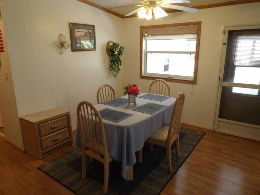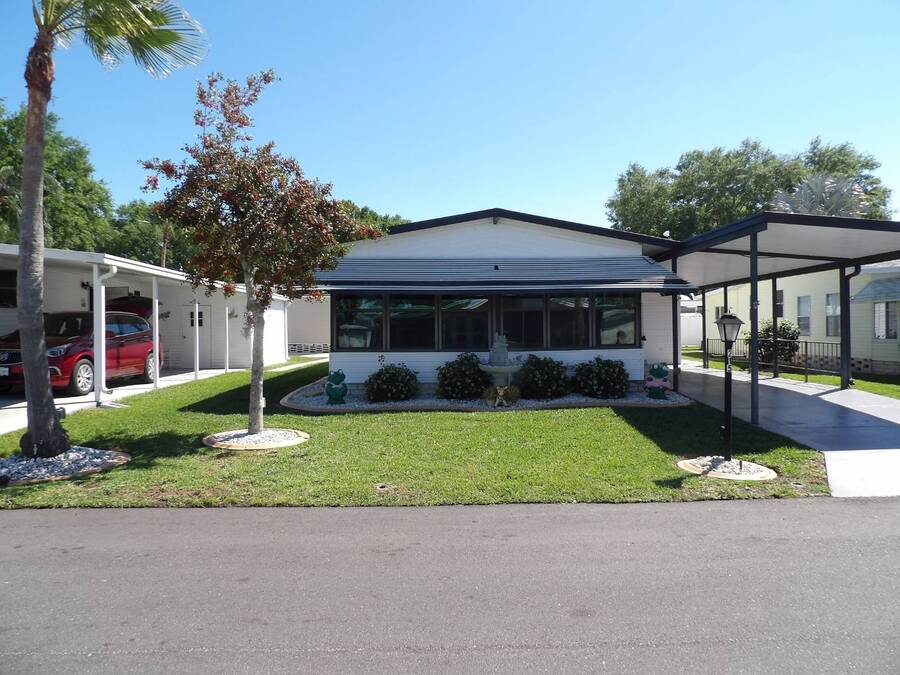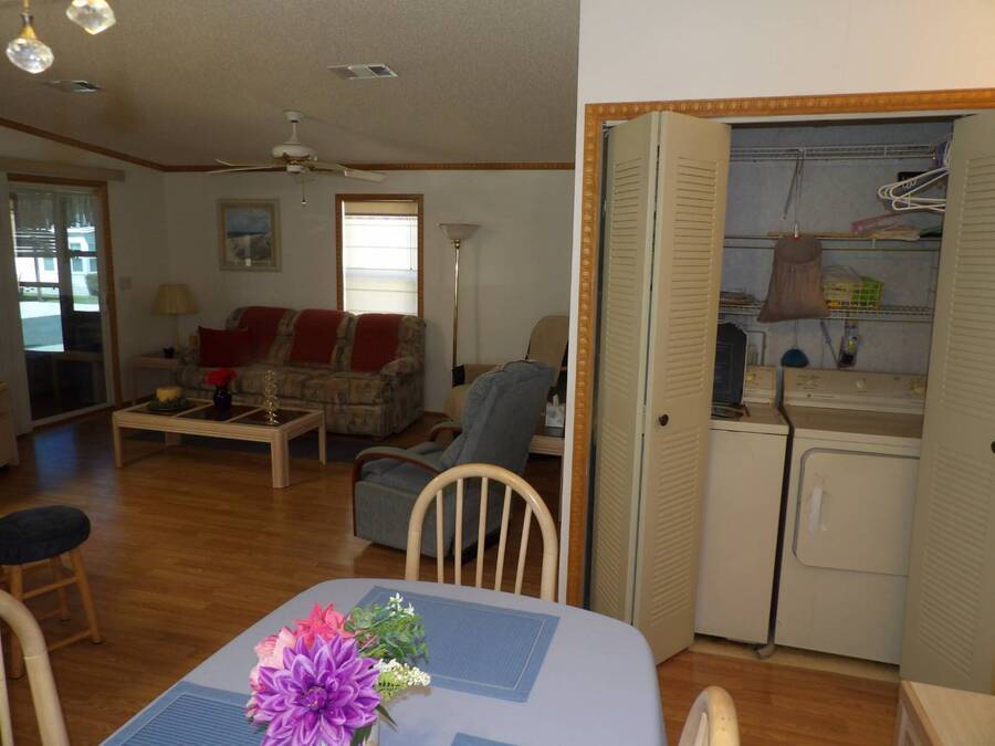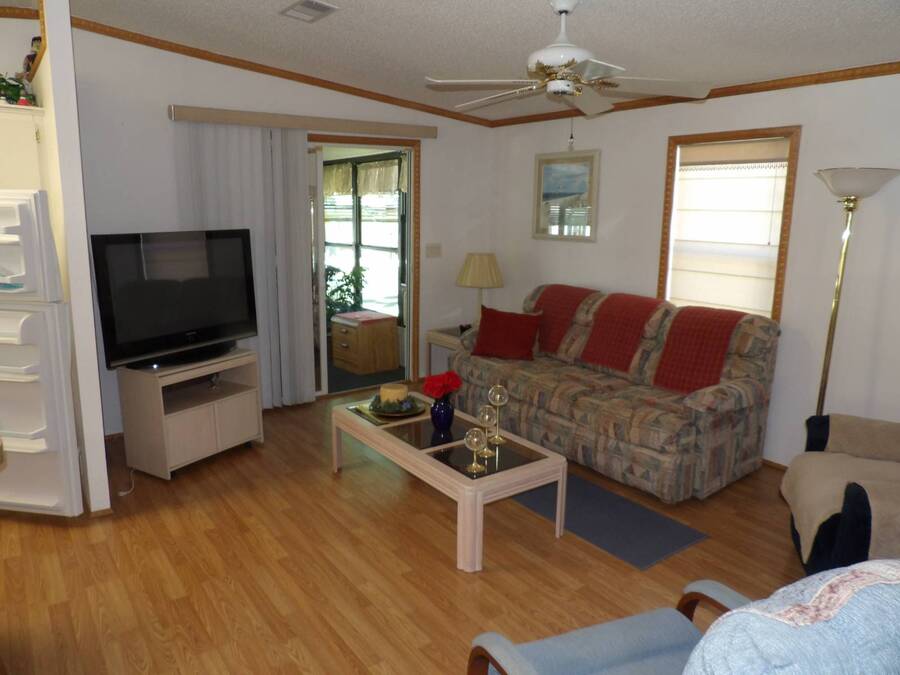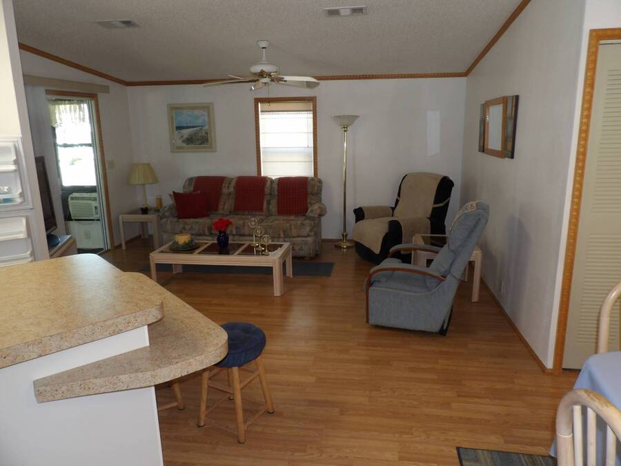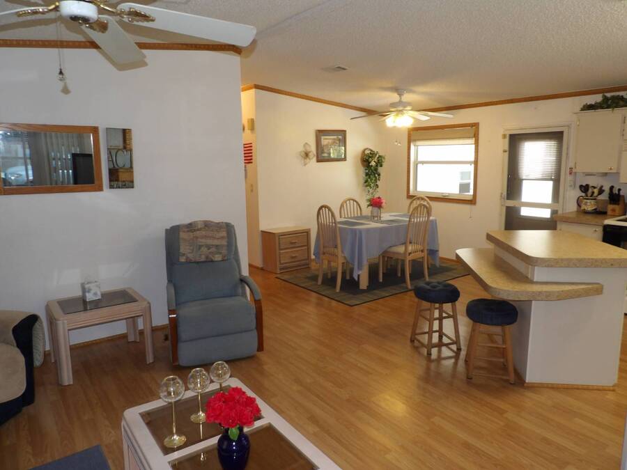 Furnished 2 BR 2 BA homes of Merit with 10 X 20 FL rooms provide 1112 sq ft of living space, and the home offers an open floor plan with multiple upgrades. Outside features include nice curb appeal, aluminum shutters across the front, an 11.5 X 40 carport with an extended 11.5 X 19 storage shed behind, 2 storage sheds in the back, a shingled roof, and a 2024 AC. Inside features include an L-shaped kitchen with a work island and breakfast bar, open into the dining room, a large living room, a wide hallway to the guest bath, and both bedrooms. Inside the walls have been textured and repainted, laminate and tile flooring, inside laundry, 11 X 23.5 master suite with step-in shower, 11 X 13 2nd bedroom, and 4.5 X 7.5 guest bath. All this, plus the home is located with a back gate to the office and amenities. Call today for an appointment to see this cozy gem. Seller is offering a 3-month lot rent with a full price offer