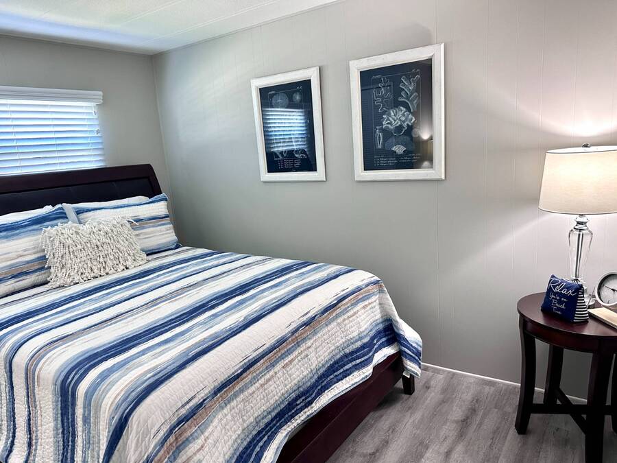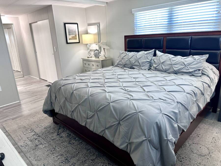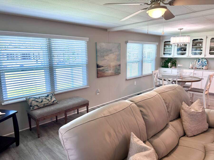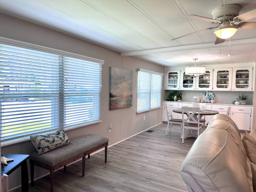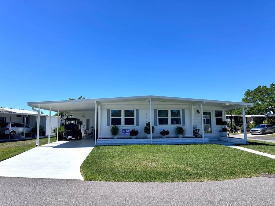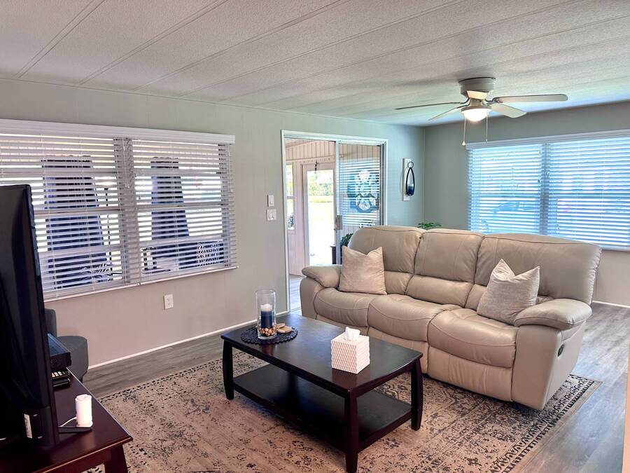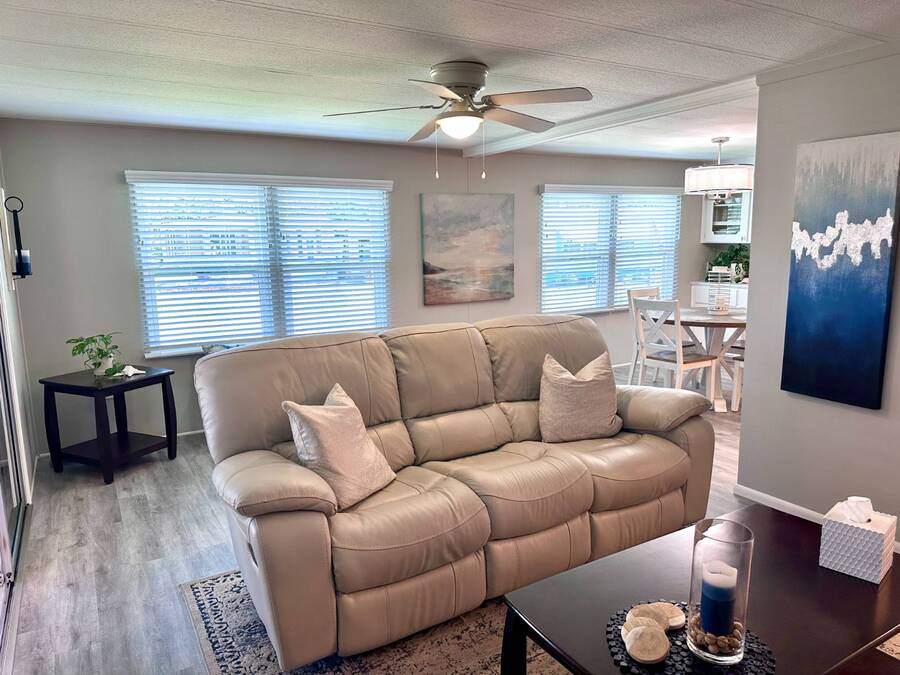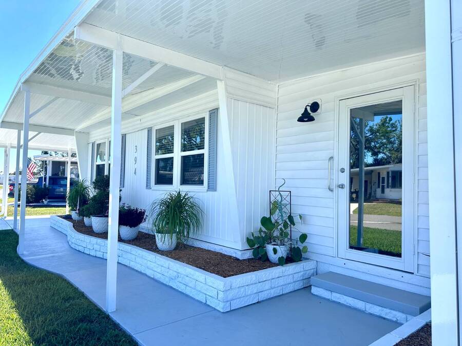 Corner Lot, Fully Renovated Home at 394 Peppertree in Colony Cove! Don't miss this amazing deal! The Show-Stopping Kitchen: This kitchen is the heart of this home and boasts stainless steel appliances, white shaker cabinets, laminate countertops that resemble stone, and upgraded fixtures. Thoughtful touches include pull-out drawers and enchanting lighting, combining functionality and elegance. Adjacent to the kitchen is your stunning dining room with a built-in large hutch for extra storage. Bright and Inviting Living Spaces: The oversized living room, with abundant natural light, is perfect for entertaining or unwinding. Then you can enter the sunroom which has its own AC unit and is perfect for your morning coffee or curling up to enjoy the Florida weather and a great book. Bedroom and Bathroom Bliss: Both bathrooms have brand new vanities with shaker cabinets and new exhaust fans, The guest bathroom features a step-in shower/tub insert while the ensuite master bathroom has a beautiful tiled shower. The guest bedroom is roomy and includes a queen-sized bed, two closets, and a built-in dresser. The master suite offers luxury and convenience with enchanting natural lighting and two large walk-in closets. Exquisite Curb Appeal: All new sod and beautifully potted plants that stay with the home in the garden beds. There is a carport that can house your vehicle or turn into a patio for you to sit and enjoy the sun. Off of your carport is the laundry area that also has storage space. Extra Perks: 2023: New installation of vapor barrier, tie downs with additional tie downs for more security, 13 windows replaced, interior and exterior light fixtures and the roof was seal coated. 2024: The exterior of the home was painted, and new gutters and AC unit were added to the sunroom. 2025: Concrete in the driveway and carport was stained. Included with this home are two chairs in the sunroom, a water filtration system (cost $60 per year), and a bed in the guest room. Don't let this stunning property slip through your fingers. Call today to schedule your showing! The Community is an age-qualified (55+) five-star resort community of manufactured/mobile homes. Boasts 5 clubhouses, 6 heated pools, a riverfront pavilion, and private fishing pier, a private marina, a fenced dog park (very pet friendly), tennis, shuffleboard, new pickleball courts, 2 new fitness rooms, 24-hour patrol, clubs of every interest, and much more. There are daily planned activities throughout the park. Bottom line, if you get bored here, it's your own fault! The lot rent is based on the home's location. All listing information given to us is considered appropriate and reliable but we always recommend home inspections by independent companies who have a background and thorough understanding of manufactured homes. We cannot guarantee the accuracy of the information given to us or the home's condition. Lot rents are determined by the community office, not our company.