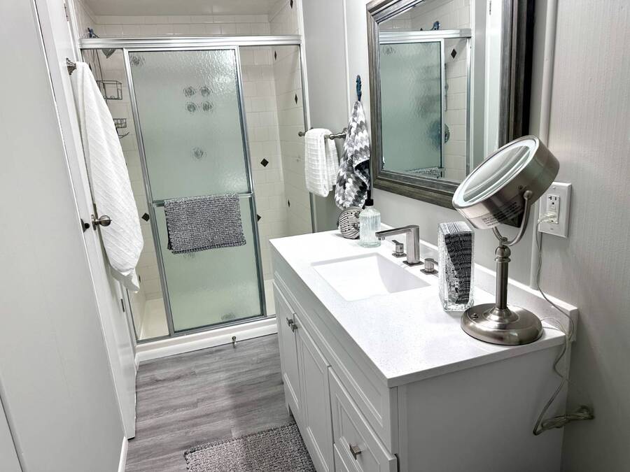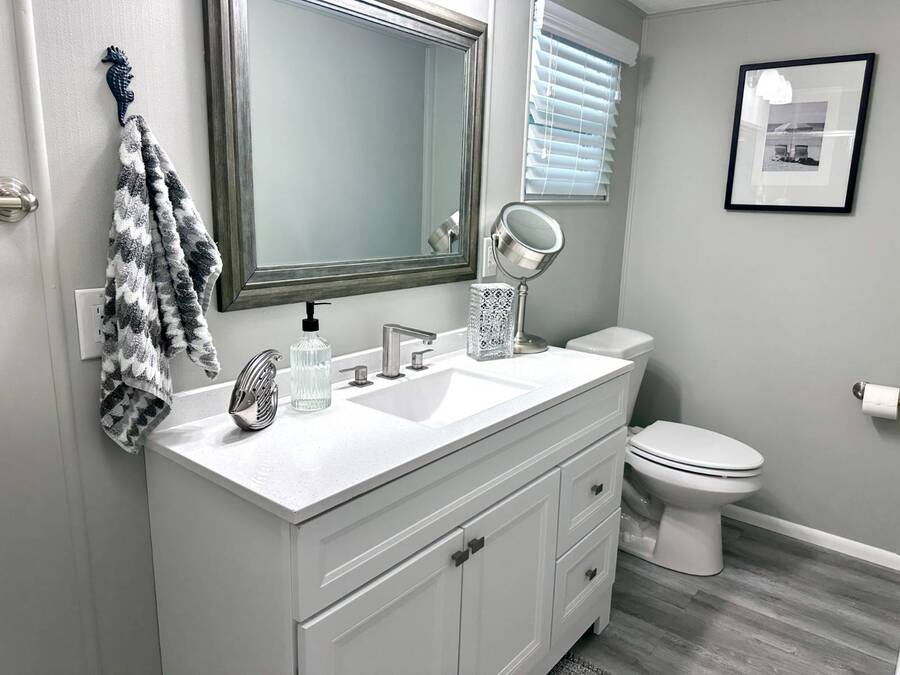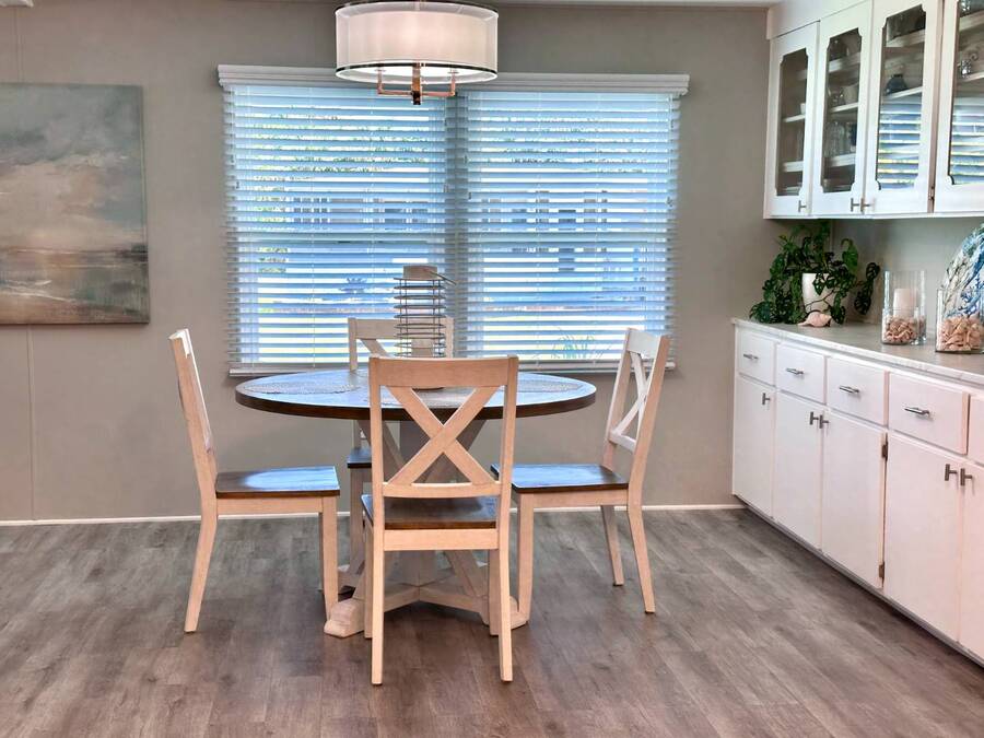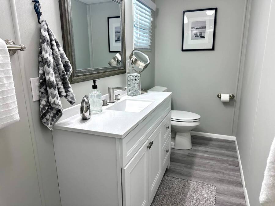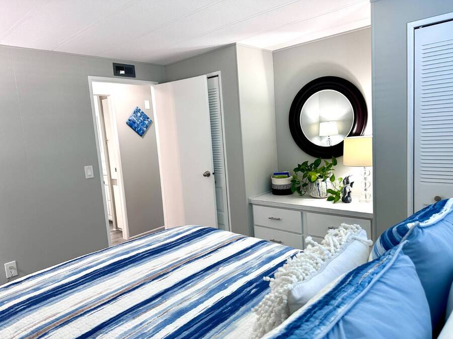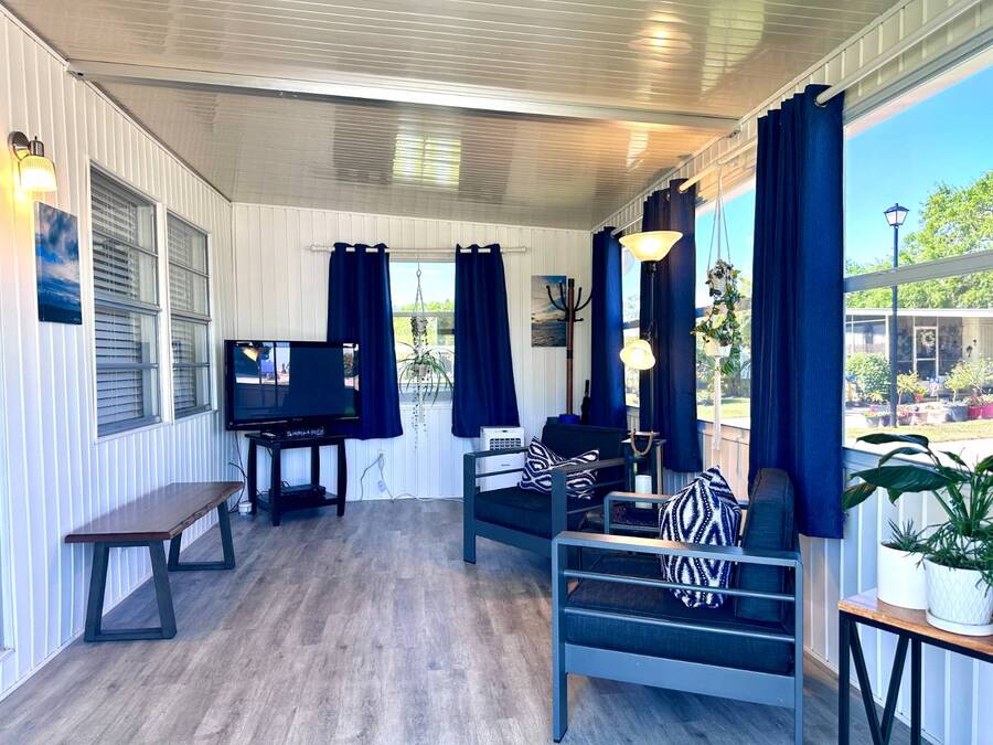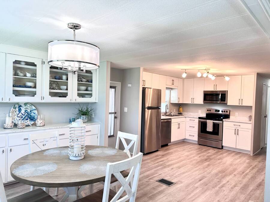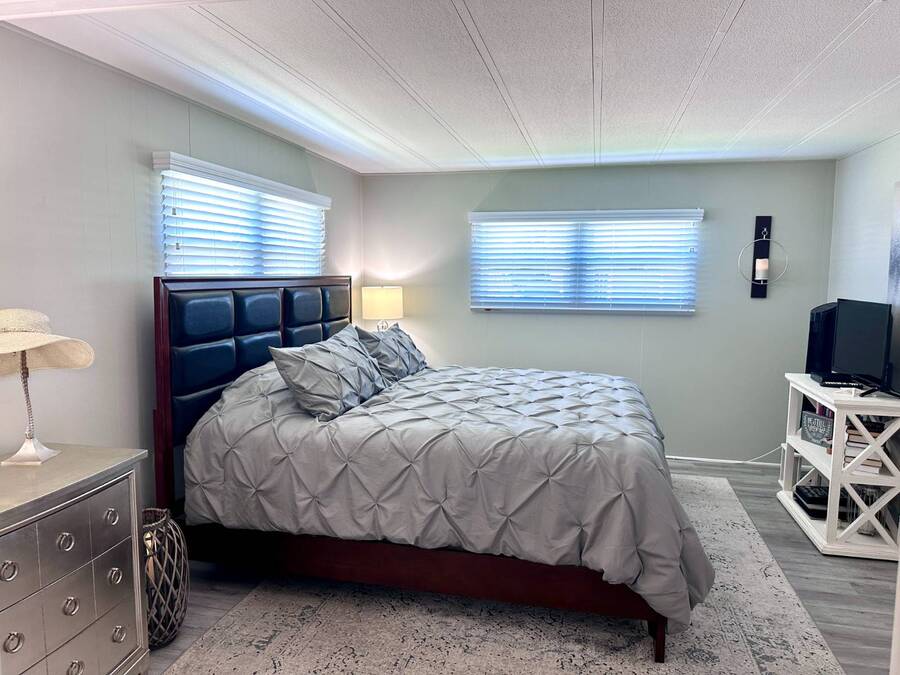 Corner Lot, Fully Renovated Home at 394 Peppertree in Colony Cove! Don't miss this amazing deal! The Show-Stopping Kitchen: This kitchen is the heart of this home and boasts stainless steel appliances, white shaker cabinets, laminate countertops that resemble stone, and upgraded fixtures. Thoughtful touches include pull-out drawers and enchanting lighting, combining functionality and elegance. Adjacent to the kitchen is your stunning dining room with a built-in large hutch for extra storage. Bright and Inviting Living Spaces: The oversized living room, with abundant natural light, is perfect for entertaining or unwinding. Then you can enter the sunroom which has its own AC unit and is perfect for your morning coffee or curling up to enjoy the Florida weather and a great book. Bedroom and Bathroom Bliss: Both bathrooms have brand new vanities with shaker cabinets and new exhaust fans, The guest bathroom features a step-in shower/tub insert while the ensuite master bathroom has a beautiful tiled shower. The guest bedroom is roomy and includes a queen-sized bed, two closets, and a built-in dresser. The master suite offers luxury and convenience with enchanting natural lighting and two large walk-in closets. Exquisite Curb Appeal: All new sod and beautifully potted plants that stay with the home in the garden beds. There is a carport that can house your vehicle or turn into a patio for you to sit and enjoy the sun. Off of your carport is the laundry area that also has storage space. Extra Perks: 2023: New installation of vapor barrier, tie downs with additional tie downs for more security, 13 windows replaced, interior and exterior light fixtures and the roof was seal coated. 2024: The exterior of the home was painted, and new gutters and AC unit were added to the sunroom. 2025: Concrete in the driveway and carport was stained. Included with this home are two chairs in the sunroom, a water filtration system (cost $60 per year), and a bed in the guest room. Don't let this stunning property slip through your fingers. Call today to schedule your showing! The Community is an age-qualified (55+) five-star resort community of manufactured/mobile homes. Boasts 5 clubhouses, 6 heated pools, a riverfront pavilion, and private fishing pier, a private marina, a fenced dog park (very pet friendly), tennis, shuffleboard, new pickleball courts, 2 new fitness rooms, 24-hour patrol, clubs of every interest, and much more. There are daily planned activities throughout the park. Bottom line, if you get bored here, it's your own fault! The lot rent is based on the home's location. All listing information given to us is considered appropriate and reliable but we always recommend home inspections by independent companies who have a background and thorough understanding of manufactured homes. We cannot guarantee the accuracy of the information given to us or the home's condition. Lot rents are determined by the community office, not our company.