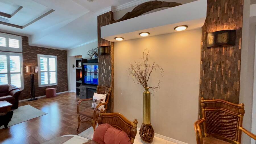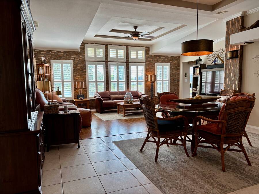 Outside, the screened-in lanai offers a front-row seat to nature s beauty. Overlooking the shimmering pond, it s the ideal setting for peaceful mornings, lazy afternoons, or lively gatherings.