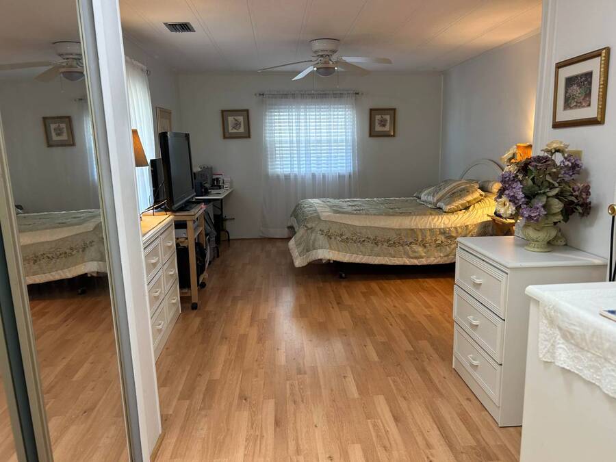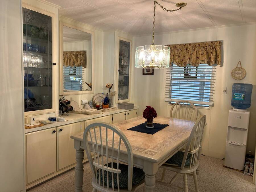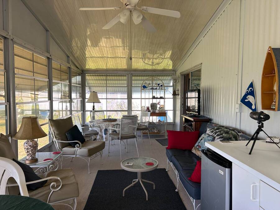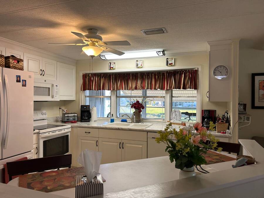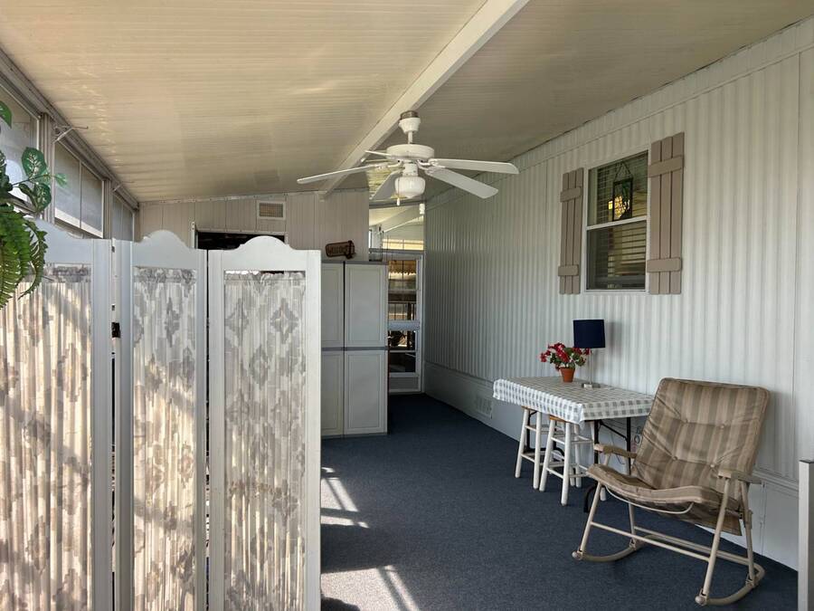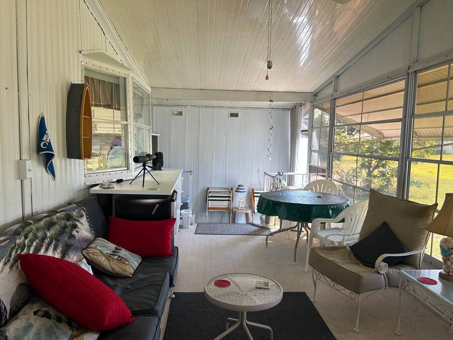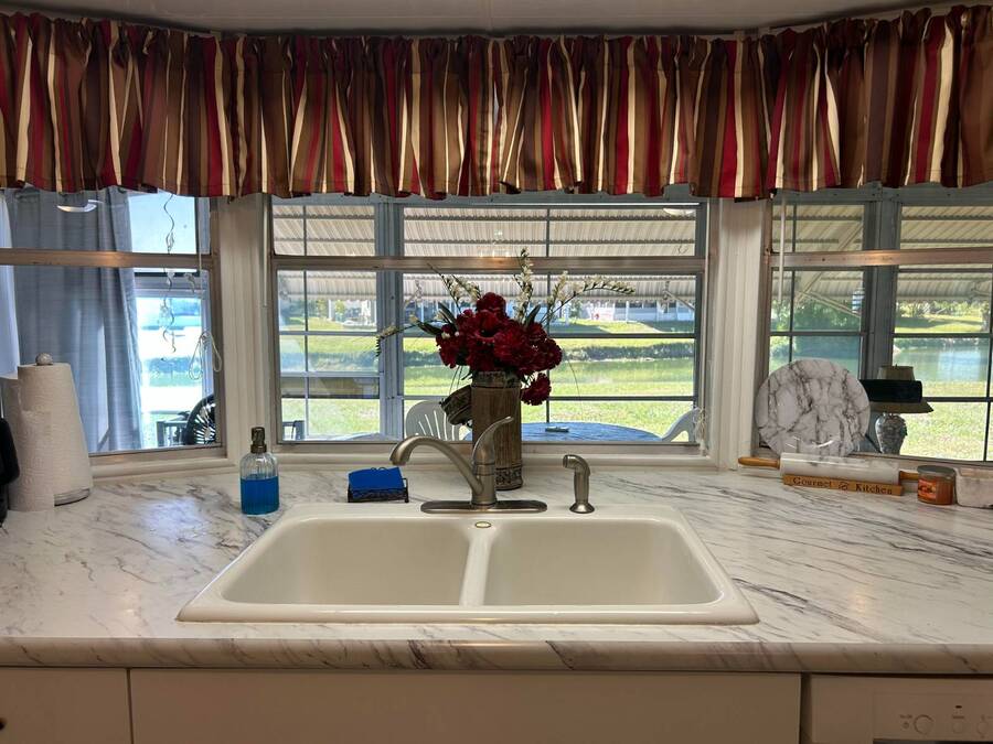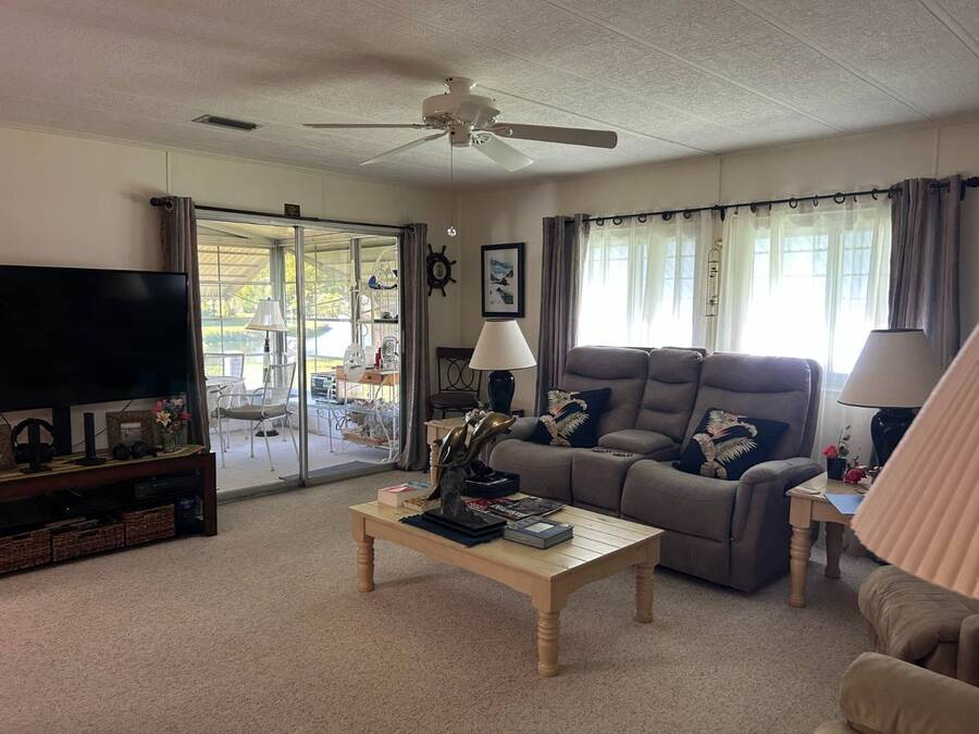 Step into the wonderful world of waterfront living with a tour of this charming home, strategically positioned near Harmony Hall, including the community's largest pool, clubhouse, gym, pickleball, and tennis courts. This home is immaculately maintained and turnkey, primed for your immediate occupancy. The exterior has durable metal siding, gutters, and a convenient side driveway, with room for 2 cars, leading to a spacious screened in area that provides ample space to store a car ( with wide doors that open and lock), and space for other gear, bikes, or gulf cart, when not there. This area leads to an enclosed storage shed with ample room for your tools, beach gear, overflow storage, ensuring that everything has its place, and a workshop area that includes a new full-size washer and dryer. This area also has a walkway to the sunroom and the backyard. Step inside to discover a freshly painted home with a small foyer that leads to a hallway and into this magnificent home. Every room is generously proportioned and flooded with natural light, creating an inviting atmosphere throughout the home. The kitchen beckons with ample cabinets and laminate marble-style counter tops and all-white newer appliances. Adjacent, the dining area offers a perfect setting for hosting family and friends with ease. The home offers waterfront views from the kitchen and the back Sunroom. Convenience is key, with a large hallway closet for storage and organization, while the oversized guest bedroom boasts a walk-in closet with shelves and a ceiling fan for added comfort. The main bathroom features a tub/shower combo and a single sink vanity with storage underneath, while the master bedroom is very large with plenty of space for a king-sized bed and matching bureau set, and has a large walk-in closet and a master closet. The updated ensuite bathroom features a step-in shower and a beautiful vanity. Unwind in the expansive living room, perfect for relaxation and entertainment. The Sunroom/Lanai offers a tranquil retreat with water views. Enjoy your morning cup of coffee or evening cocktail while you bask in the stunning water views of the lake and wildlife. Recent upgrades include the replacement of the carport, guaranteeing both safety and longevity. The AC was replaced in 2024. This home also has double-paned windows with a guarantee from Window World. The community is an age-qualified (55+) five-star resort community of manufactured/mobile homes.