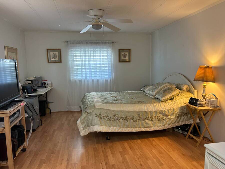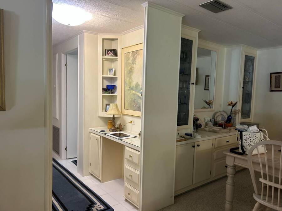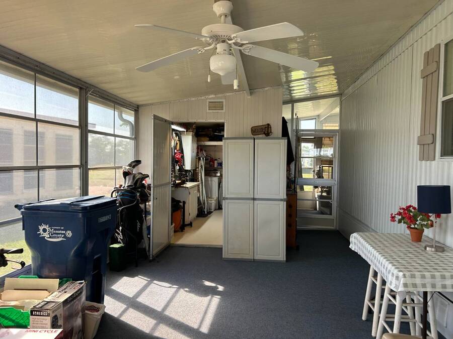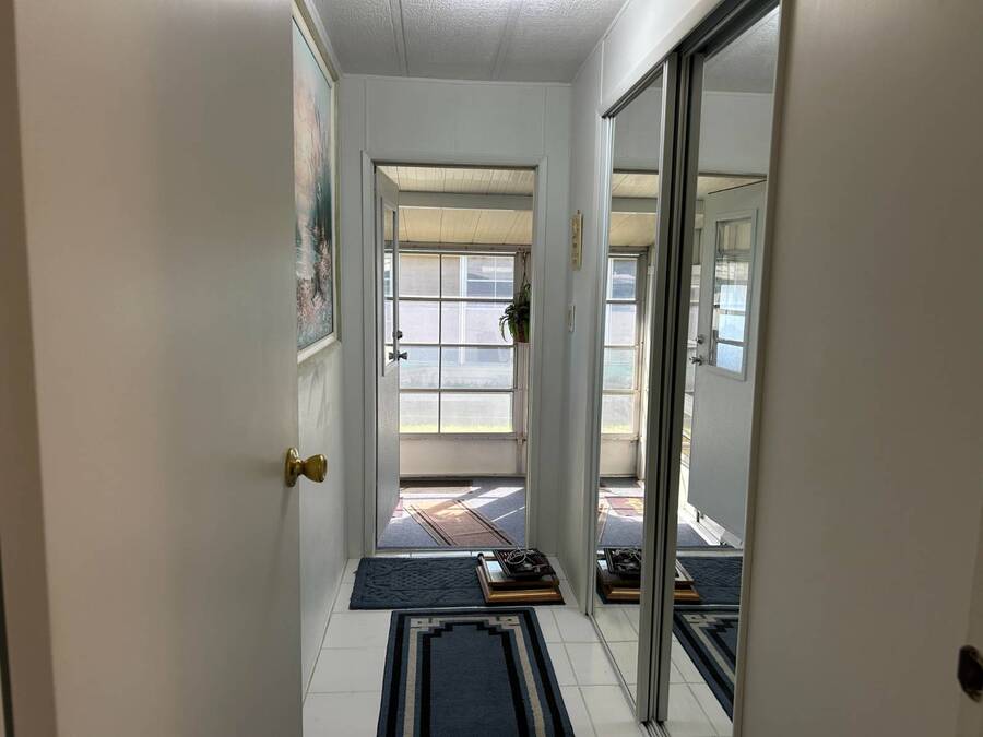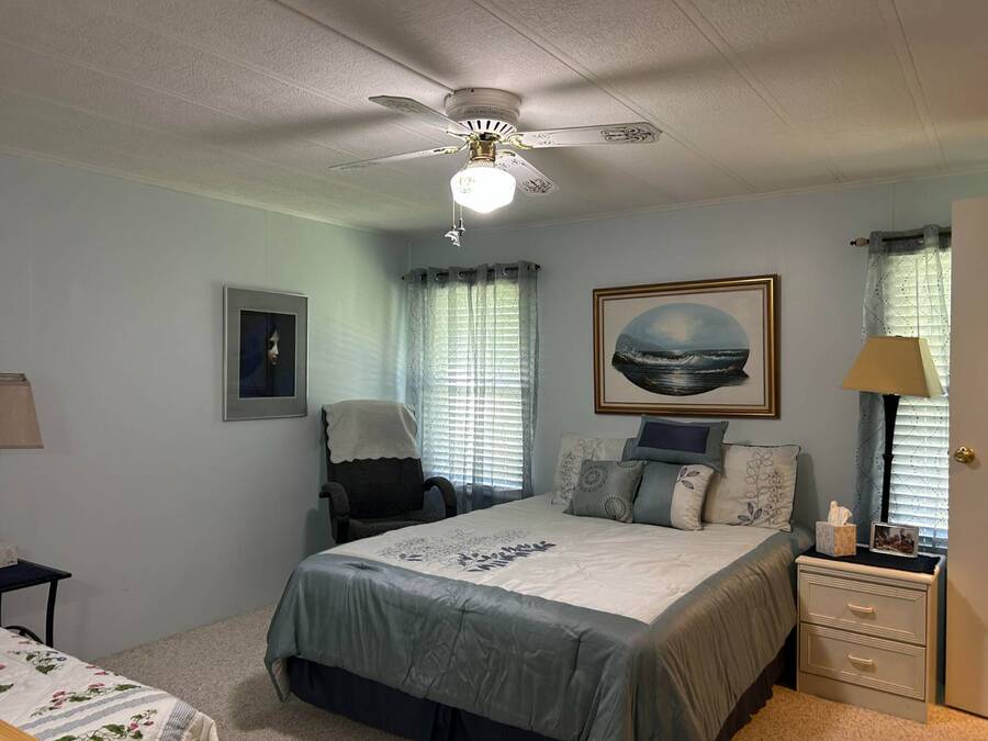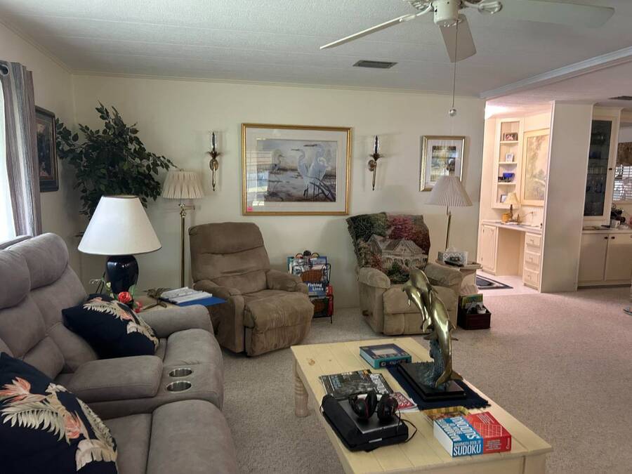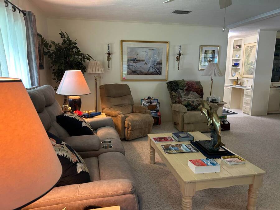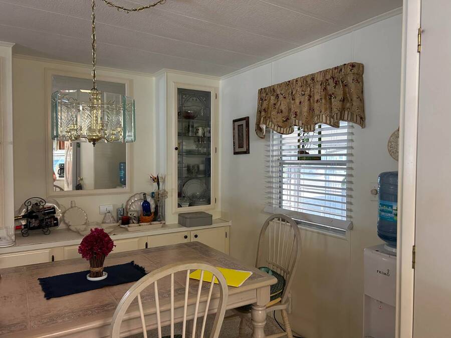 Step into the wonderful world of waterfront living with a tour of this charming home, strategically positioned near Harmony Hall, including the community's largest pool, clubhouse, gym, pickleball, and tennis courts. This home is immaculately maintained and turnkey, primed for your immediate occupancy. The exterior has durable metal siding, gutters, and a convenient side driveway, with room for 2 cars, leading to a spacious screened in area that provides ample space to store a car ( with wide doors that open and lock), and space for other gear, bikes, or gulf cart, when not there. This area leads to an enclosed storage shed with ample room for your tools, beach gear, overflow storage, ensuring that everything has its place, and a workshop area that includes a new full-size washer and dryer. This area also has a walkway to the sunroom and the backyard. Step inside to discover a freshly painted home with a small foyer that leads to a hallway and into this magnificent home. Every room is generously proportioned and flooded with natural light, creating an inviting atmosphere throughout the home. The kitchen beckons with ample cabinets and laminate marble-style counter tops and all-white newer appliances. Adjacent, the dining area offers a perfect setting for hosting family and friends with ease. The home offers waterfront views from the kitchen and the back Sunroom. Convenience is key, with a large hallway closet for storage and organization, while the oversized guest bedroom boasts a walk-in closet with shelves and a ceiling fan for added comfort. The main bathroom features a tub/shower combo and a single sink vanity with storage underneath, while the master bedroom is very large with plenty of space for a king-sized bed and matching bureau set, and has a large walk-in closet and a master closet. The updated ensuite bathroom features a step-in shower and a beautiful vanity. Unwind in the expansive living room, perfect for relaxation and entertainment. The Sunroom/Lanai offers a tranquil retreat with water views. Enjoy your morning cup of coffee or evening cocktail while you bask in the stunning water views of the lake and wildlife. Recent upgrades include the replacement of the carport, guaranteeing both safety and longevity. The AC was replaced in 2024. This home also has double-paned windows with a guarantee from Window World. The community is an age-qualified (55+) five-star resort community of manufactured/mobile homes.
