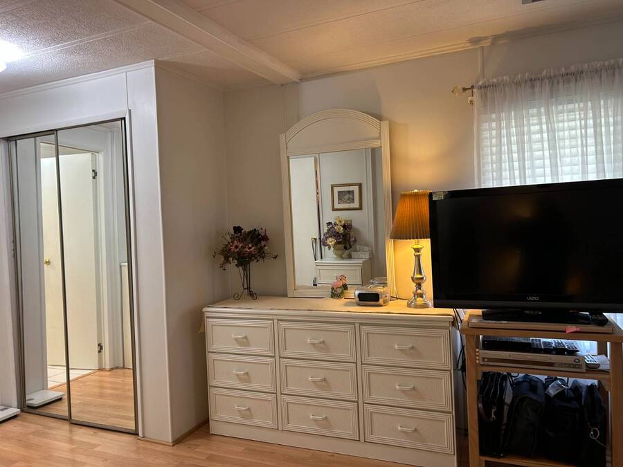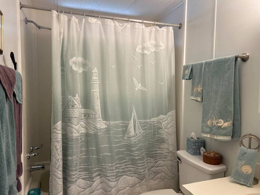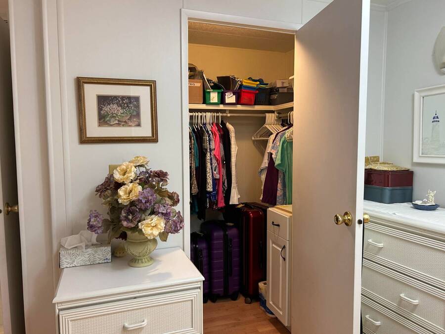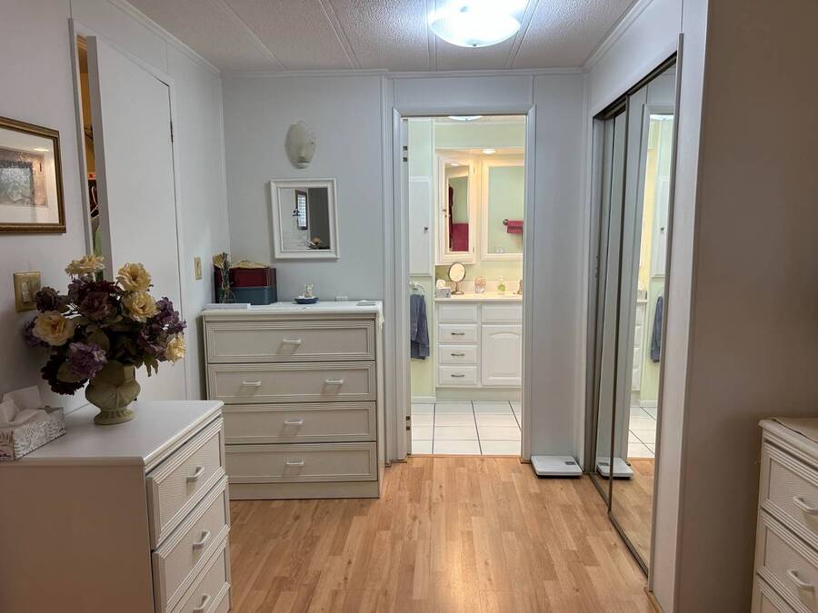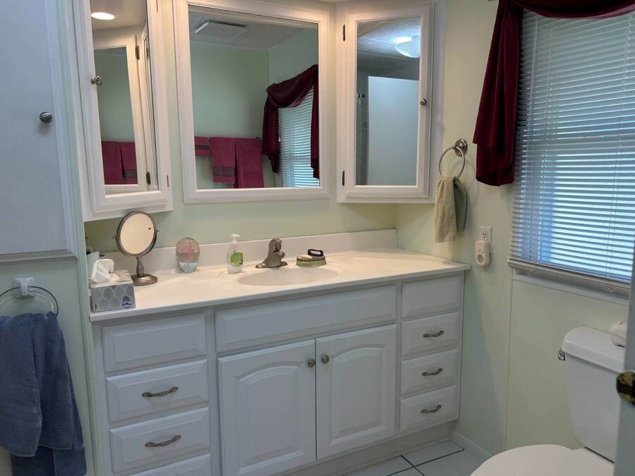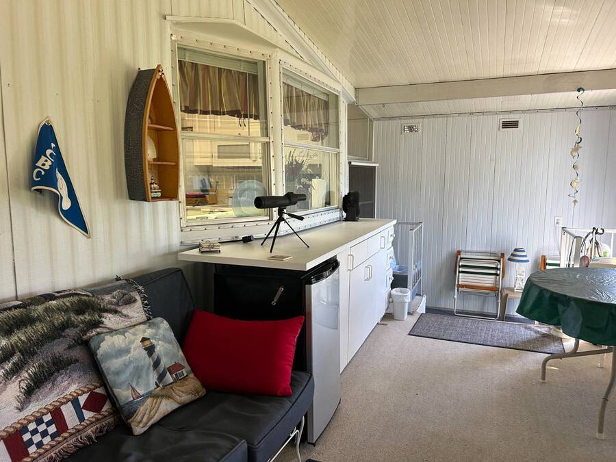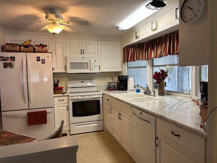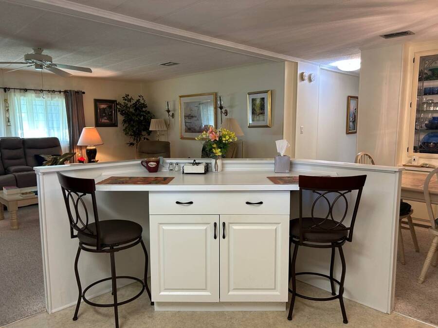 Step into the wonderful world of waterfront living with a tour of this charming home, strategically positioned near Harmony Hall, including the community's largest pool, clubhouse, gym, pickleball, and tennis courts. This home is immaculately maintained and turnkey, primed for your immediate occupancy. The exterior has durable metal siding, gutters, and a convenient side driveway, with room for 2 cars, leading to a spacious screened in area that provides ample space to store a car ( with wide doors that open and lock), and space for other gear, bikes, or gulf cart, when not there. This area leads to an enclosed storage shed with ample room for your tools, beach gear, overflow storage, ensuring that everything has its place, and a workshop area that includes a new full-size washer and dryer. This area also has a walkway to the sunroom and the backyard. Step inside to discover a freshly painted home with a small foyer that leads to a hallway and into this magnificent home. Every room is generously proportioned and flooded with natural light, creating an inviting atmosphere throughout the home. The kitchen beckons with ample cabinets and laminate marble-style counter tops and all-white newer appliances. Adjacent, the dining area offers a perfect setting for hosting family and friends with ease. The home offers waterfront views from the kitchen and the back Sunroom. Convenience is key, with a large hallway closet for storage and organization, while the oversized guest bedroom boasts a walk-in closet with shelves and a ceiling fan for added comfort. The main bathroom features a tub/shower combo and a single sink vanity with storage underneath, while the master bedroom is very large with plenty of space for a king-sized bed and matching bureau set, and has a large walk-in closet and a master closet. The updated ensuite bathroom features a step-in shower and a beautiful vanity. Unwind in the expansive living room, perfect for relaxation and entertainment. The Sunroom/Lanai offers a tranquil retreat with water views. Enjoy your morning cup of coffee or evening cocktail while you bask in the stunning water views of the lake and wildlife. Recent upgrades include the replacement of the carport, guaranteeing both safety and longevity. The AC was replaced in 2024. This home also has double-paned windows with a guarantee from Window World. The community is an age-qualified (55+) five-star resort community of manufactured/mobile homes.
