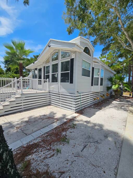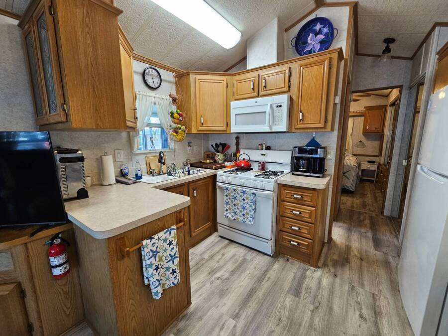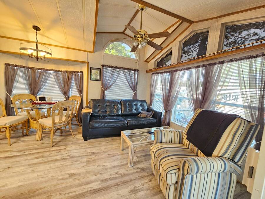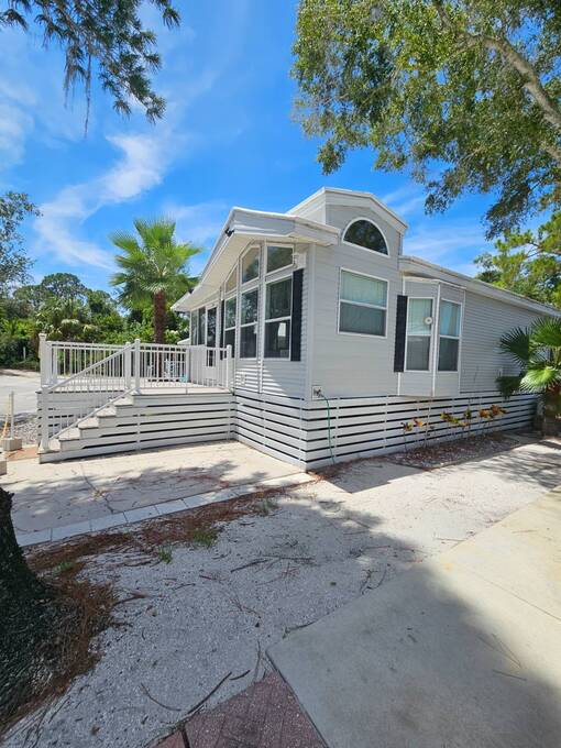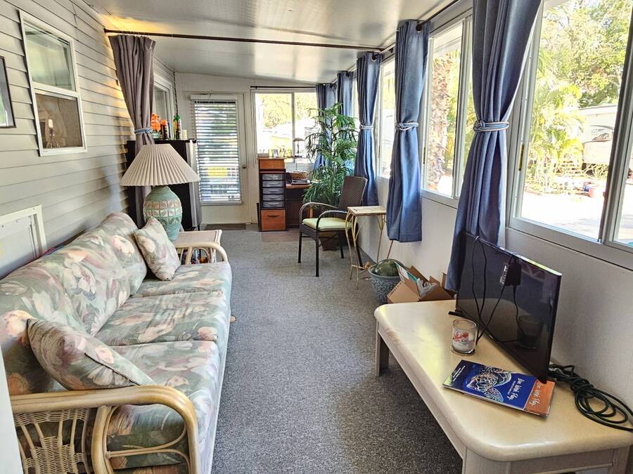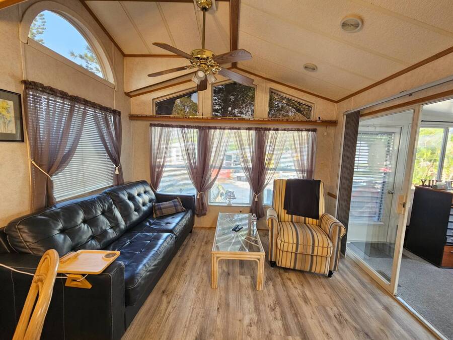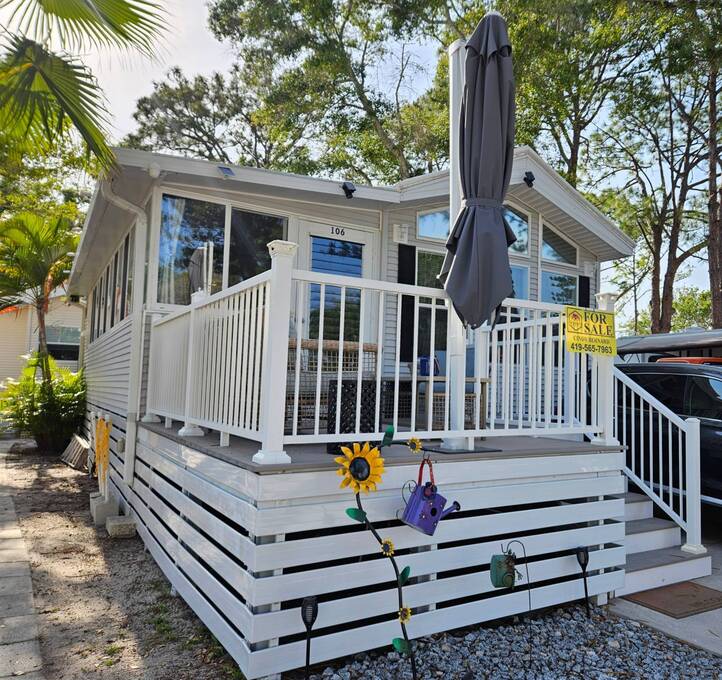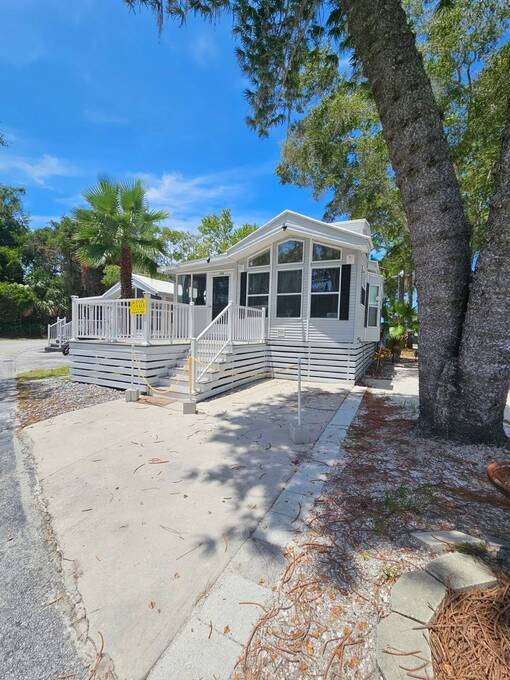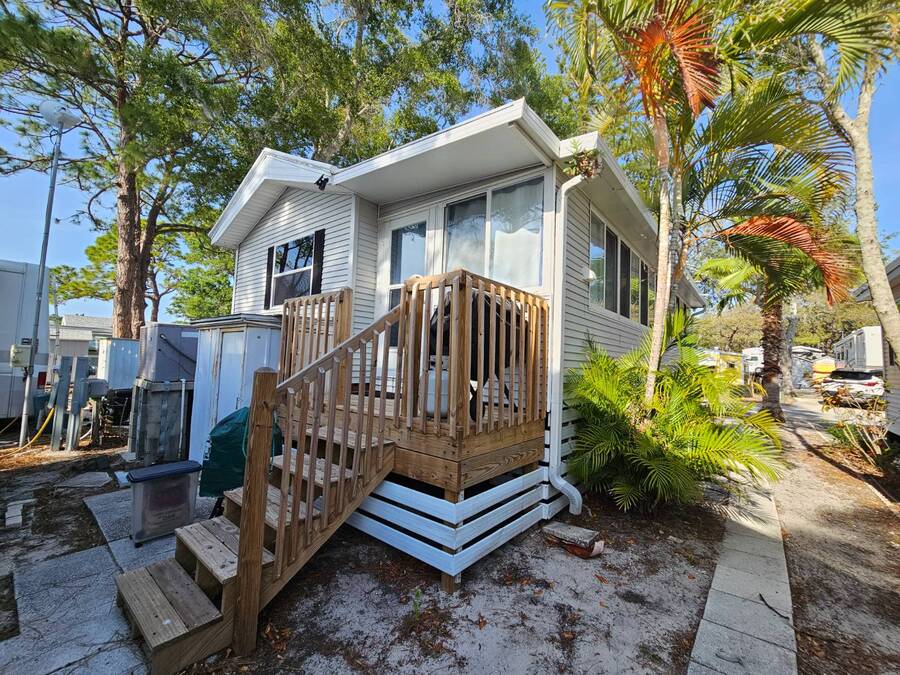 Come see this lovely home. Move in Ready. Motivated Seller!! Offers Welcome! Must see, well maintained, immaculate and perfect for seasonal or fulltime living. FABULOUS LOCATION!! JUST MINUTES FROM HONEYMOON ISLAND BEACH!! Pinellas trail is right down the street!! LIVE AFFORDABLY IN DUNEDIN FL RATED A TOP COASTAL TOWN!! ALL AGE RESORT STYLE PARK, Pet friendly community. This home had no flooding during Helene. You will feel at home the minute you enter this cozy cottage style park model 874 sq ft home. Built in 2000, this charming 1 bedroom, 1 bath home is perfect for seasonal or fulltime living on the thriving West Coast of Florida. Nestled within mature trees and shaded streets this very well maintained and FURNISHED residence offers ample space and affordable living. Enjoy "porch sitting" on the NEW (2024) front deck with maintenance free APEX decking and aluminum railing. Back of home has a new wooden deck and steps as well. Attractive outside appeal with Vinyl Siding, TPO Roof, NEW Thermopane windows in 2023. LIFEPROOF Vinyl Flooring was installed throughout in 2022. Step inside to the inviting bright and open concept living with a CATHEDRAL ceiling and trapezoid windows to give natural light. The kitchen is equipped with gas range, NEW refrigerator, microwave, ample counterspace cupboards and a pantry. Large hall closet for additional storage. Central AC with all new duct work, and a forced air gas furnace will keep you cool and warm and are very efficient. The Bedroom offers a spacious closet and an entrance to the Sunroom. Conveniently located inside LG frontload washer and dryer!! A water filtration system has been installed for crystal clear water throughout home. Home is very well-maintained, and power washed yearly. This community offers a wealth of amenities including a generously sized heated swimming pool, laundry facilities, a clubhouse, shuffleboard courts, pickleball and a diverse range of activities that cater to every interest. Conveniently located mere minutes from Honeymoon Island, exceptional restaurants, shopping centers, and a variety of outdoor and indoor activities, this location truly embodies the spirit of "Delightful Dunedin." Tampa is within 25 miles for sporting events and downtown activities and airport access. Pets of all sizes, with the exception of aggressive breeds. Lot rent is $1015.00 includes trash and immenities. CALL AGENT CINDY ONLY TO VIEW THIS HOME. The buyer is responsible for getting park approval and obtaining all rules and regulations and exact fees. All information is deemed reliable; however, accuracy, measurements or condition cannot be guaranteed and may be verified by licensed professionals.