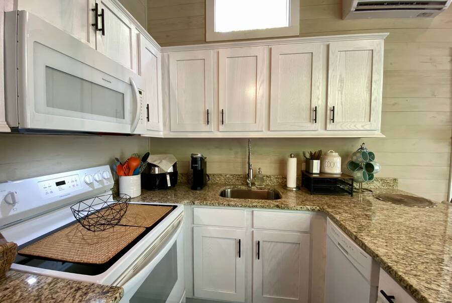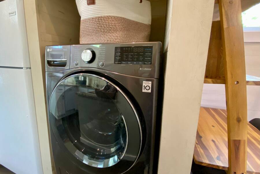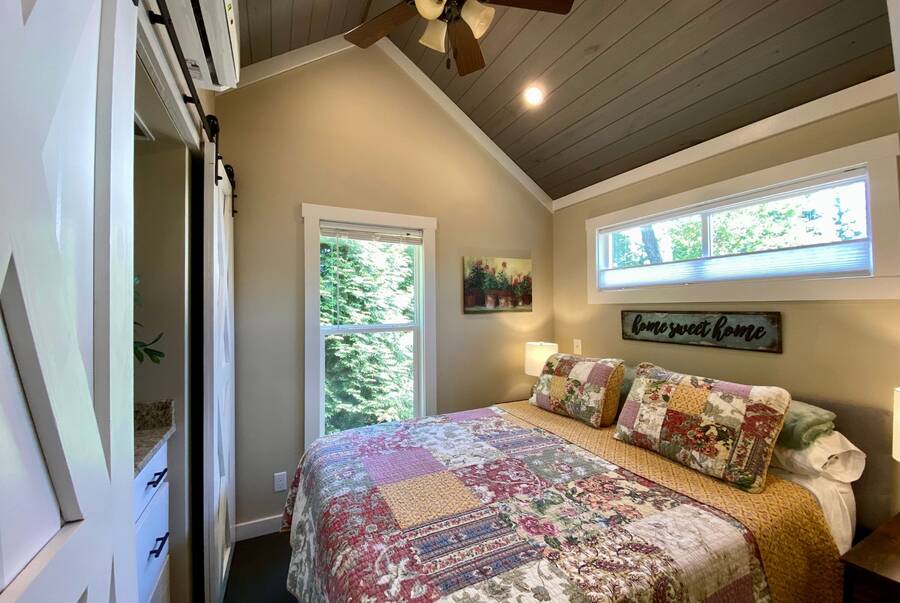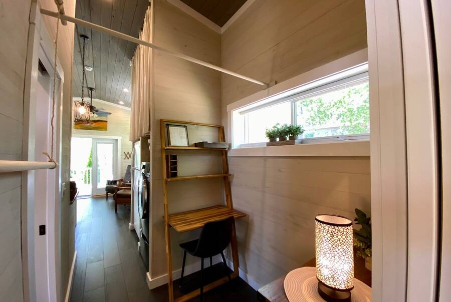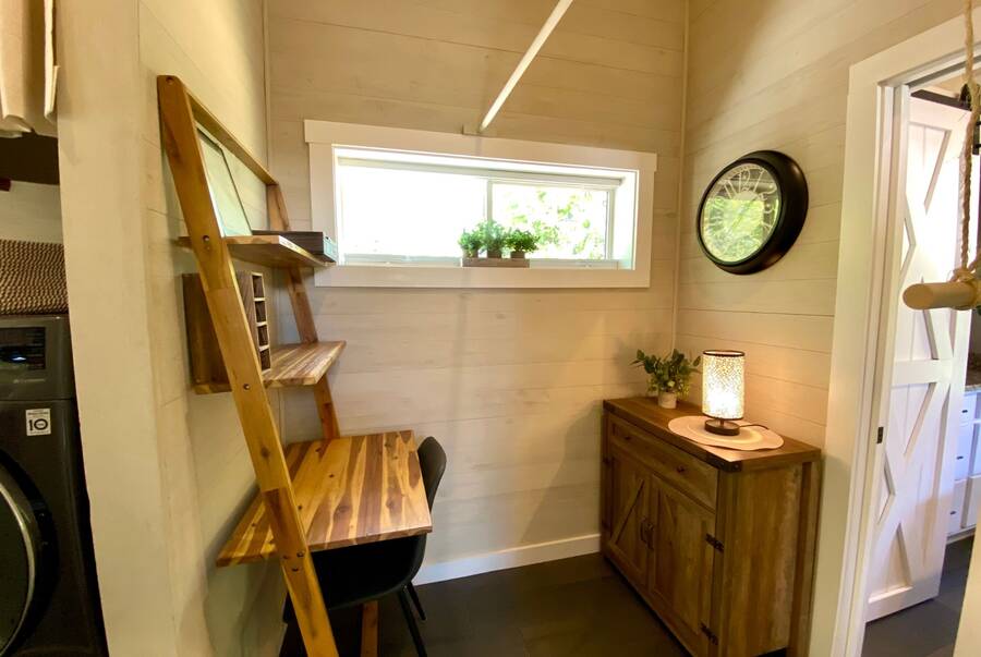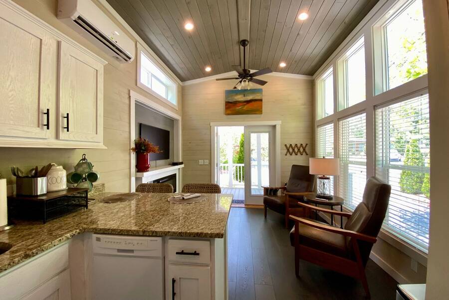 This thoughtfully designed 1-bedroom, 1-bath tiny home blends modern elegance with space-saving functionality in every detail. From the moment you walk in, you’re welcomed by soaring ceilings, oversized windows, and an airy open layout that makes the space feel bright and expansive.