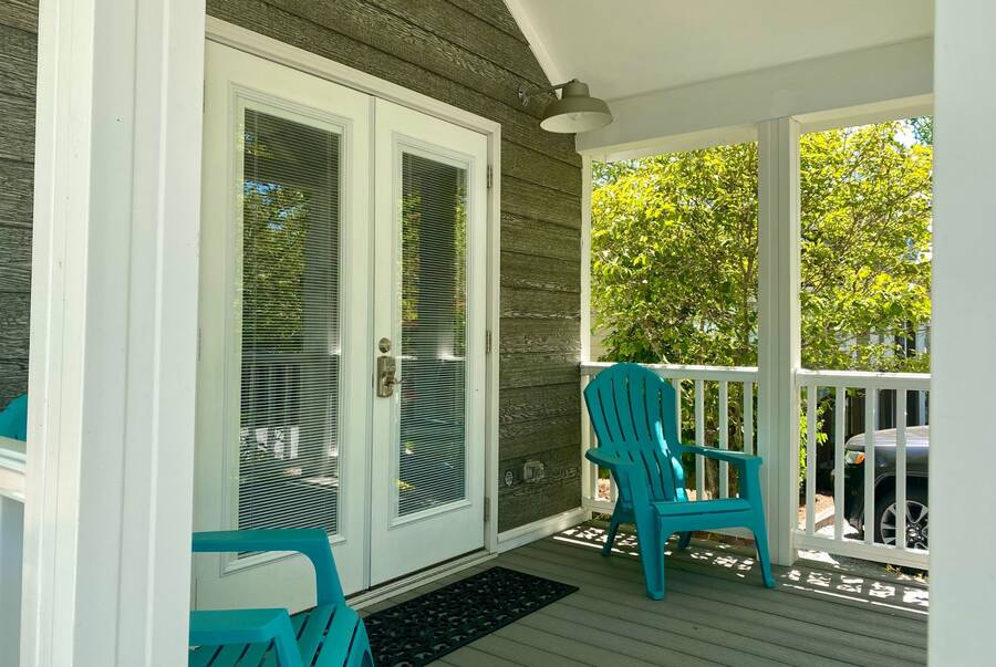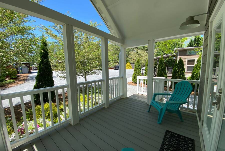 Relax in the inviting living area featuring a stylish electric fireplace, or step out onto the covered, open-air porch—ideal for outdoor lounging or morning coffee rain or shine. The bedroom includes built-in drawers within the closet, offering smart storage solutions without compromising floor space.
