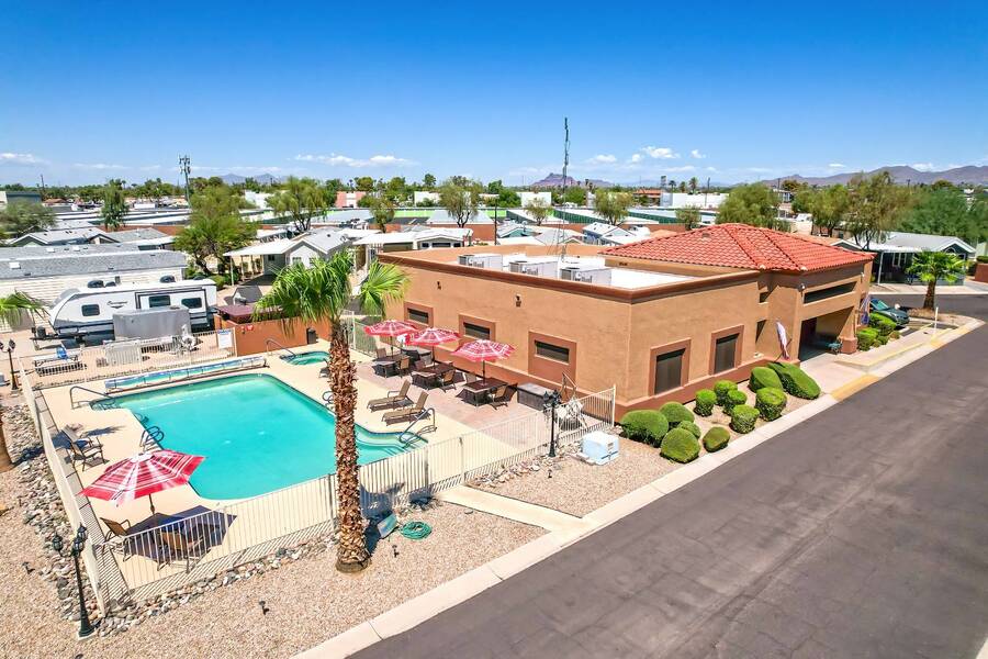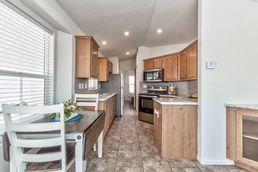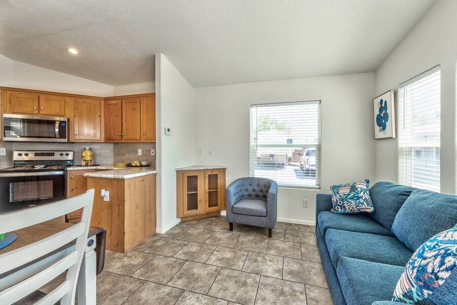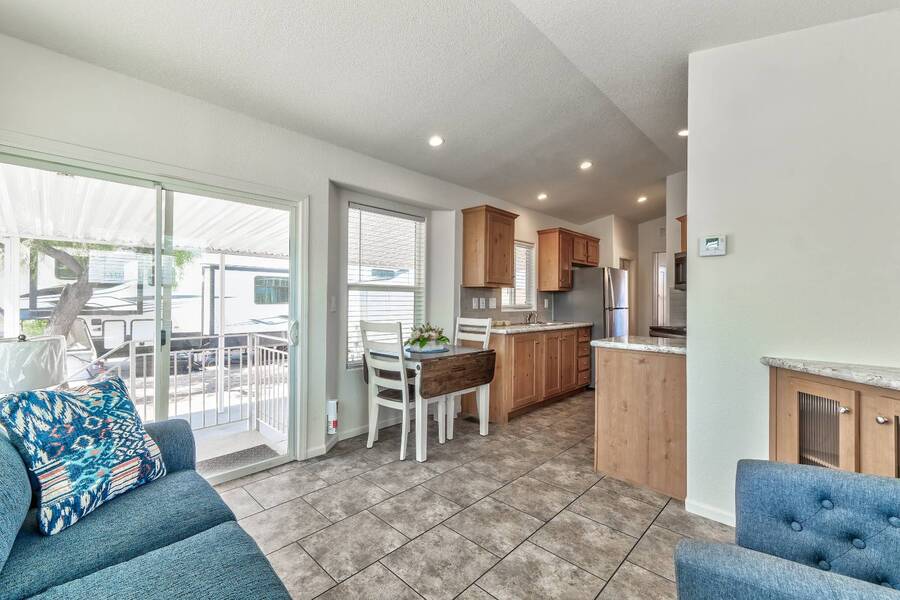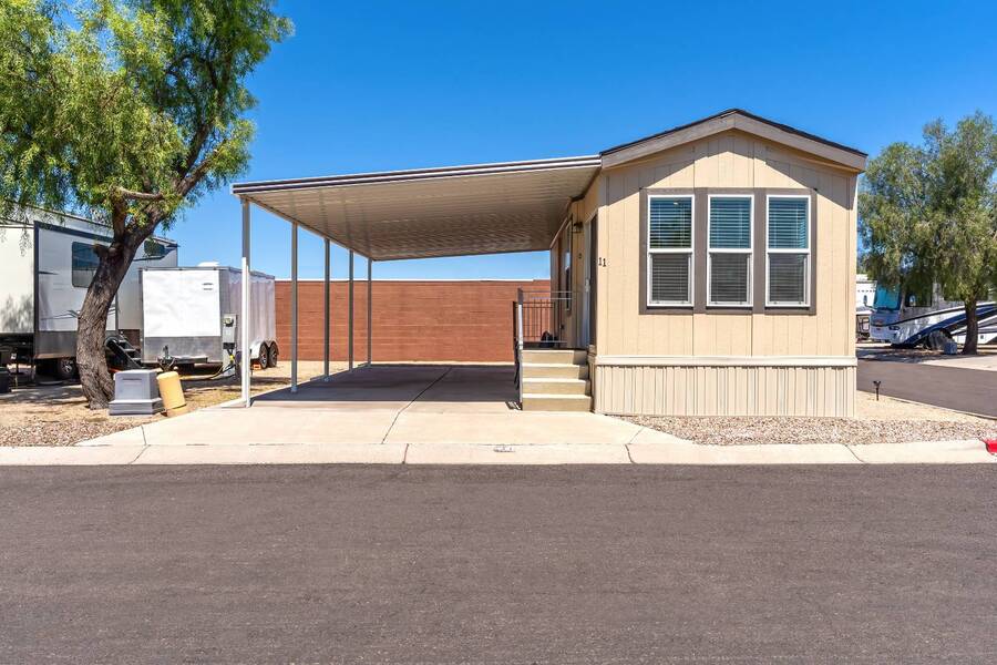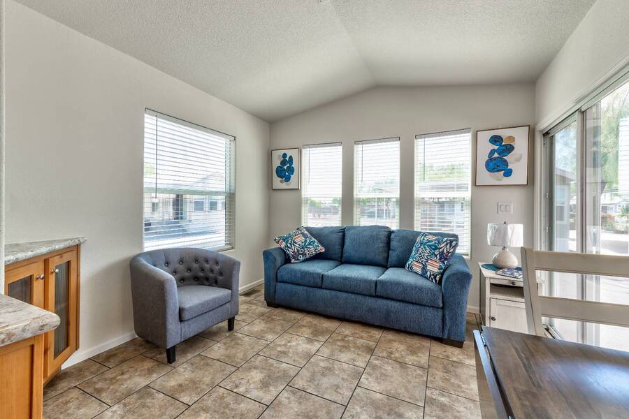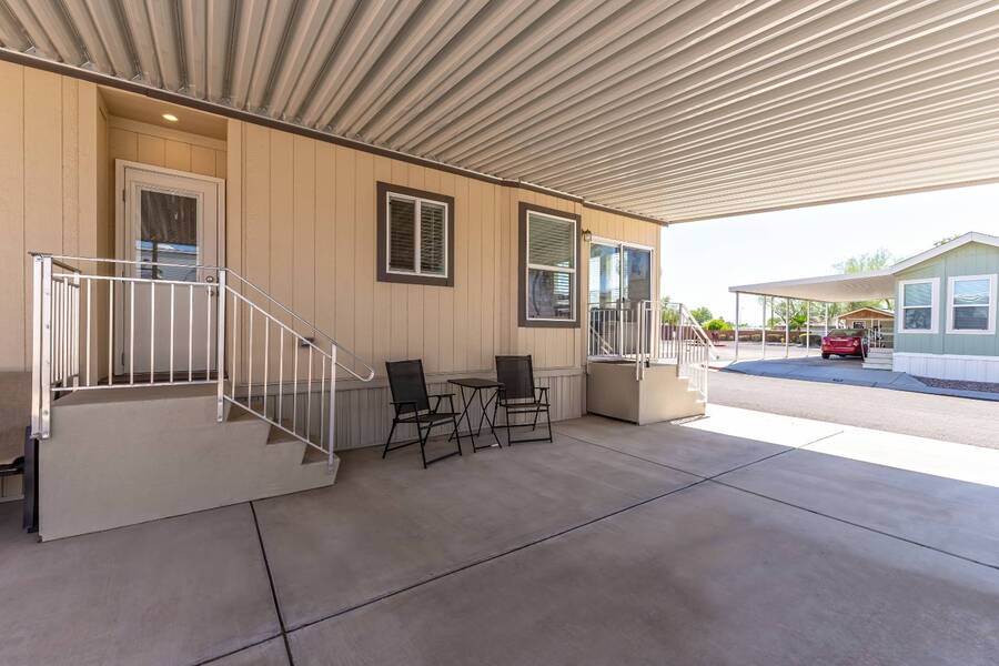 CHAMPION PARK MODEL located at Desert Vista RV Resort, a friendly 55+ community just minutes to downtown Mesa. Step into this open concept layout with vaulted ceilings and a wall of windows that provide an abundance of natural light. The kitchen features stainless steel appliances, an over-the-stove microwave, dishwasher, beautiful wood cabinetry and subway tile backsplash. The dining area features built-in cabinets, perfect for additional storage. Recessed LED lighting complement the living areas. The master bedroom features a built-in storage nook, additional over-the-bed storage and plenty of closet space, while the spacious bathroom features a large step-in shower. Outside, you'll love the expansive carport and wide driveway. This beautiful home is available furnished or unfurnished. Come discover Desert RV Resort, a secluded oasis in the heart of Mesa with resort-style amenities including a heated swimming pool and whirlpool spa, clubhouse with library & exercise room, on-site laundry room, dog park, activities, and so much more. Whether you're looking for a seasonal vacation home or tranquil place to live year-round, this an affordable way to live in paradise! CALL TODAY!