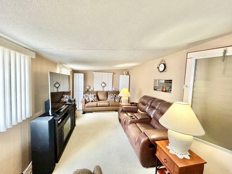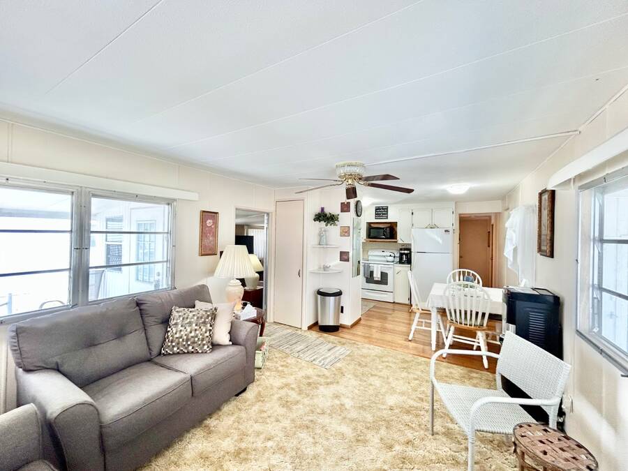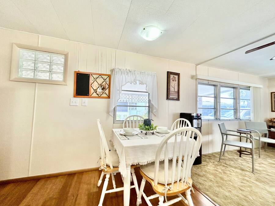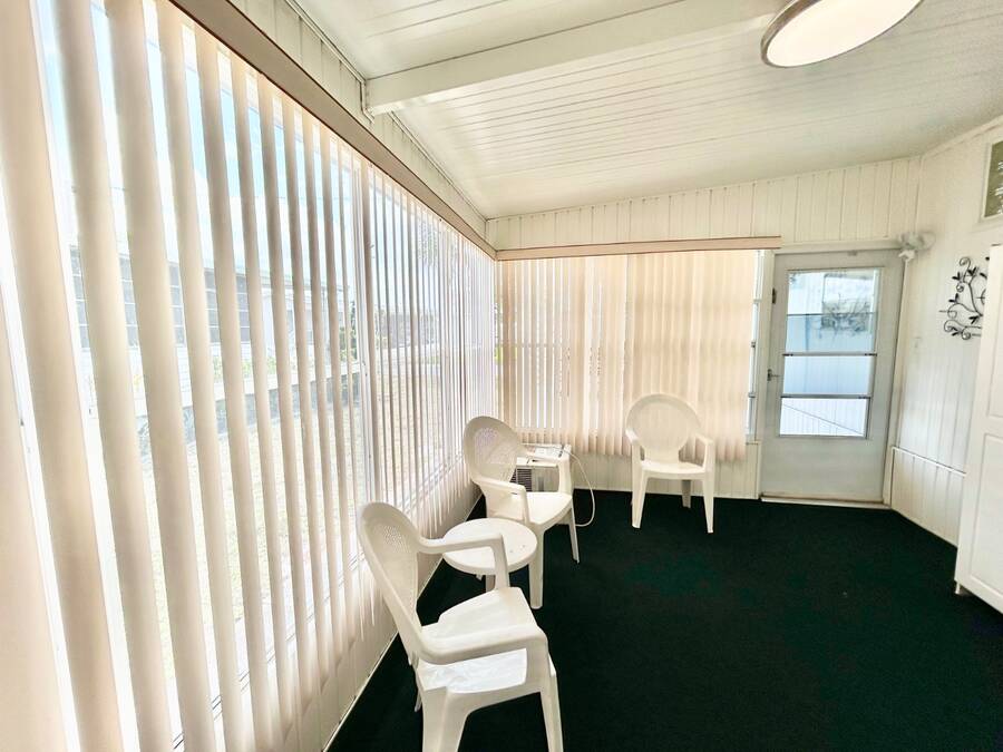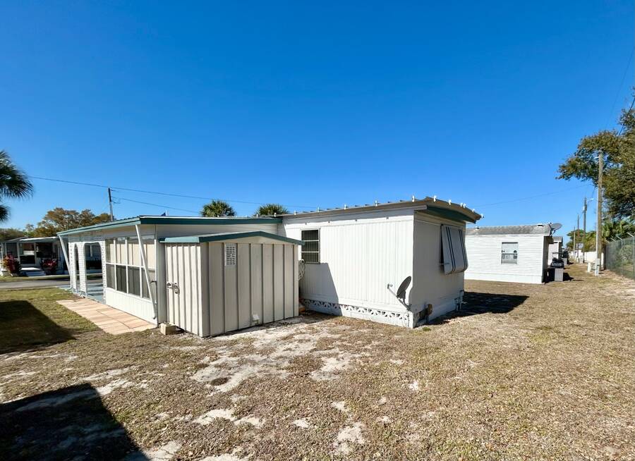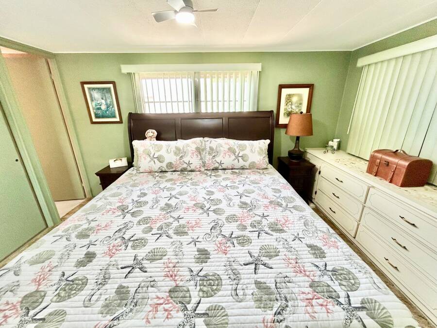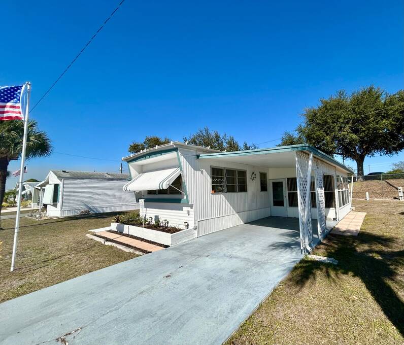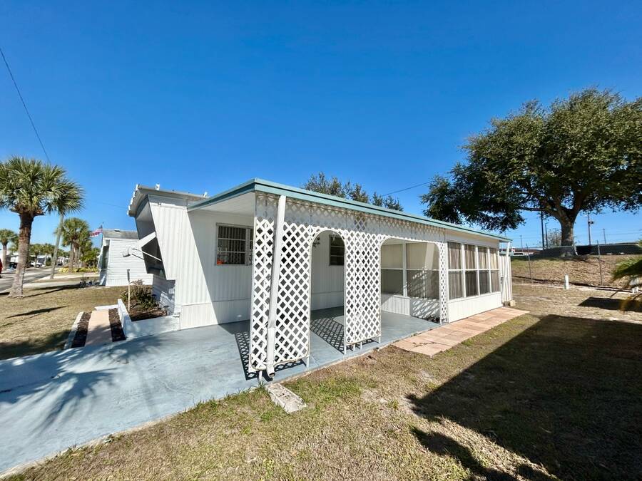 Step into comfort and convenience with this charming 1-bedroom 1-bath fully furnished mobile home perfect for year-round living or a peaceful seasonal retreat. Total living 902 square foot . The bedroom includes a king size bed with ample closet and storage spaces. Enjoy a bright and spacious living room with updated couch and love seat (May 2023), Florida Room with extra space two couches with a sleeper and an area for a computer desk, an additional enclosed porch with refrigerator, and a front porch ideal for morning coffee or evening sunsets. The home features central air and heat, a laundry/storage shed, and three hurricane shutters for added peace of mind. Recent upgrades include new bathroom floors installed in 2024. Located in a well-maintained community. The community amenities include: HEATED POOL - SHUFFLEBOARD COURTS - FITNESS CENTER - BILLARDS ROOM - CHIPPING GREEN - LIBRARY - NATURE PRESERVE - CLUBHOUSE - HOBBY ROOM - HORSESHOE PITS - CORNHOLE - COIN LAUNDRY - FREE WIFI (POOL PATIO) - FISH CLEANING STATION. Lot Rent - $523 includes amenities, lawn care, water, & sewer. Don't miss out-schedule an appointment today! Hablamos espanol. Please note: this is a no-pet community.