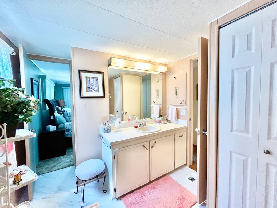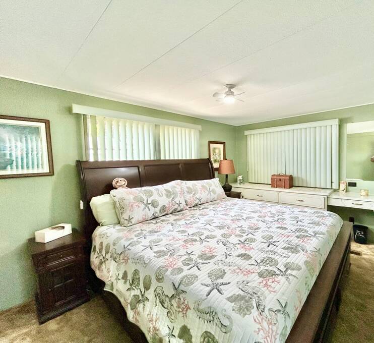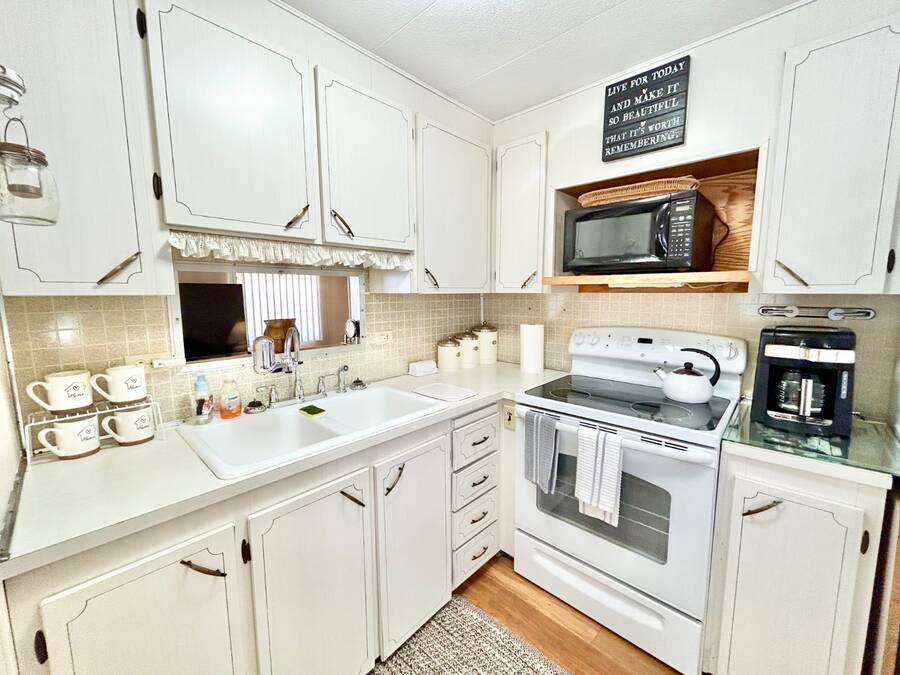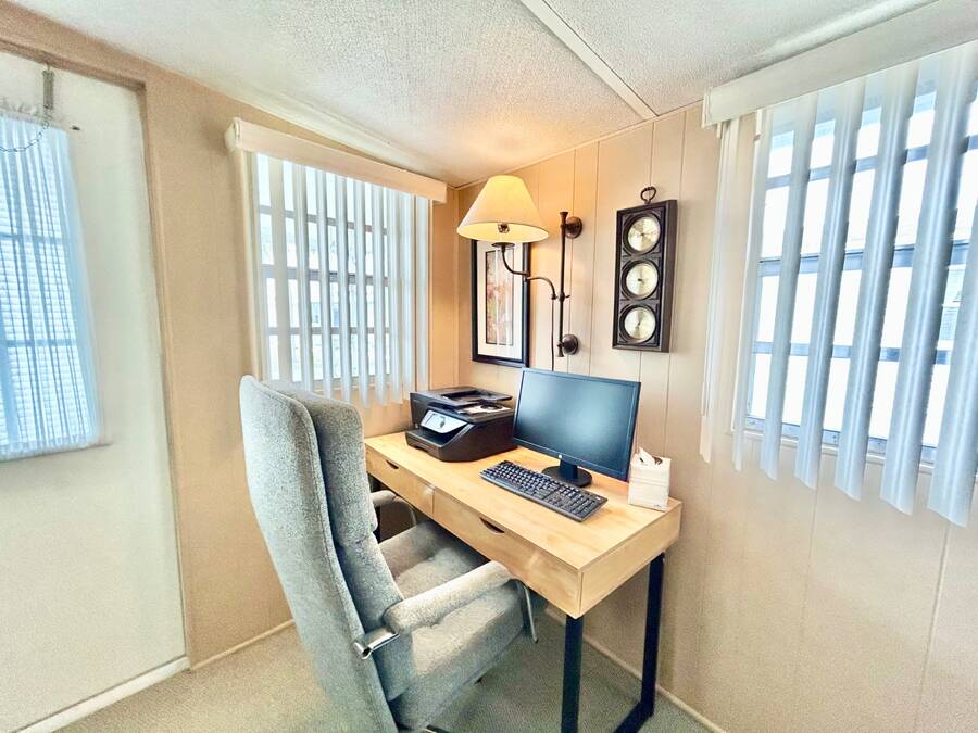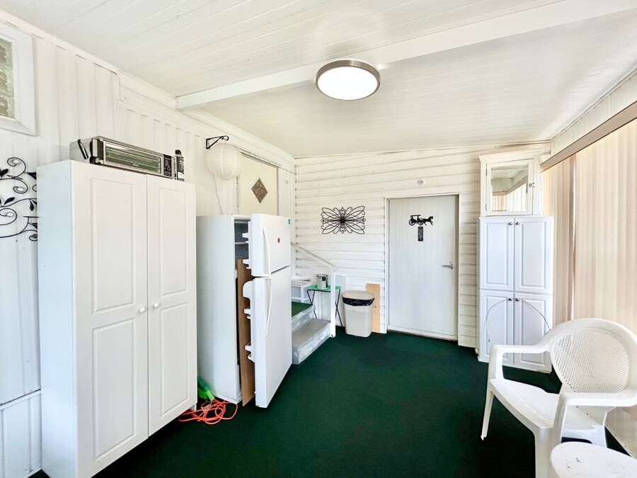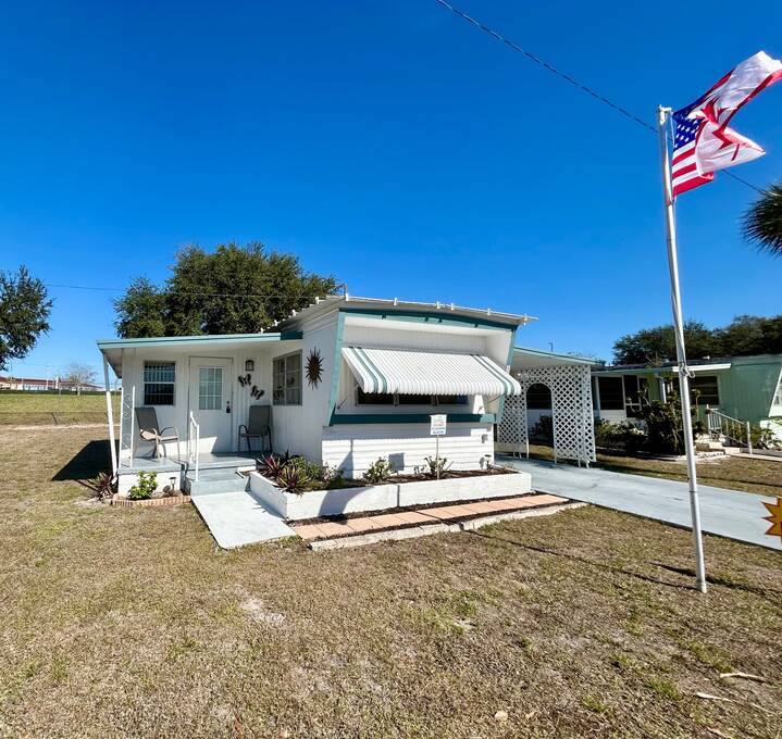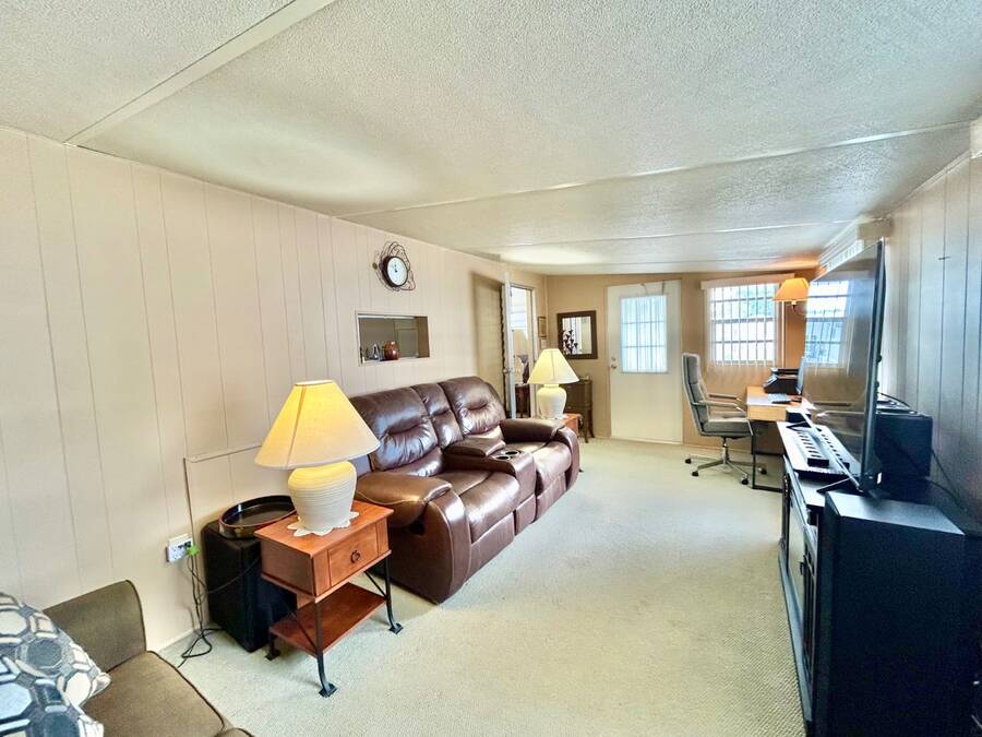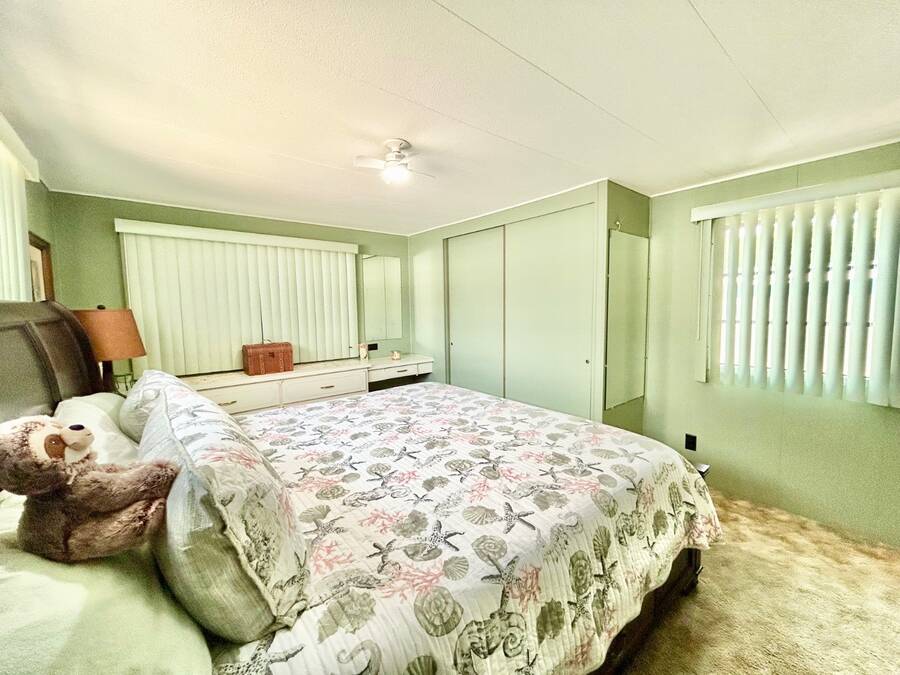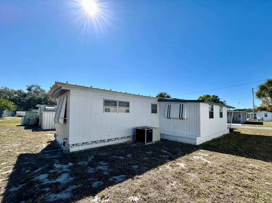 Step into comfort and convenience with this charming 1-bedroom 1-bath fully furnished mobile home perfect for year-round living or a peaceful seasonal retreat. Total living 902 square foot . The bedroom includes a king size bed with ample closet and storage spaces. Enjoy a bright and spacious living room with updated couch and love seat (May 2023), Florida Room with extra space two couches with a sleeper and an area for a computer desk, an additional enclosed porch with refrigerator, and a front porch ideal for morning coffee or evening sunsets. The home features central air and heat, a laundry/storage shed, and three hurricane shutters for added peace of mind. Recent upgrades include new bathroom floors installed in 2024. Located in a well-maintained community. The community amenities include: HEATED POOL - SHUFFLEBOARD COURTS - FITNESS CENTER - BILLARDS ROOM - CHIPPING GREEN - LIBRARY - NATURE PRESERVE - CLUBHOUSE - HOBBY ROOM - HORSESHOE PITS - CORNHOLE - COIN LAUNDRY - FREE WIFI (POOL PATIO) - FISH CLEANING STATION. Lot Rent - $523 includes amenities, lawn care, water, & sewer. Don't miss out-schedule an appointment today! Hablamos espanol. Please note: this is a no-pet community.