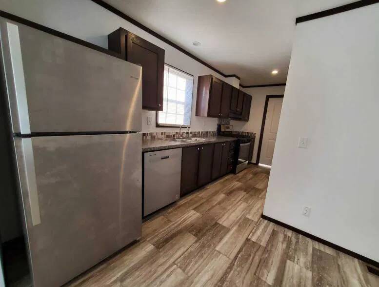 Sleek Kitchen – Includes dark wood cabinetry, marble-look countertops, and stainless steel appliances including refrigerator, dishwasher, and gas stove.