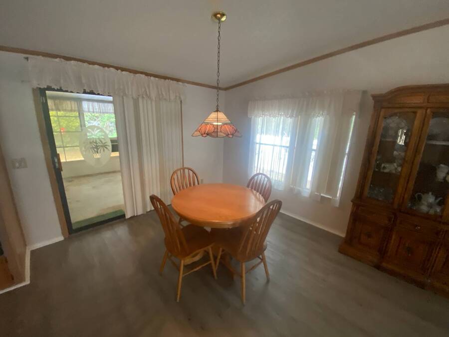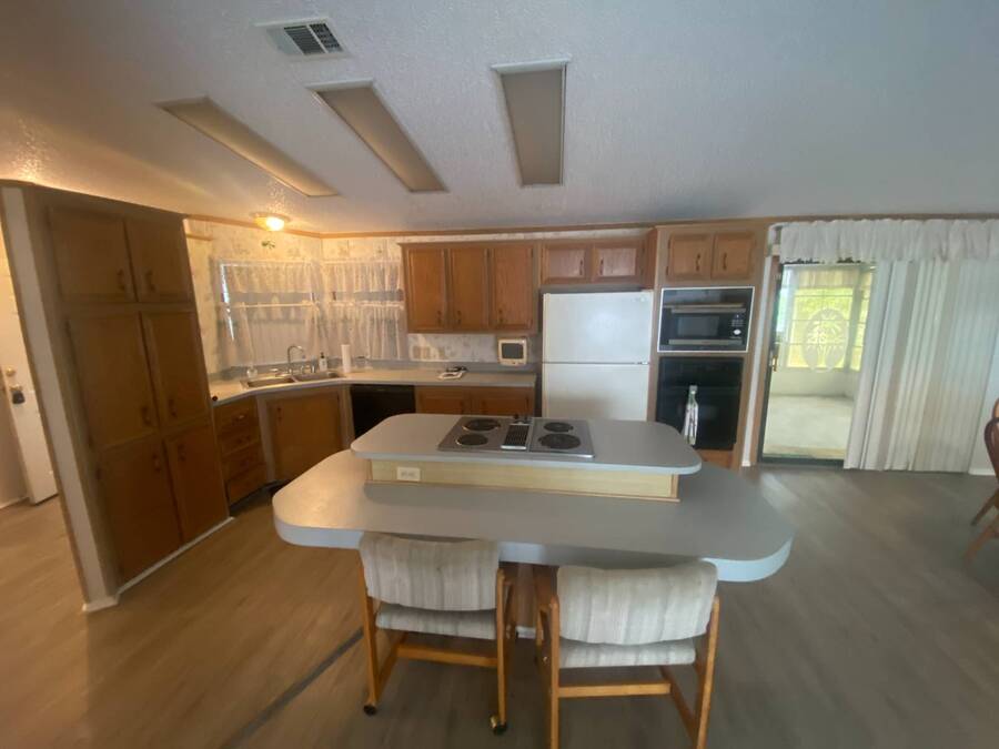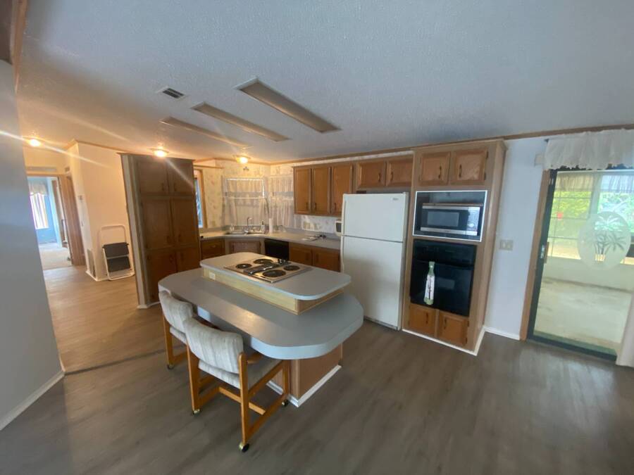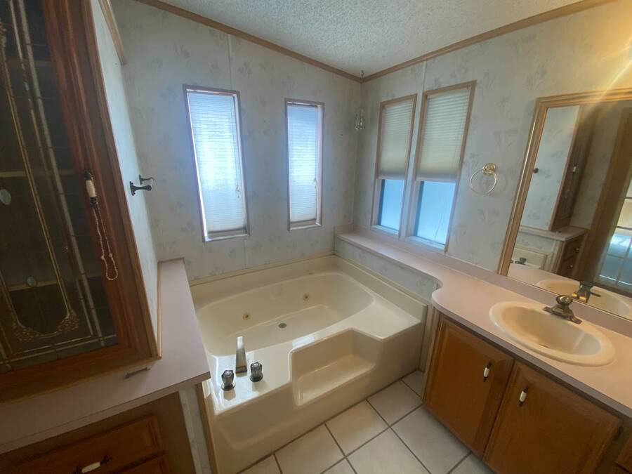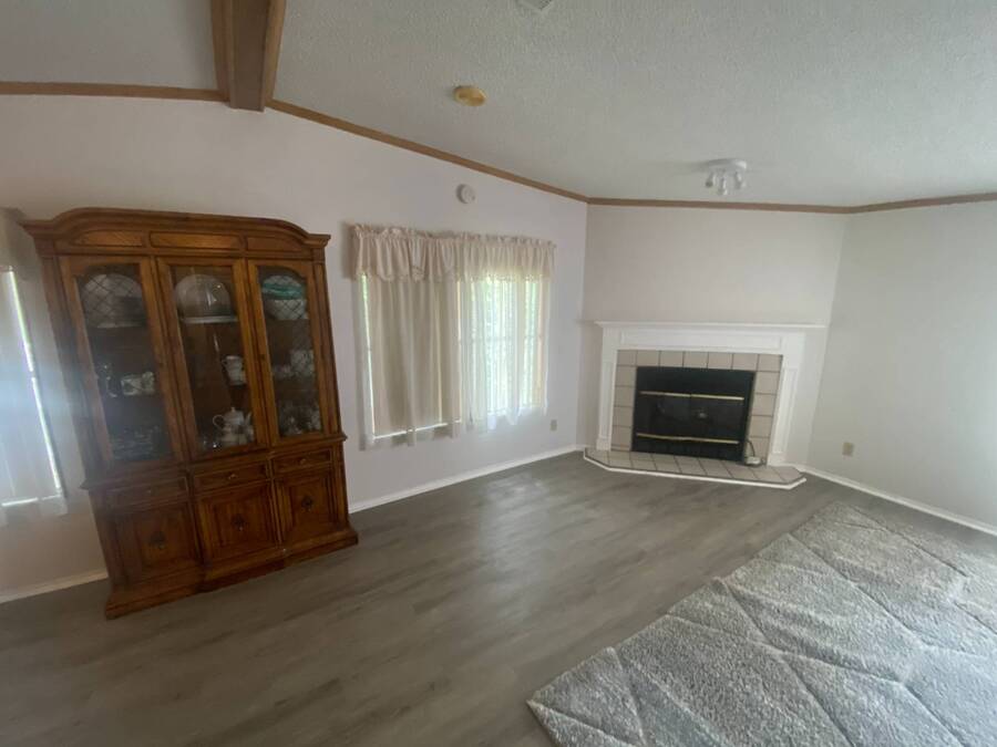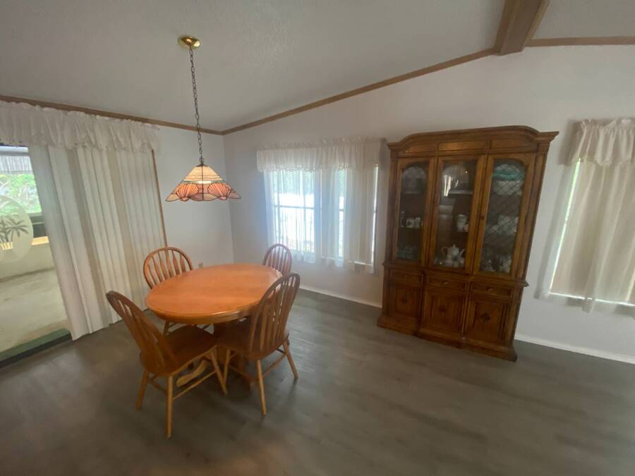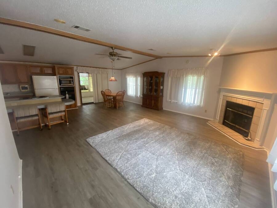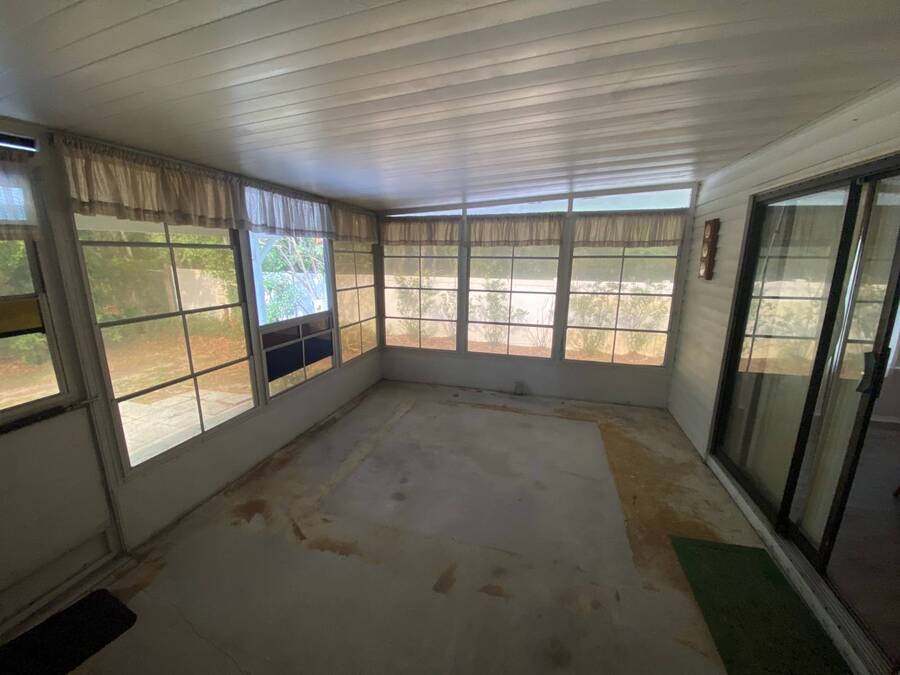End of the Street Privacy! Nice Big 2/2 in Bayonet Point Village Best Location In the park! This unit is located in the very back of the development giving extra privacy and solitude. Large home with 2 big bedrooms, big living room, cathedral ceilings and open floor plan, fireplace, enclosed lanai as well as private covered porch. Nice big kitchen with lots of cupboard and cabinet space. All appliances will remain. 2 Car wide driveway with 2 car carport plus golf cart garage. Big master bedroom with French doors to en suite bath. Laundry room inside the unit, no going outside to do wash. This is a really comfortable home with cathedral ceilings and great open feeling. Lot rent for 2027 will be $999 and includes basic cable and internet with Spectrum, lawn care, trash, and sewer, along with nice clubhouse and heated pool. Call Today!