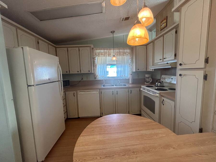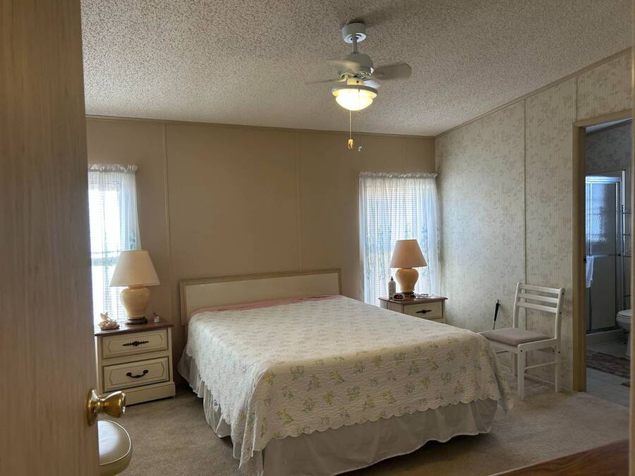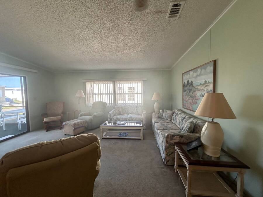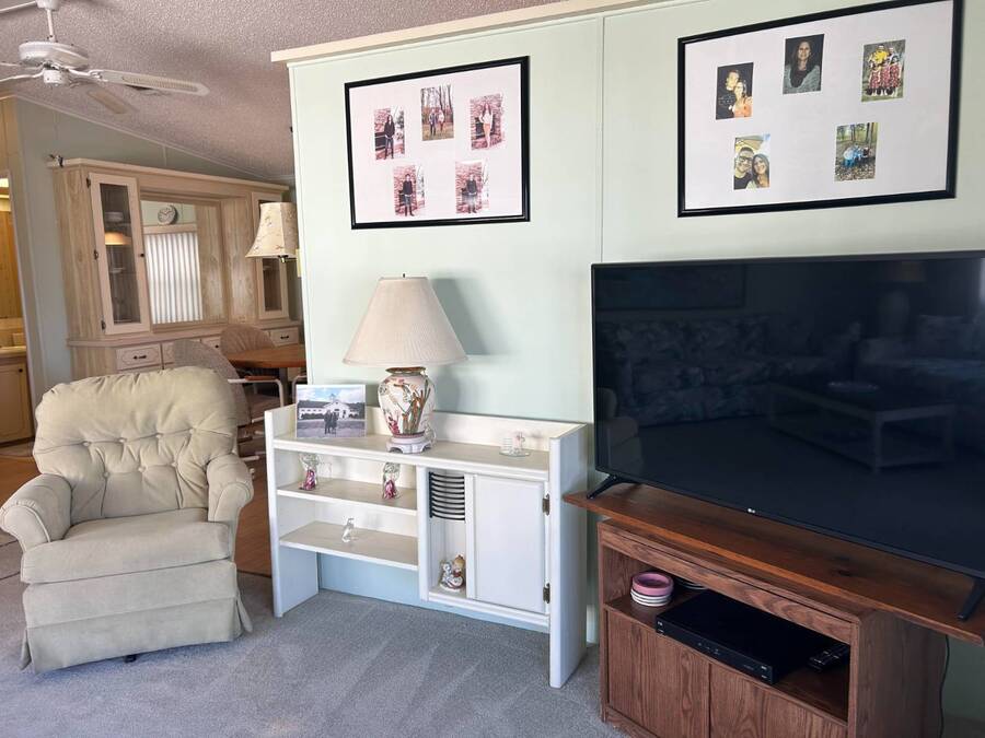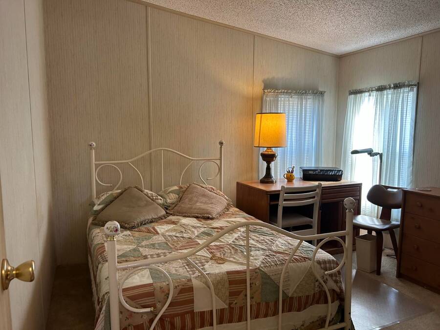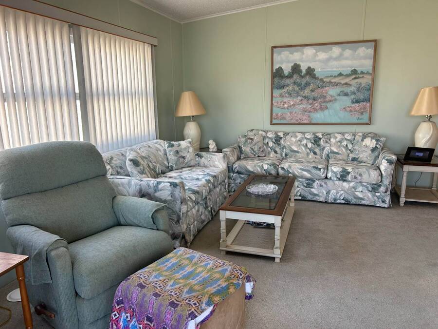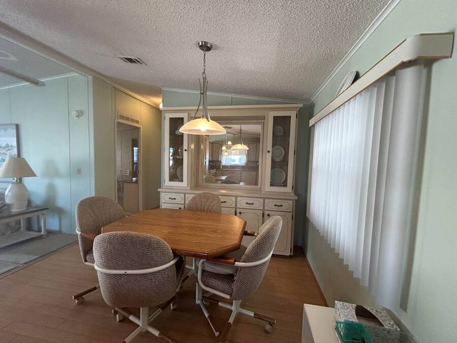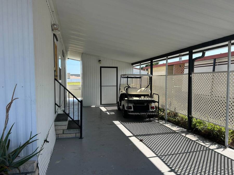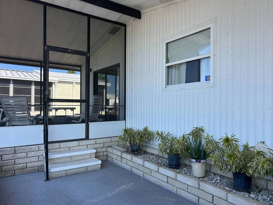 Located on the beautifully manicured street, a charming two-bedroom, two-bathroom home offers a perfect blend of comfort, style, and practicality. The property features a welcoming front enclosed lanai that exudes the charm of relaxed Florida living. Fully turnkey and tastefully furnished, the home is move-in ready. The flooring includes carpeting in the bedrooms and living room, while durable laminate flooring enhances the kitchen, dining area, and hallway. There is also a new roof replaced in November 2024. The home's exterior is equally inviting, with the covered carport providing ample parking and golf cart is negotiable. A spacious shed houses the washer and dryer and tools, offering both convenience and functionality. Inside, the curved kitchen features a bright window above the double sink, allowing natural light to stream in. With plenty of cabinet and counter space, and a separate counter area ideal for casual dining or internet browsing, the kitchen is both practical and welcoming. The adjacent dining area accommodates a table for four, along with a server and a built-in hutch. The large living room has a sofa, two recliners, and a TV, providing ample space for relaxation or entertaining. Sliding doors open into the lanai. The home features double-pane windows throughout. The primary bathroom includes a tub/shower combination and vanity. The guest bedroom has room for a queen bed and offers a large closet for storage. The master suite, designed for comfort, includes a queen bed with space for a king and a large walk-in closet. The ensuite bathroom features a walk-in shower with glass doors and a vanity. This home has everything needed for a comfortable and relaxed lifestyle, offering a welcoming atmosphere, abundant storage, and a thoughtful layout. This Community is an age-qualified resort community of manufactured.mobile homes. There are two recreation halls, one attached to the pool area. A very nice relaxing pool overlooking the lake which was just redone. Four stocked lakes for fishing, exercise room, laundromat, workshop for residents, shuffleboard with newly built thatched roofs for shade, pickle ball court, corn hole, two tiki bars, dog park, and lots of clubs and activities. The park has a very warm, inviting community feel. The lot rent is based on the home's location. Not only does the monthly lot rent cover all amenities listed, it also covers almost all other monthly expenses such as; trash pickup, all property taxes, lawn maintenance and spectrum bulk package. All listing information given to us is considered appropriate and reliable but always recommended home inspections by independent companies who have a background through understanding of manufactured homes. We do not guarantee the accuracy of information given or the condition of the home. Lot rents are determined by the community office.