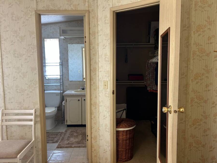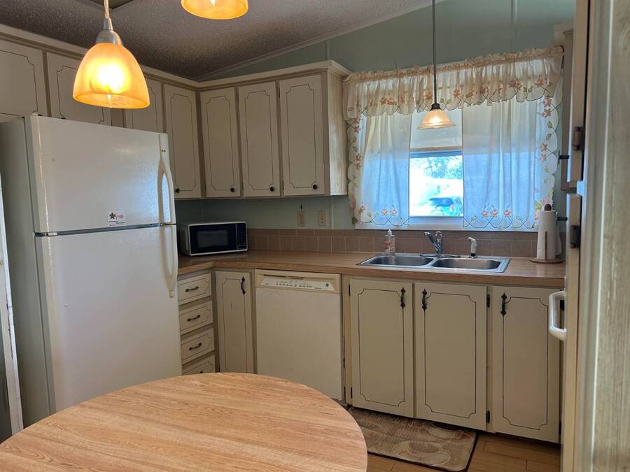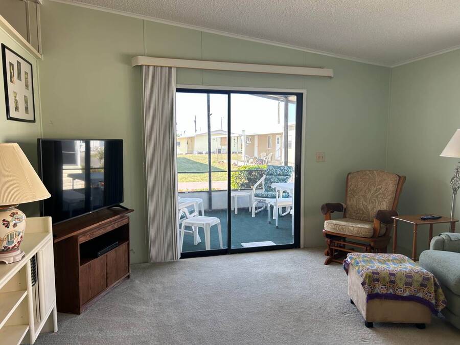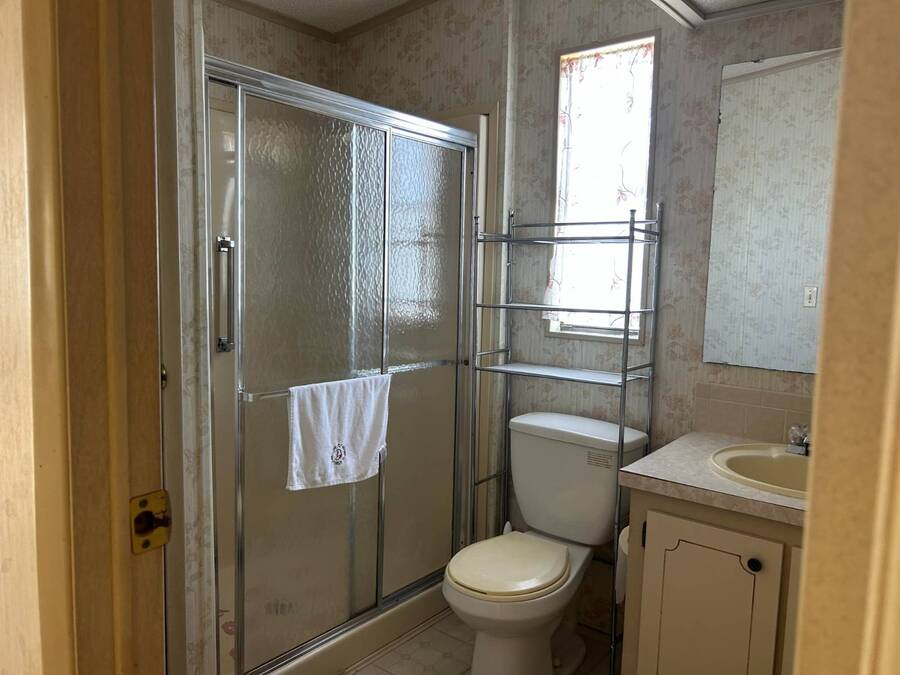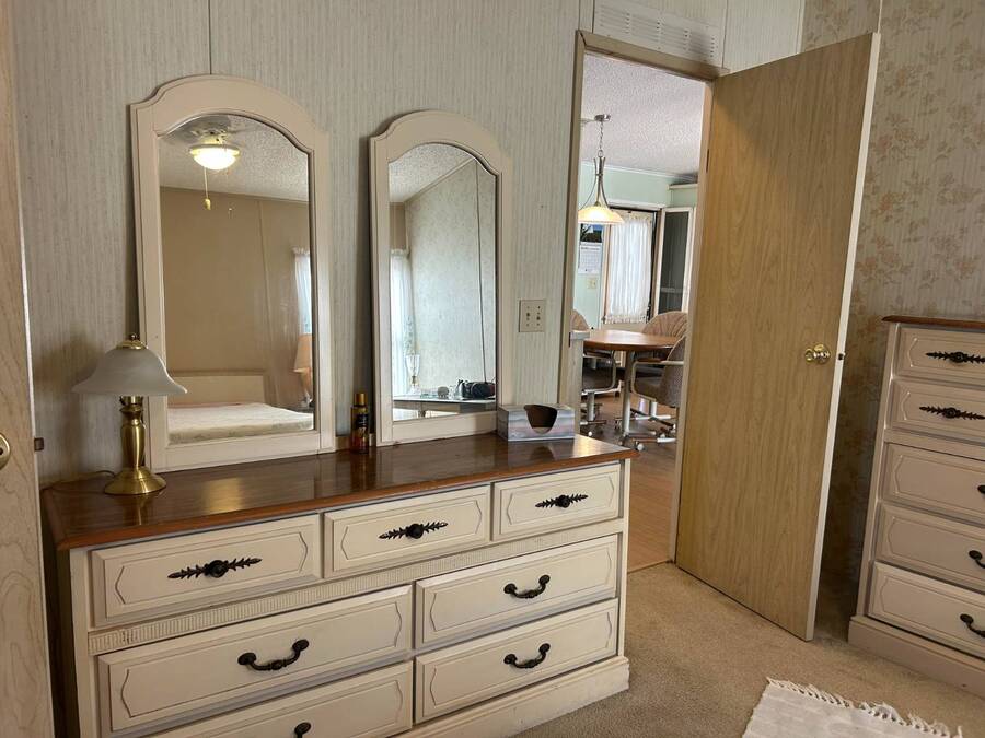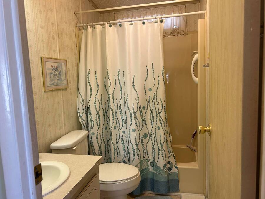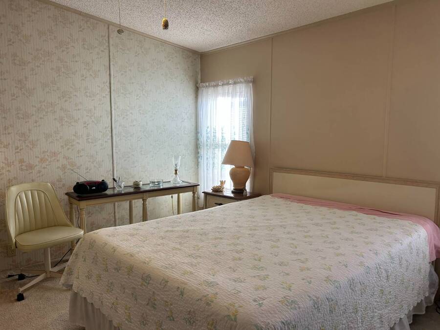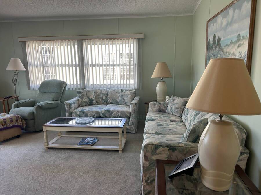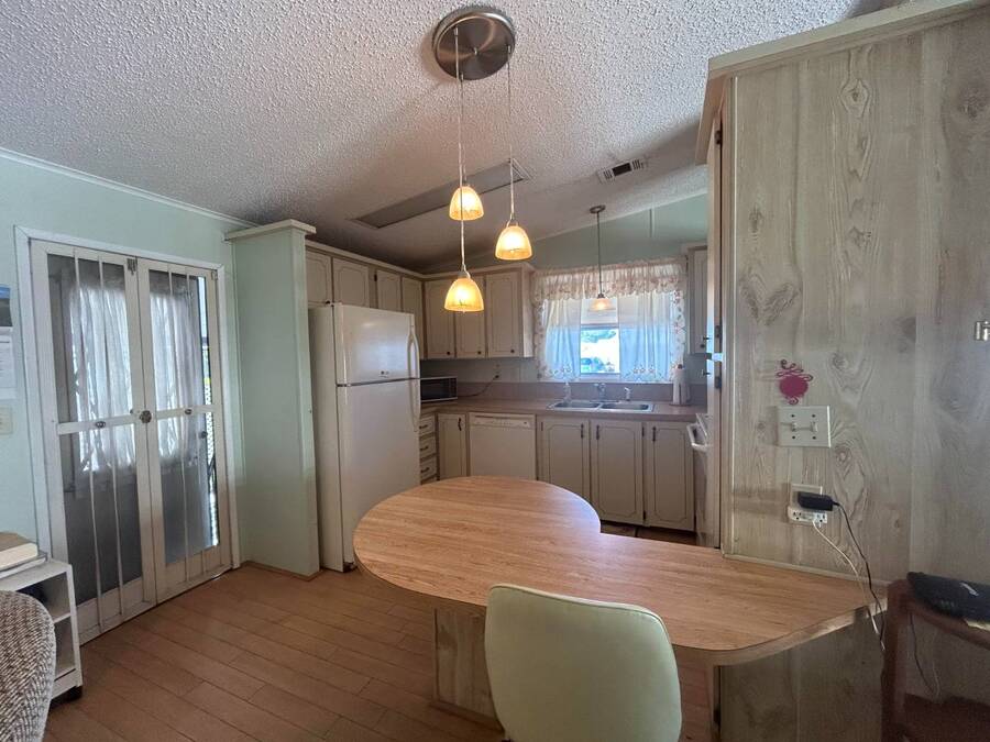 Located on the beautifully manicured street, a charming two-bedroom, two-bathroom home offers a perfect blend of comfort, style, and practicality. The property features a welcoming front enclosed lanai that exudes the charm of relaxed Florida living. Fully turnkey and tastefully furnished, the home is move-in ready. The flooring includes carpeting in the bedrooms and living room, while durable laminate flooring enhances the kitchen, dining area, and hallway. There is also a new roof replaced in November 2024. The home's exterior is equally inviting, with the covered carport providing ample parking and golf cart is negotiable. A spacious shed houses the washer and dryer and tools, offering both convenience and functionality. Inside, the curved kitchen features a bright window above the double sink, allowing natural light to stream in. With plenty of cabinet and counter space, and a separate counter area ideal for casual dining or internet browsing, the kitchen is both practical and welcoming. The adjacent dining area accommodates a table for four, along with a server and a built-in hutch. The large living room has a sofa, two recliners, and a TV, providing ample space for relaxation or entertaining. Sliding doors open into the lanai. The home features double-pane windows throughout. The primary bathroom includes a tub/shower combination and vanity. The guest bedroom has room for a queen bed and offers a large closet for storage. The master suite, designed for comfort, includes a queen bed with space for a king and a large walk-in closet. The ensuite bathroom features a walk-in shower with glass doors and a vanity. This home has everything needed for a comfortable and relaxed lifestyle, offering a welcoming atmosphere, abundant storage, and a thoughtful layout. This Community is an age-qualified resort community of manufactured.mobile homes. There are two recreation halls, one attached to the pool area. A very nice relaxing pool overlooking the lake which was just redone. Four stocked lakes for fishing, exercise room, laundromat, workshop for residents, shuffleboard with newly built thatched roofs for shade, pickle ball court, corn hole, two tiki bars, dog park, and lots of clubs and activities. The park has a very warm, inviting community feel. The lot rent is based on the home's location. Not only does the monthly lot rent cover all amenities listed, it also covers almost all other monthly expenses such as; trash pickup, all property taxes, lawn maintenance and spectrum bulk package. All listing information given to us is considered appropriate and reliable but always recommended home inspections by independent companies who have a background through understanding of manufactured homes. We do not guarantee the accuracy of information given or the condition of the home. Lot rents are determined by the community office.