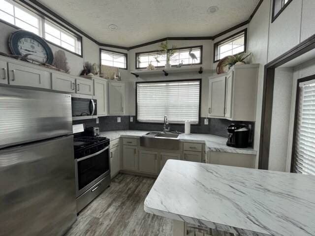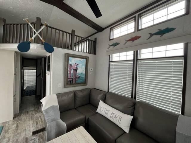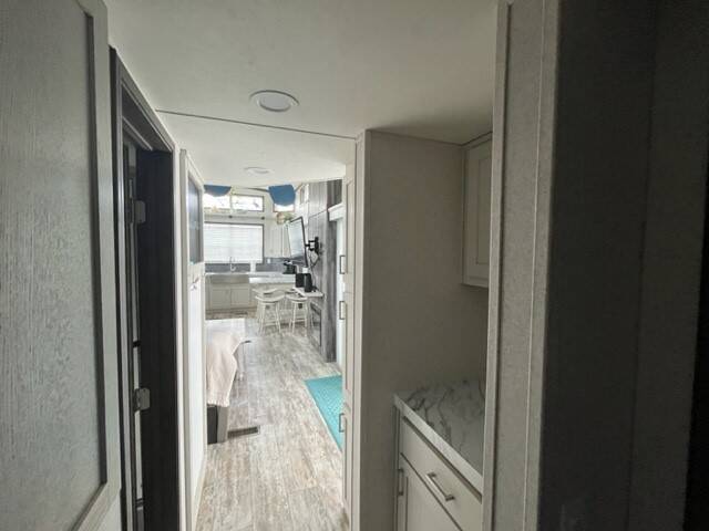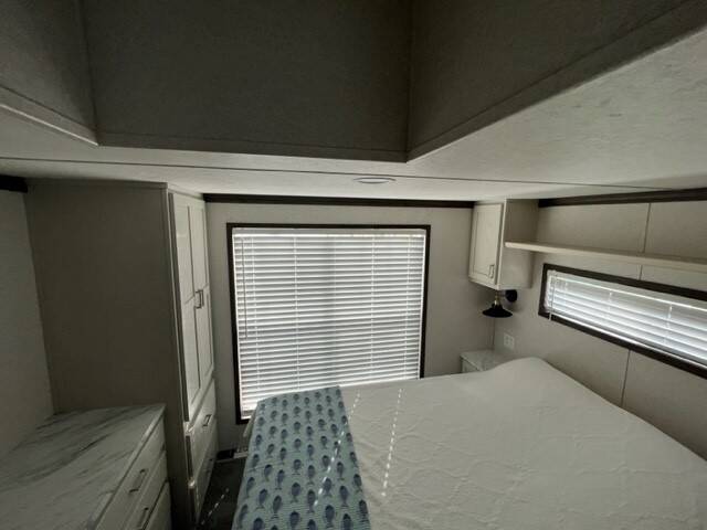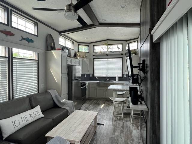 This 399 sq foot, 1.0 bed 1.0 bath Park Model home at Bogue Sound in Cedar Point, NC is a cozy and modern dwelling perfect for a couple or small family. Built in 2021 by Country Manor, the home boasts a spacious living room, master bedroom, kitchen, breakfast nook, and loft for extra storage or sleeping space. The exterior features a shed, deck, roof over, open porch, and vinyl siding, providing a durable and attractive exterior. Inside, the home is equipped with stainless steel appliances including an oven, fridge, and microwave, as well as a hot water heater, central A/C, heat pump, and electric heating.