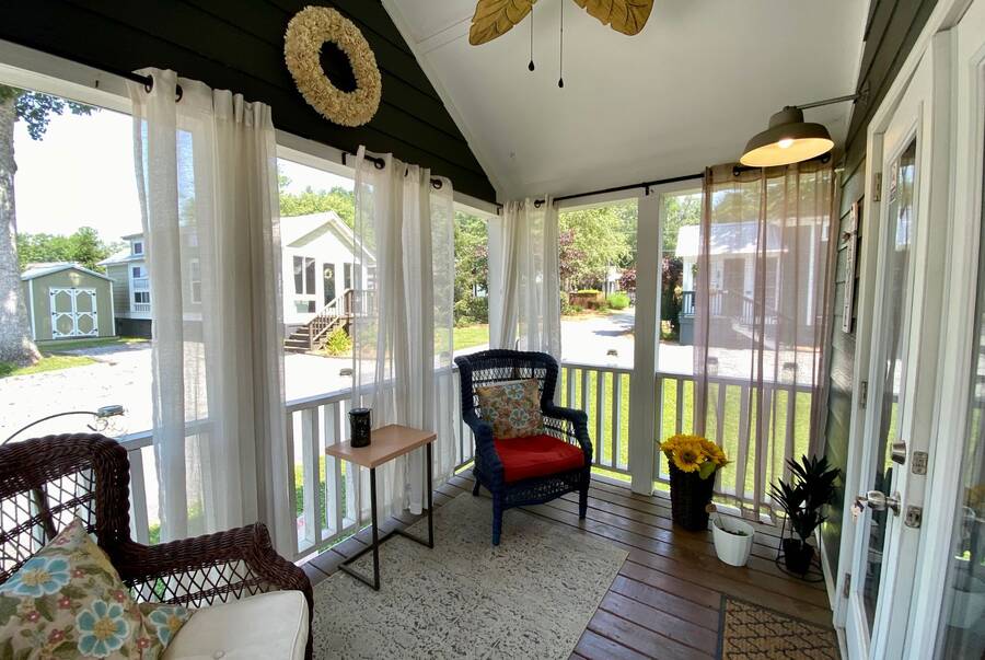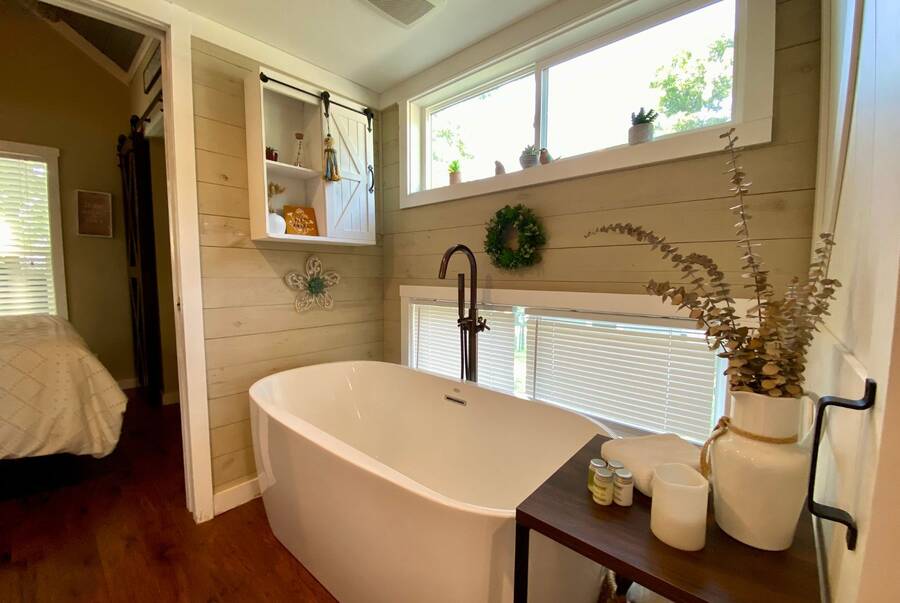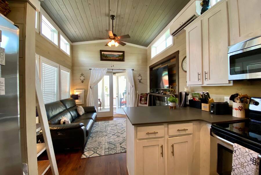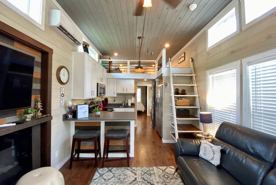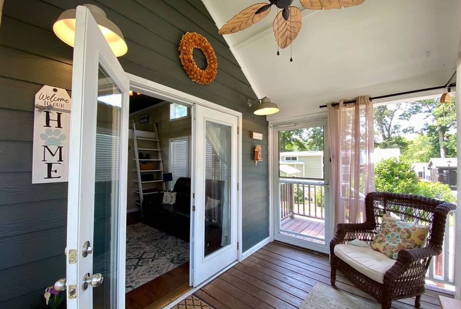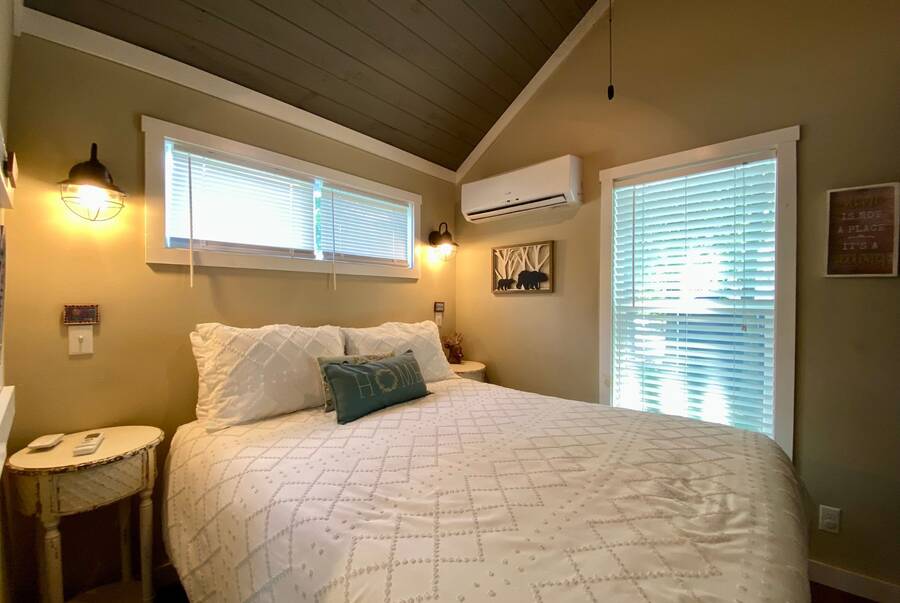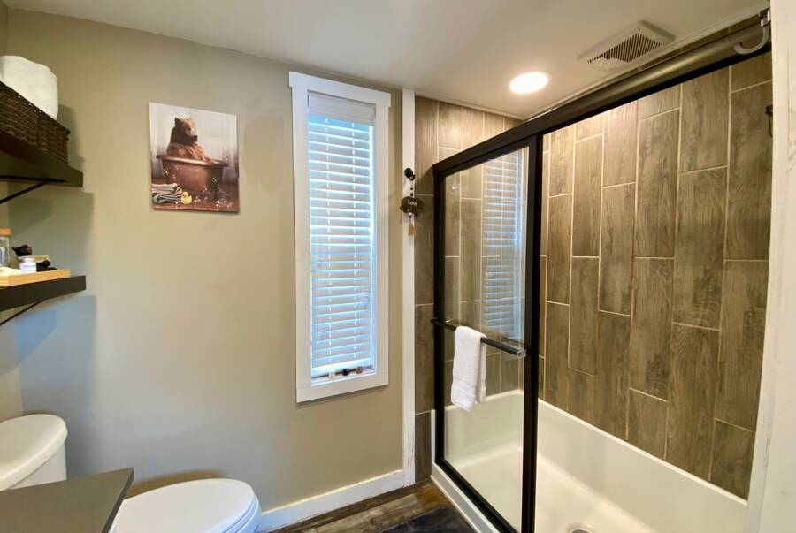 Step into this thoughtfully designed 1 bedroom, 1 bathroom tiny home with a cozy loft perfect for guests, storage, or a reading nook. The main bathroom features a luxurious soaking tub—ideal for unwinding after a long day. Inside, the open-concept living area offers a warm and inviting space with furniture included and plenty of natural light. Step outside to a charming screened porch, perfect for morning coffee or evening relaxation, and enjoy the added convenience of a spacious outdoor shed for extra storage. This tiny home combines comfort, style, and smart living—all in one beautiful package