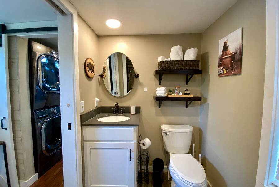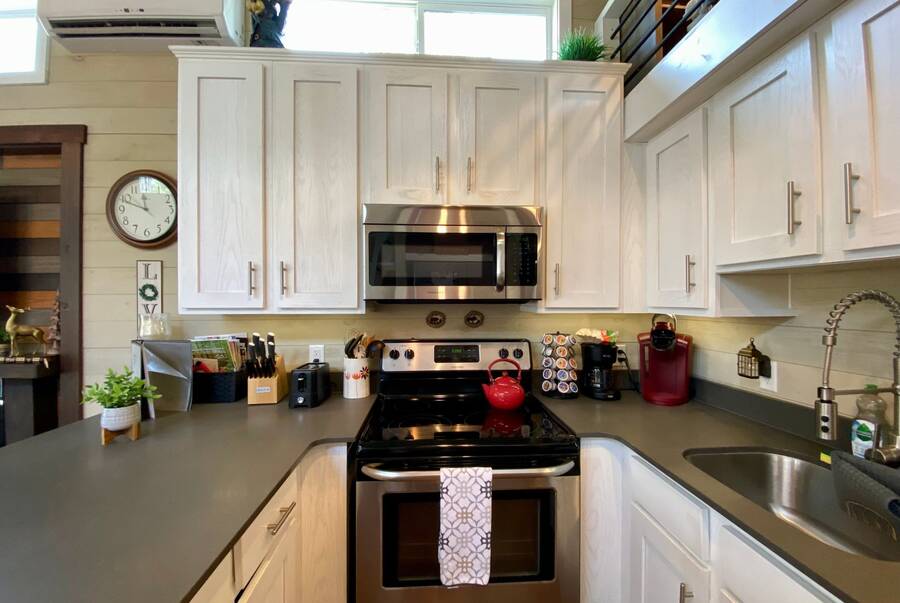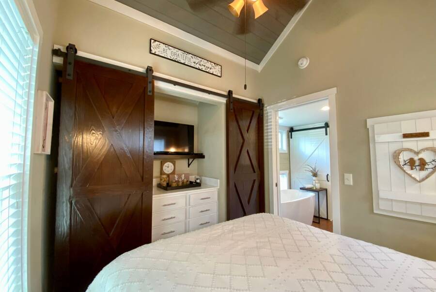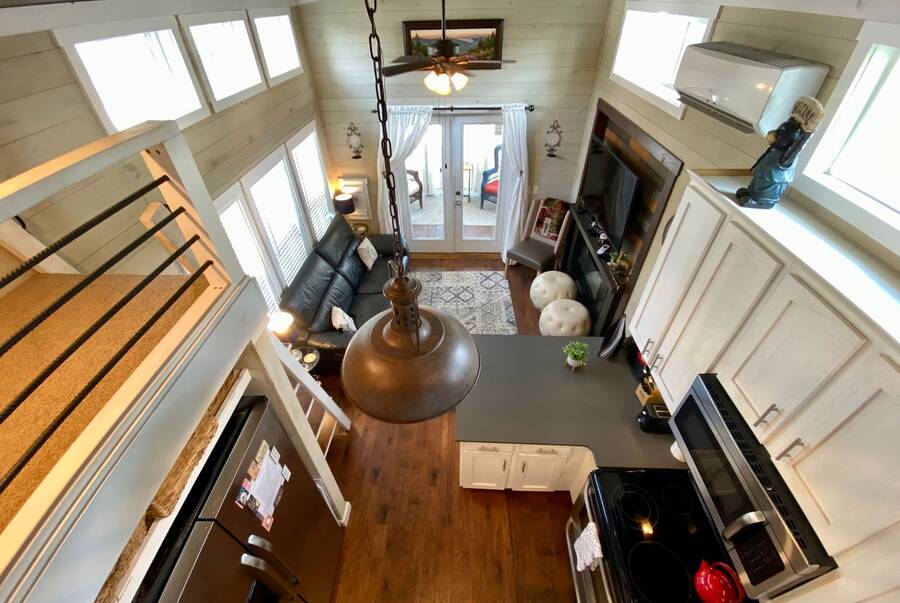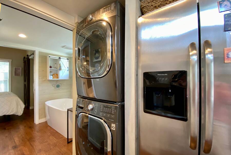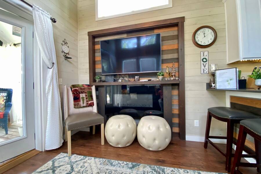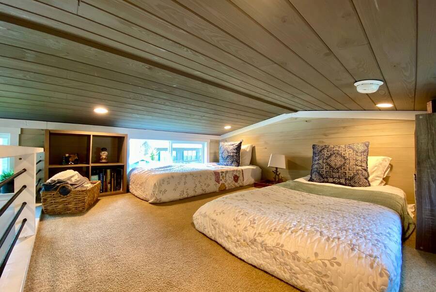 Step into this thoughtfully designed 1 bedroom, 1 bathroom tiny home with a cozy loft perfect for guests, storage, or a reading nook. The main bathroom features a luxurious soaking tub—ideal for unwinding after a long day. Inside, the open-concept living area offers a warm and inviting space with furniture included and plenty of natural light. Step outside to a charming screened porch, perfect for morning coffee or evening relaxation, and enjoy the added convenience of a spacious outdoor shed for extra storage. This tiny home combines comfort, style, and smart living—all in one beautiful package