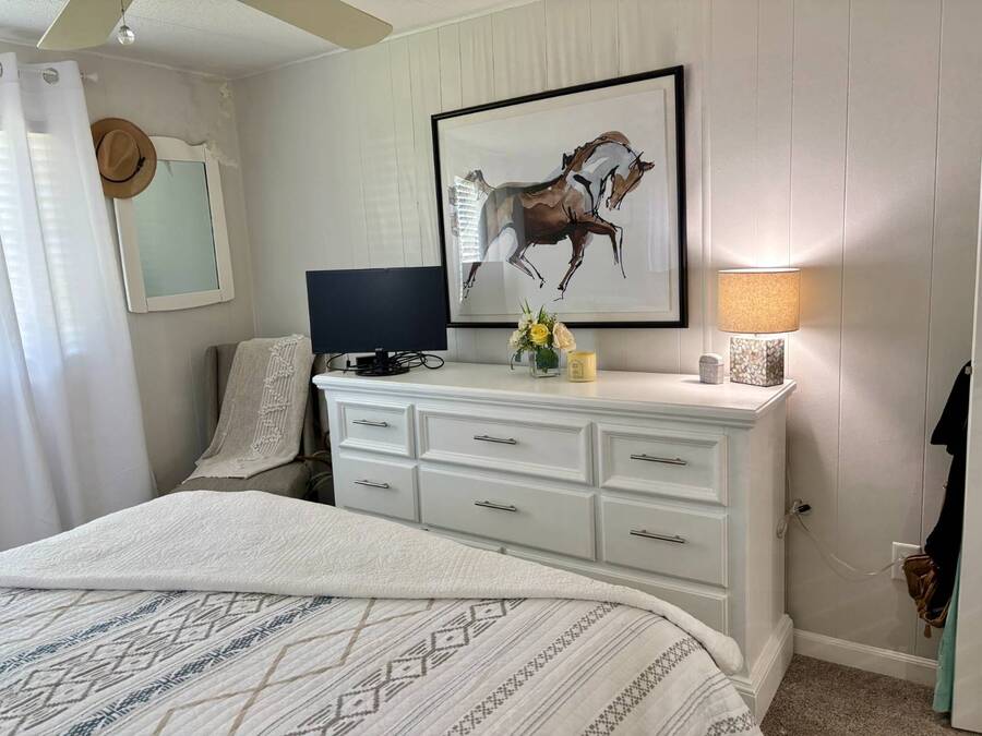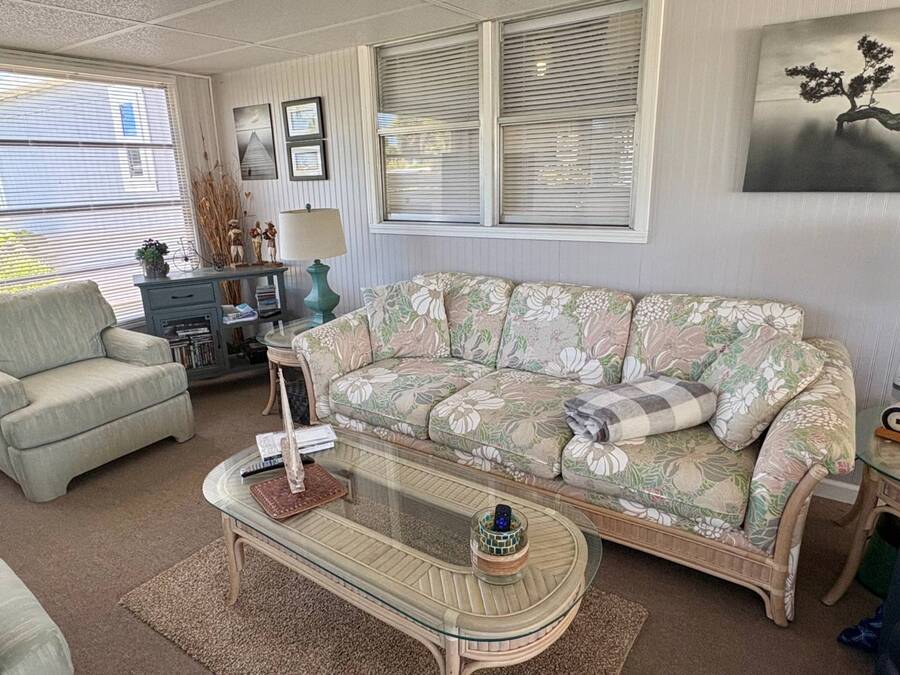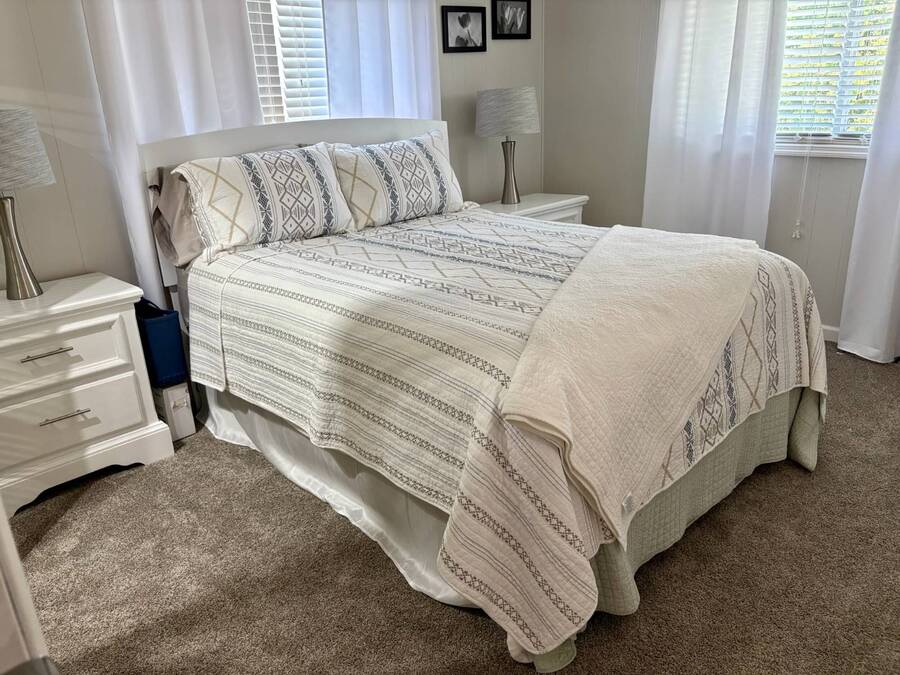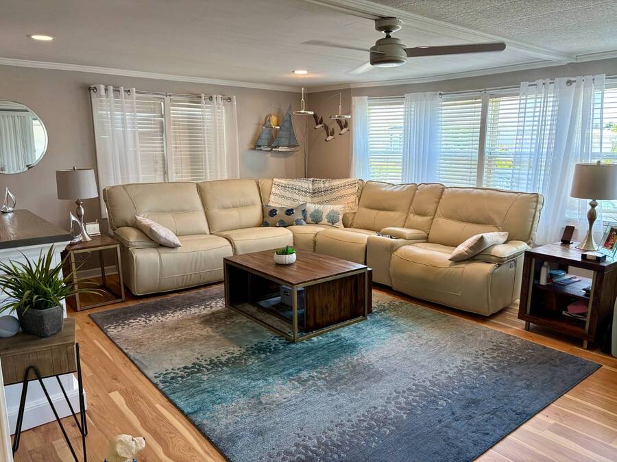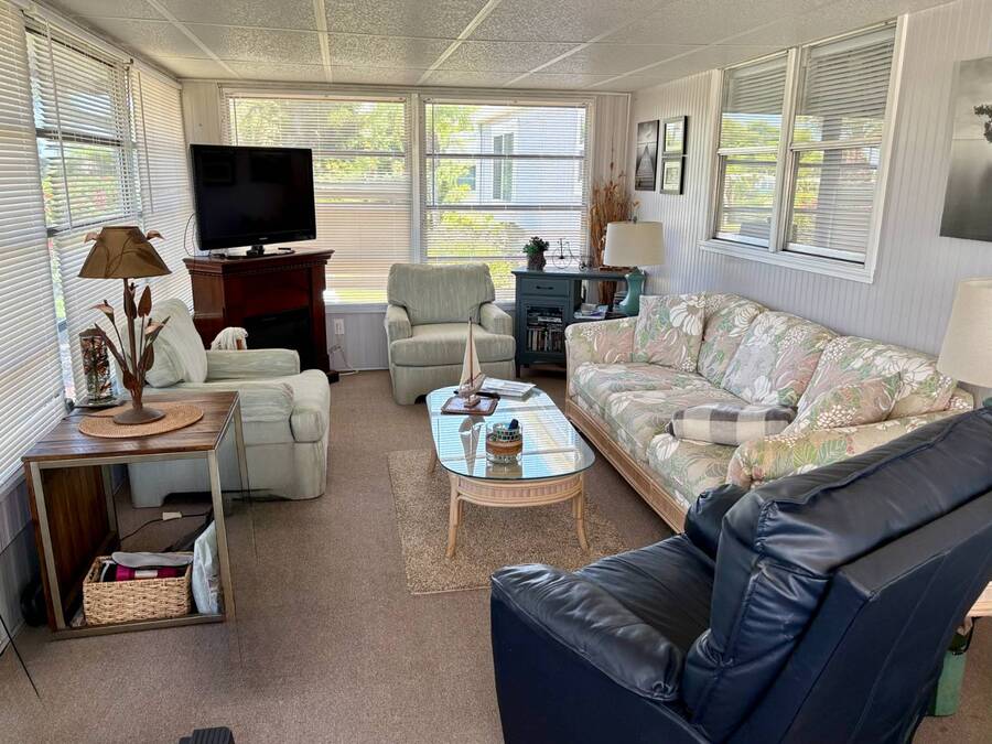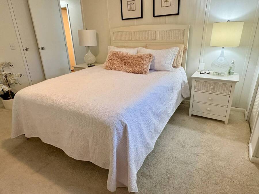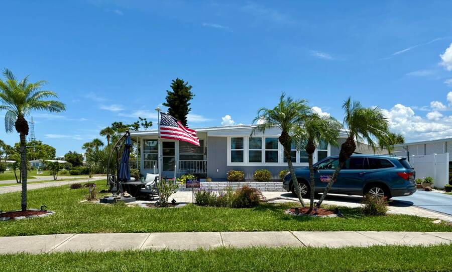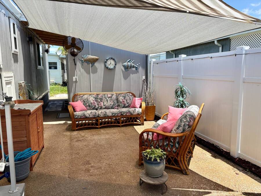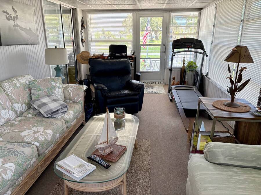 Renovated Coastal Retreat in the Heart of Bay Indies! Welcome to 951 Lucaya E., a rare gem tucked into the vibrant Bay Indies 55+ Resort Community-where relaxation meets active Florida living just 2 miles from Venice's famous white sand beaches and charming downtown district. Surrounded by world-class dining, boutique shopping, golf, and boating, this location checks every box. Travel with ease on golf carts with a motorcycle-friendly street, and enjoy the added convenience of RV and boat storage just down the road. Life here is both adventurous and effortlessly relaxed, with a plethora of resort-style amenities designed to keep you engaged or help you unwind at your own pace. Situated on a desirable corner lot, this fully renovated 24' x 50' home exudes curb appeal with an extra-wide custom paver driveway offering extra parking, and stylish outdoor seating area-perfect for sunset cocktails or morning coffee under the umbrella. Step inside and experience a home that rivals a new build with all the modern upgrades. The semi open-concept kitchen with granite counters, ceramic tile backsplash and flooring, black/stainless appliances, and wood-stained cabinetry with pendant lighting. 5 burner stove and small island offering extra seating. The dining area for 4 has a built-in wall unit for displays and added storage. The large living space features a plush sectional, leather chair, electric fireplace and large-screen TV. Also having recessed lighting. The inviting Florida lanai with carpeting, crank-out jalousie windows, desk nook, blinds, and a second electric fireplace for year-round comfort plus furniture to curl up to the TV or game night. The primary suite includes a king bed, built-in dresser, multiple closets-including a spacious walk-in-and an ensuite bath with walk-in shower and black top vanity. The guest room, tastefully styled, features a queen bed and dual closets. Both bathrooms and kitchen feature tile floors, while the rest of the home shines with new subfloors and vinyl plank flooring throughout. Outside, you'll find a private carport oasis with sunshades and fencing,and a second BBQ/lounge area. The laundry shed is complete with a utility sink, washer/dryer, and storage shelves. With newer double-pane tilt-sash windows, a 2024 A/C and roof, updated shed roofing, and offered fully furnished (turnkey) minus a couple of personal items, this is a rare opportunity to own a move-in-ready masterpiece on a premium lot. The Bay Indies Community has plenty of perks; within walking distance to park activities such as, engaging with friendly neighbors at one of the clubhouses, which host regular social events, fitness classes, and hobby groups. Take a dip in one of the three resort-style pools and spas, perfect for unwinding after a day of activities. Three mile walking path just outside your door, kayak storage and launch. Stay active with a fitness center, tennis courts, pickleball and more. Just 2.5 miles to shopping, dining, medical facilities, cultural attractions, and beautiful beaches, fishing, boating and airports, everything you need is just a short drive away. A casino in Tampa and the Tiger Woods Pop Stroke 2 course putting greens in Sarasota are a must.