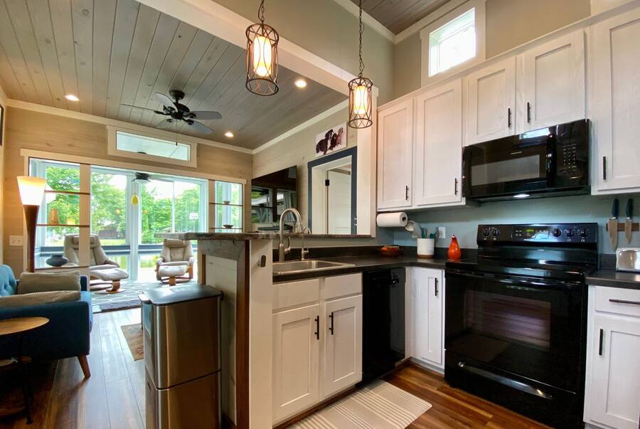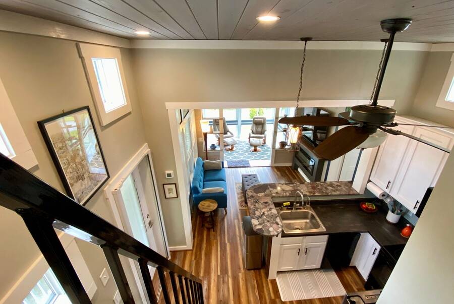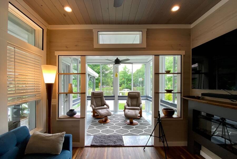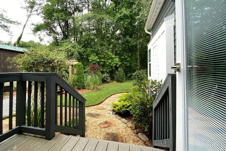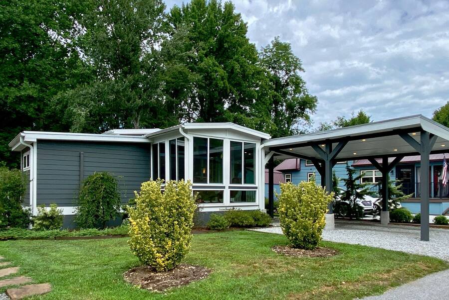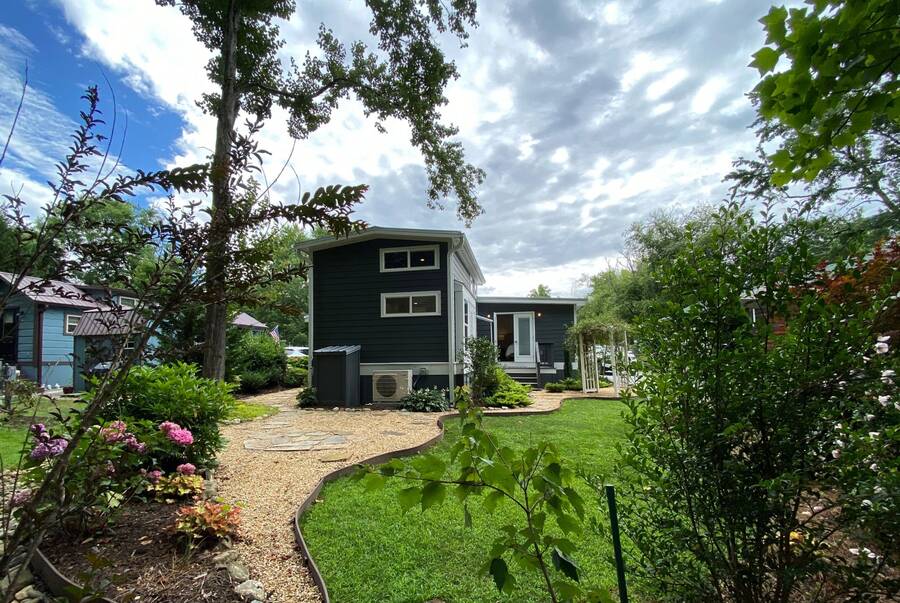 Situated in one of the most desirable areas of the community, this stunning 2 bed, 1 bath tiny home offers breath-taking pond views and a rare private, wooded backyard—perfect for relaxing, gardening, or enjoying nature in peace. Inside, you’ll find engineered hardwood floors, custom cabinetry, and rich walnut trim, shelving, and a mantel that add warmth and elegance to the spacious living room, complete with a cozy fire place. In addition, the home features a loft and abundant storage throughout, combining functionality with style. Step outside to enjoy a covered deck ideal for year-round enjoyment, plus a huge lighted carport that offers convenience and protection for your vehicle. A vapor barrier with circulation vent system underneath the home provides added durability and comfort. This home is a true gem—offering a perfect blend of luxury, functionality, and privacy. Here’s your chance to own a home in one of the most picturesque spots in the entire community!