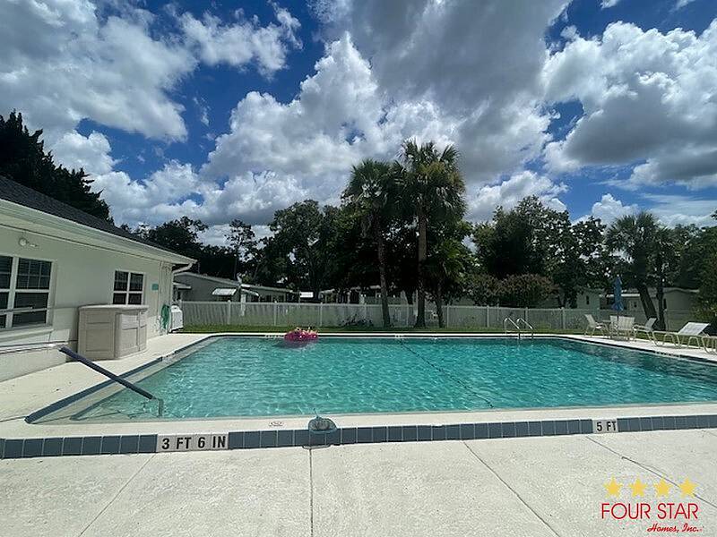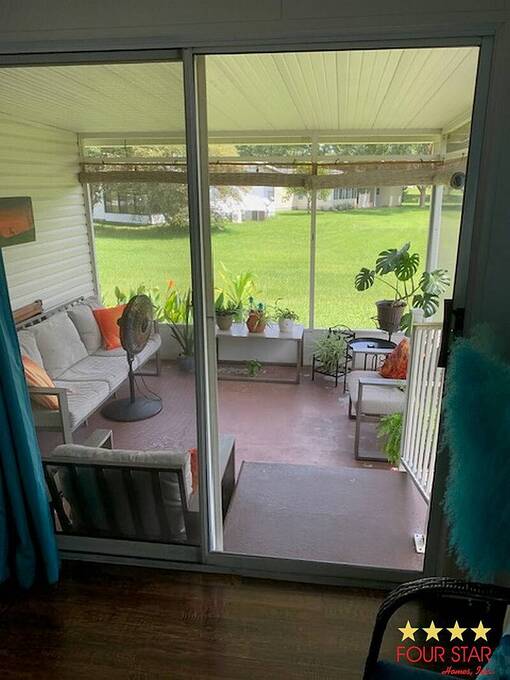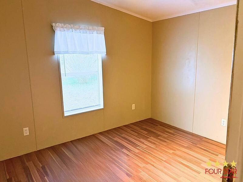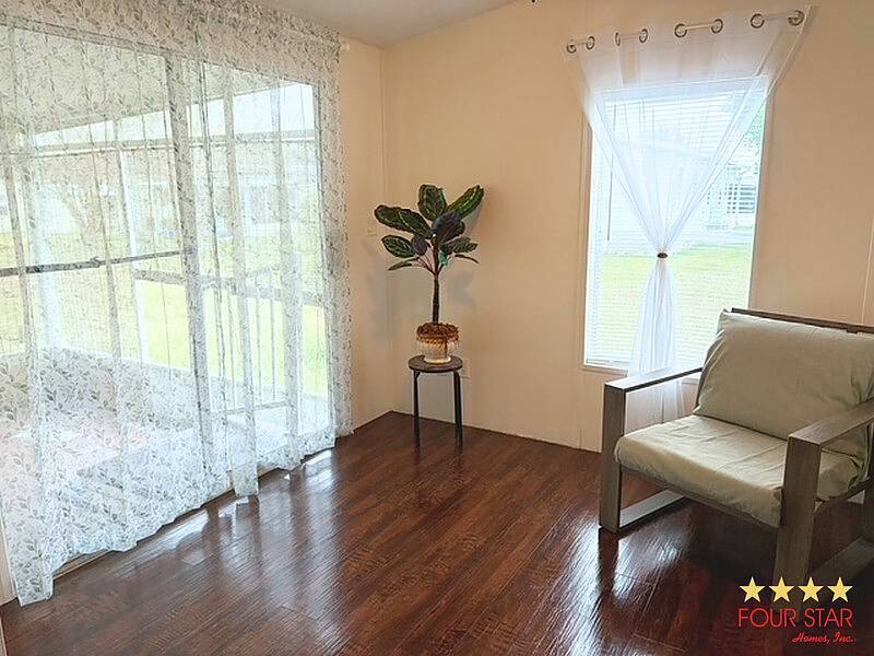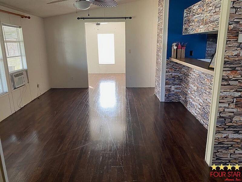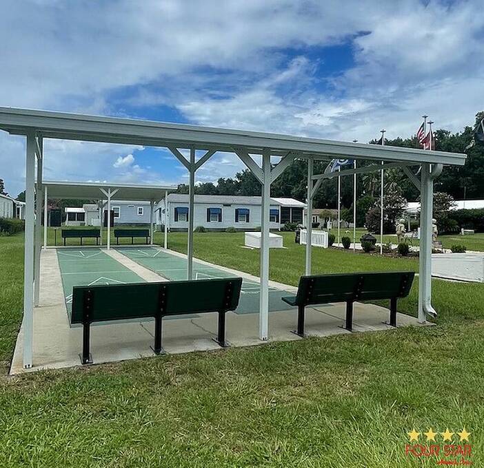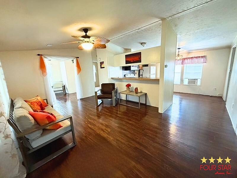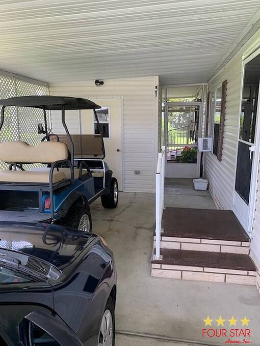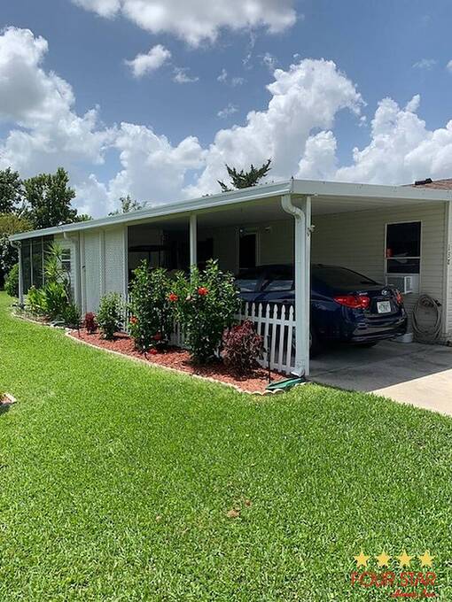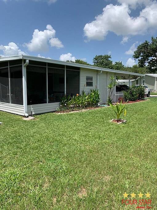 The home has a new roof that was installed in September 2024. The spacious primary bedroom accommodates a king-size bed. The en suite features a walk in shower and separate his and her sinks. This home has a split floorplan with the second bedroom on the opposite side of the house. The 2nd bathroom has a single sink and a tub and shower combo. The living room is a good size with wood look vinyl plank flooring that continues into all rooms of the home, except the bathrooms and laundry room, which have rolled vinyl. The kitchen is equipped with a refrigerator, electric oven and brand new built in microwave. Adjacent to the kitchen is the laundry room, featuring wire shelving above for added storage. Enjoy your morning coffee in your spacious screened in lanai that has roll down bamboo shades. The home features a long, single car driveway with carport, offering plenty of space for a golf cart and two vehicles, if needed. At the end of the carport, there is an outdoor shed that remains protected under the carports cover. The carport also has lattice for semi privacy by the shed entrance. The beautiful tropical landscaping creates an inviting curb appeal, enhanced by a uniquely shaped palm tree that adds striking character. Although the home is equipped with an HVAC system, it is currently not operational. However, three separate window AC units effectively keep the home comfortable. Do not miss the opportunity to experience this home in person- you will be amazed by the value it offers. Priced to sell!