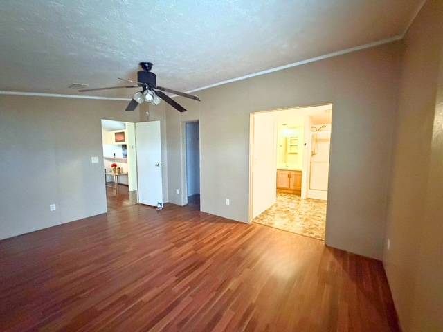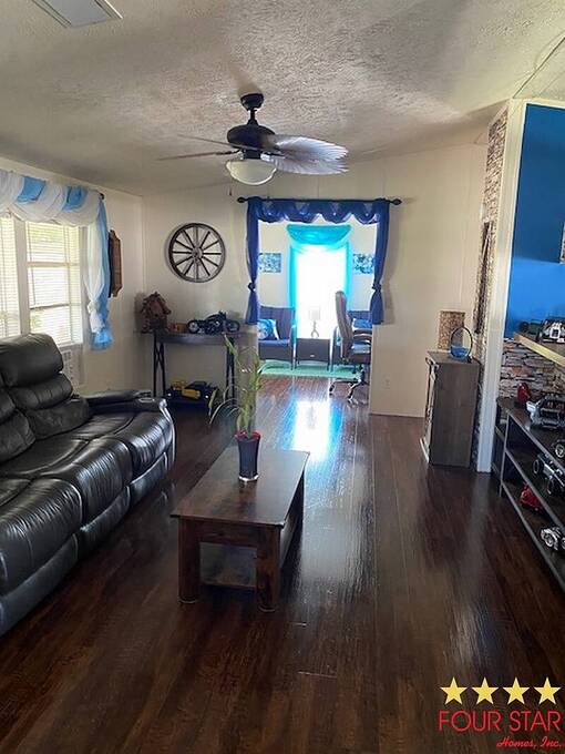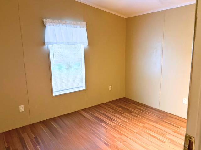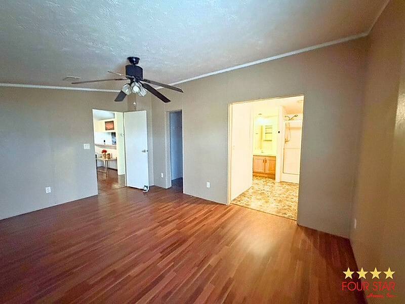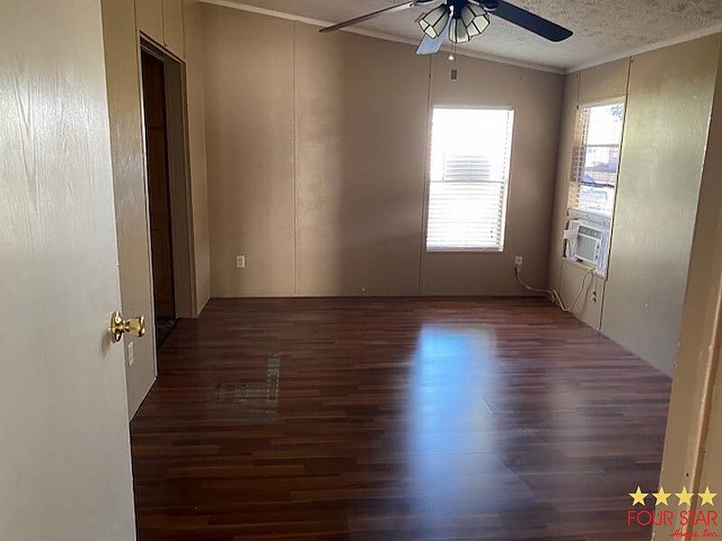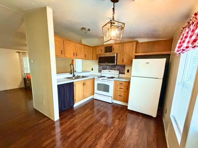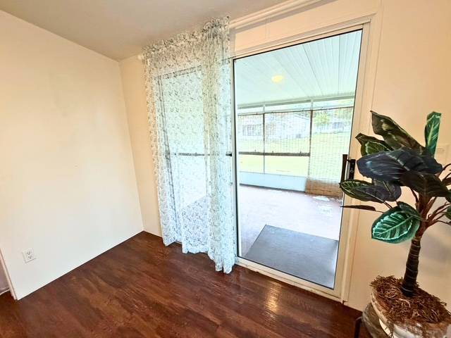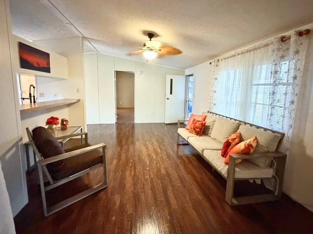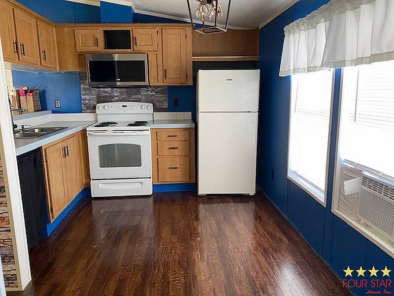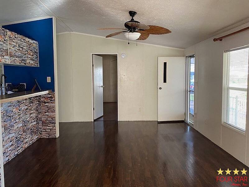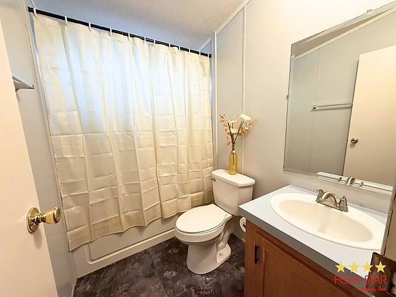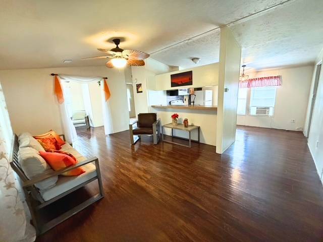 The home has a new roof that was installed in September 2024. The spacious primary bedroom accommodates a king-size bed. The en suite features a walk in shower and separate his and her sinks. This home has a split floorplan with the second bedroom on the opposite side of the house. The 2nd bathroom has a single sink and a tub and shower combo. The living room is a good size with wood look vinyl plank flooring that continues into all rooms of the home, except the bathrooms and laundry room, which have rolled vinyl. The kitchen is equipped with a refrigerator, electric oven and brand new built in microwave. Adjacent to the kitchen is the laundry room, featuring wire shelving above for added storage. Enjoy your morning coffee in your spacious screened in lanai that has roll down bamboo shades. The home features a long, single car driveway with carport, offering plenty of space for a golf cart and two vehicles, if needed. At the end of the carport, there is an outdoor shed that remains protected under the carports cover. The carport also has lattice for semi privacy by the shed entrance. The beautiful tropical landscaping creates an inviting curb appeal, enhanced by a uniquely shaped palm tree that adds striking character. Although the home is equipped with an HVAC system, it is currently not operational. However, three separate window AC units effectively keep the home comfortable. Do not miss the opportunity to experience this home in person- you will be amazed by the value it offers. Priced to sell!