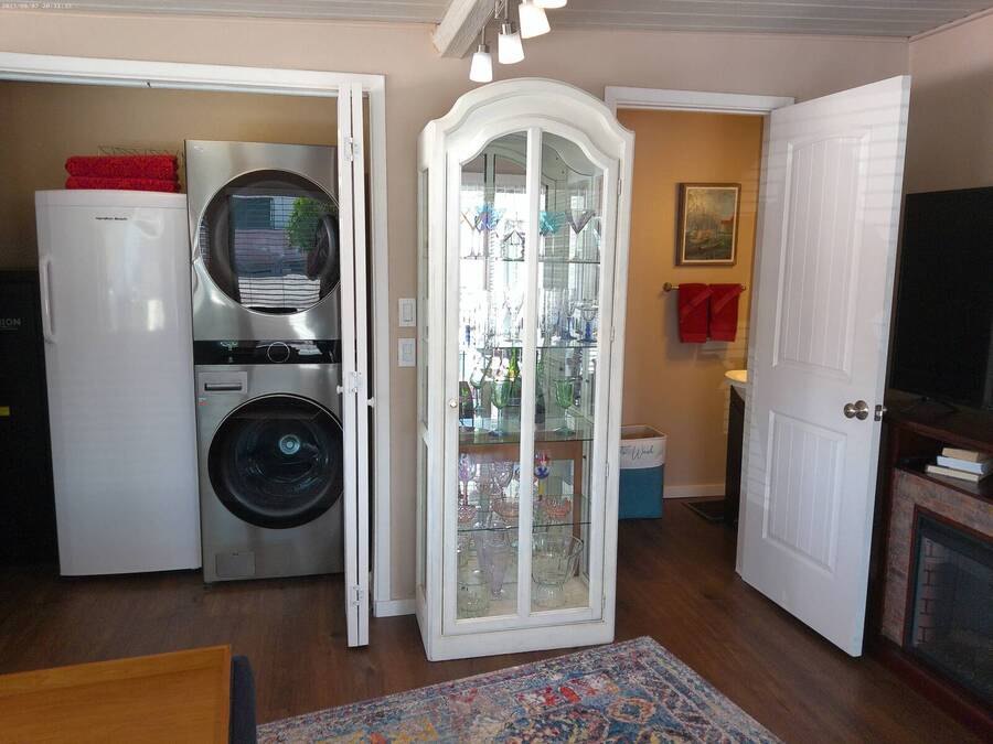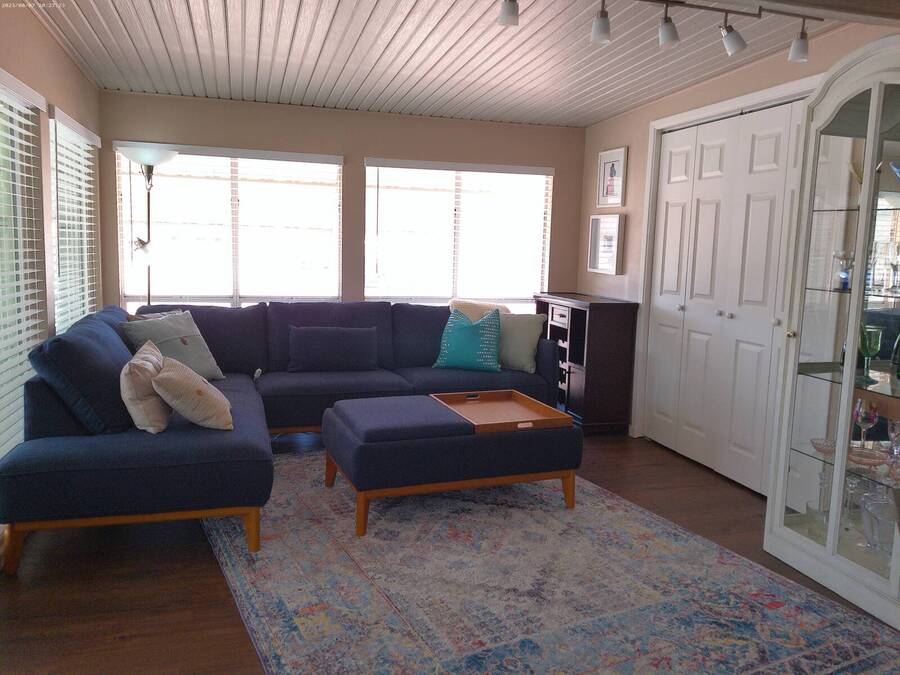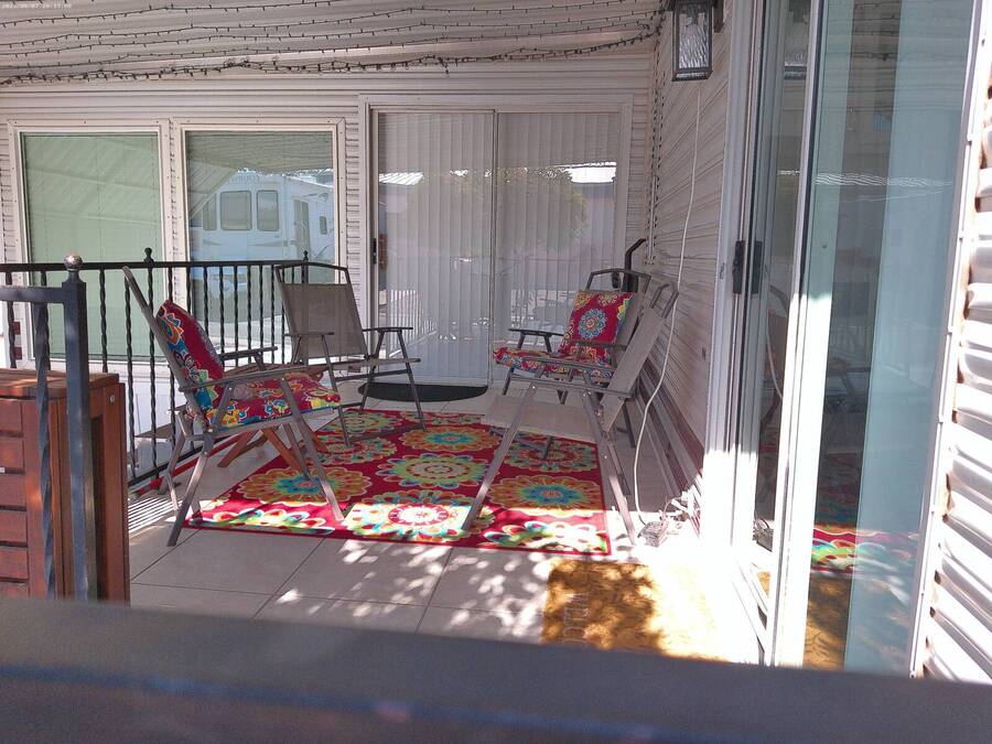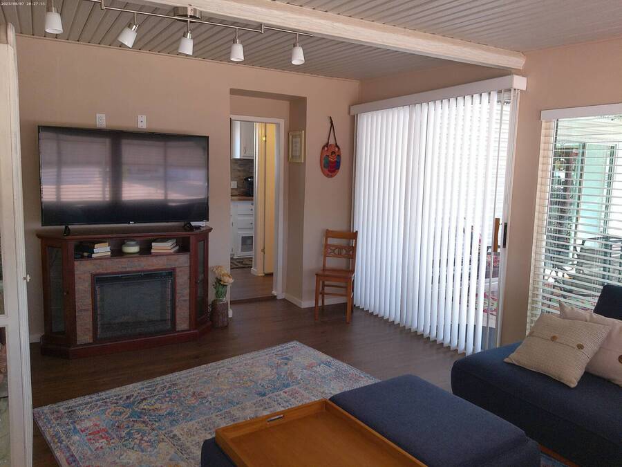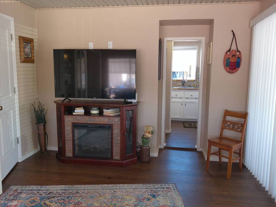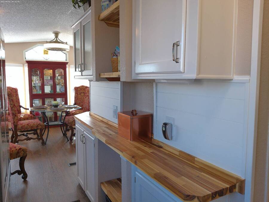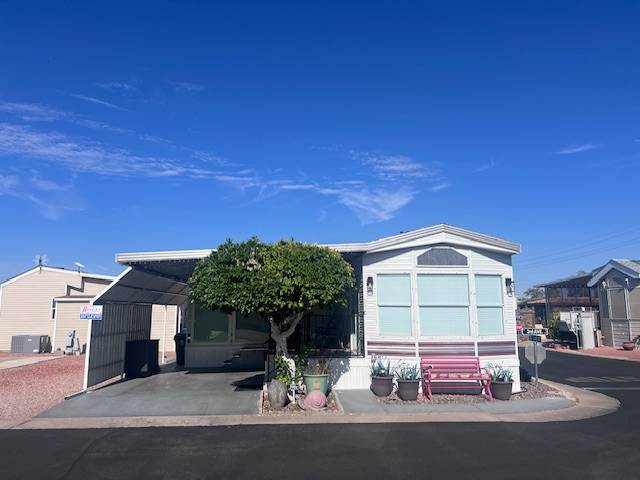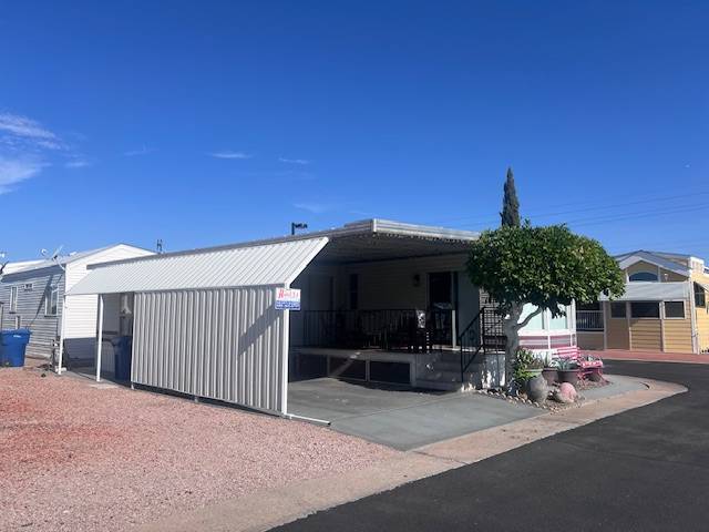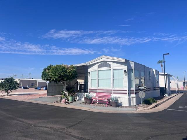 Located in a 55+ Resort, this Park Model was remodeled in 2023 and is Located on a Corner Lot Located Near the Back Gate. It Features a Raised AZ Room , Tiled Front Deck with Storage Drawers, Remodeled Galley Kitchen with Custom Shelving, Butcher Block Counter Tops, SS Sink & Full Size Refrigerator, Dishwasher, Garbage Disposal, New Built-in Microwave, Extra Half Bath, New Vanities, New Shower/Tub Combo, Textured & Painted Walls, Full Size Freezer, New Bladeless Ceiling Fans, New Blinds, Queen Bed, Laminate Wood Floors, New Full Size W/D, Recessed Awning to Allow More Space, Privacy Screens, Newer AZ Windows, Sliding Door has a Retractable Custom Vertical Cellular Screen, Outdoor Motion Detector Lights, New Skirting in 2023, Newer Central A/C & Heat. Lot Rented is Noted as a Monthly Estimate and is Due Annually in August of Each Year. Some Items Pictured May Not Convey.