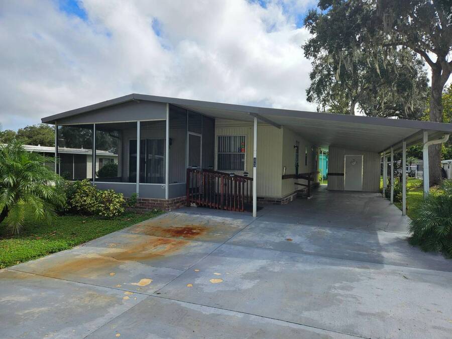 Hickory Hollow Estates in Leesburg offers affordable living with a low site rent of $609 which includes water, sewer and trash pick-up. Pet friendly with a 20lb weight limit on dogs, this small 55+ community is a waterfront, gated community that has a heated pool, clubhouse, marina, boat launch and much more. Only minutes from healthcare, shopping and fine dining. Situated on an oversized lot, this 1980 2B/2b home has been updated to include new carpeting throughout home, new toilets, new tankless on-demand hot water heater and wall mounted propane heater. Waist-high guide rails placed inside and outside home for walking stability. CHA less than 1 yr old. Metal roof sealed nine months ago. 8x15 west-facing lanai, 10x16 shed with laundry area. Call today to see this home before it's gone! SC2249