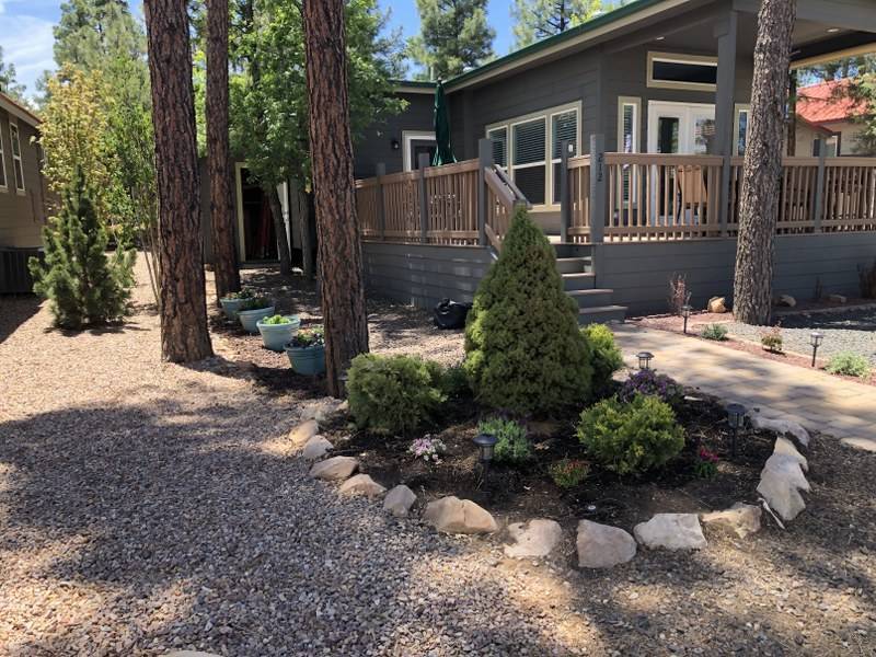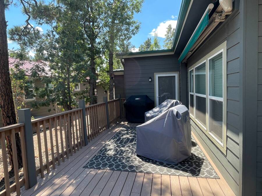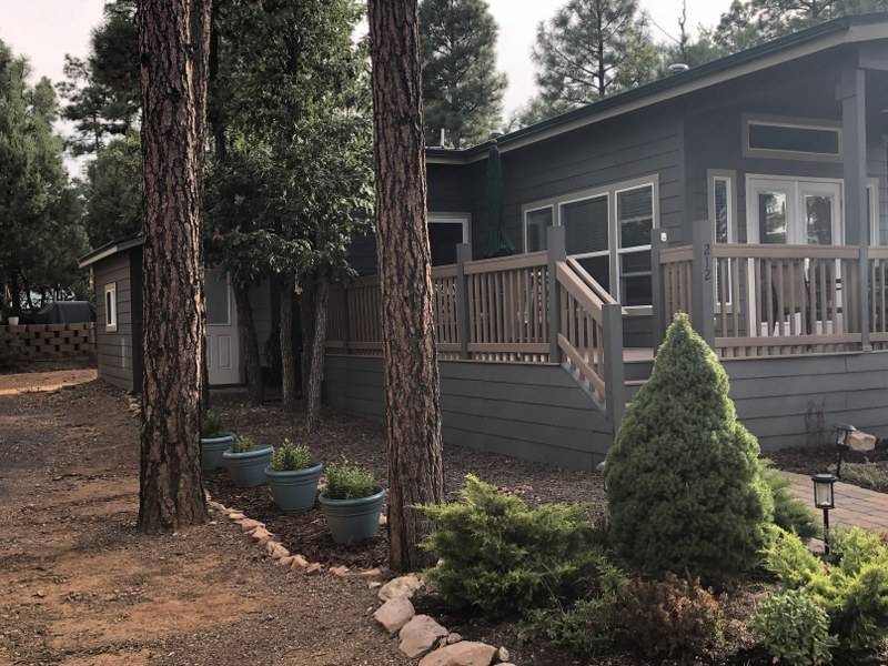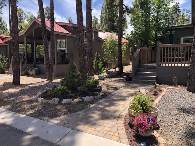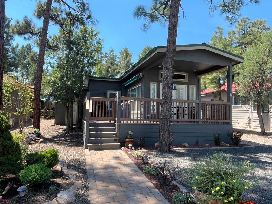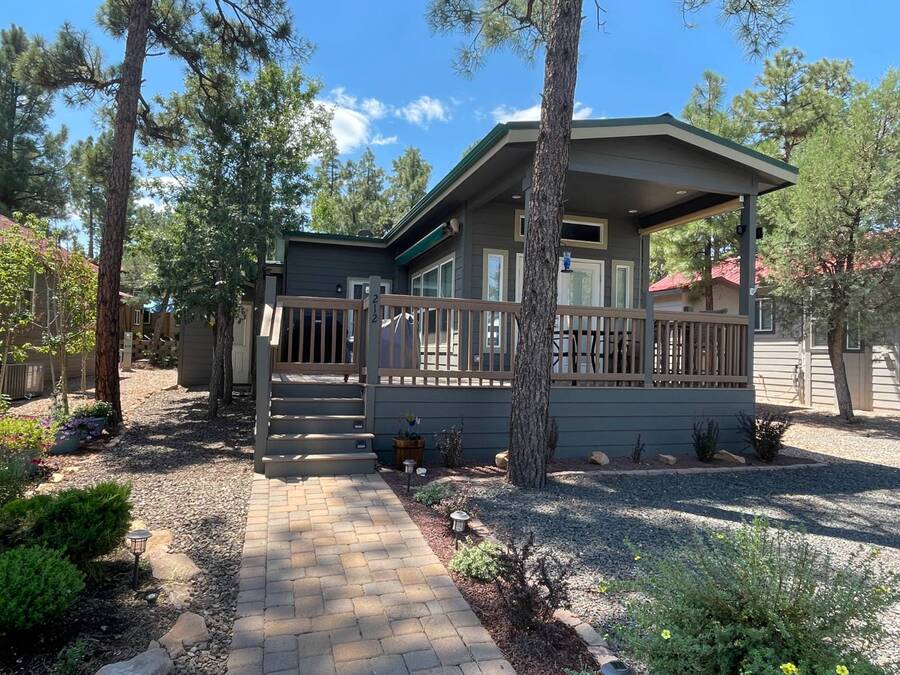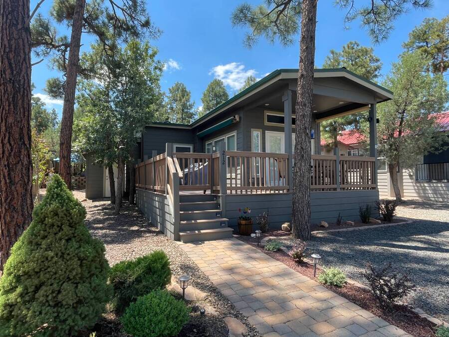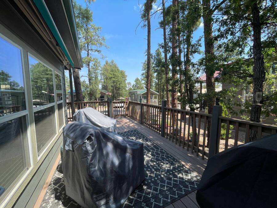 A premium furnished park model home that offers everything you need for comfort & convenience. This park model is 2 bedroom and 1 bathroom cottage model with a king size master bedroom, oversized drawer storage, mirrored closet doors, electric heating fireplace, oversized dining area windows, upgraded flooring, upgraded cabinets, full tiled back splash, stainless steel appliances, garbage disposal, ceiling fans with remotes, smart thermostat, beautifully landscaped, tree lined lot, solar landscape lighting, paver walkway, dual zone irrigation system, large covered front deck, extra large open wrap-around deck, new remote controlled motorized shade awning, and large attached storage shed with full electric and built in shelving. The 2nd bedroom/media room has a closet and exit to the deck. This home is located in the most highly sought after 55+ community in Show Low. The site is a comprehensive lease. Annual site fee covers the homesite as well as water, sewer, trash service & basic internet. This saves on the cost of real estate taxes, HOA fees and year-round utility costs. The community is a 55+ Park Model community located in the tall pines of Show Low, Arizona. As a year-round community you can enjoy all four seasons of the White Mountains, imagine yourself enjoying the cool mountain air, shaded by the tall pines and watching the deer stroll through the forest, all while only one mile from major shopping, dining and state of the art medical facilities. An array of outdoor activities can be found nearby too. The community's Rules & Regulations prohibit the use of the home as a rental.