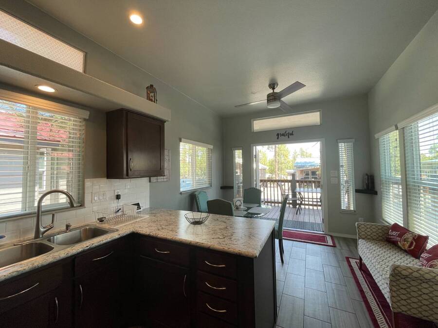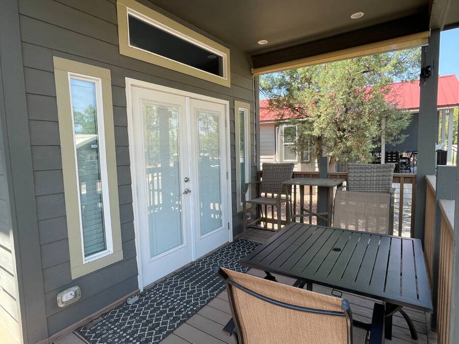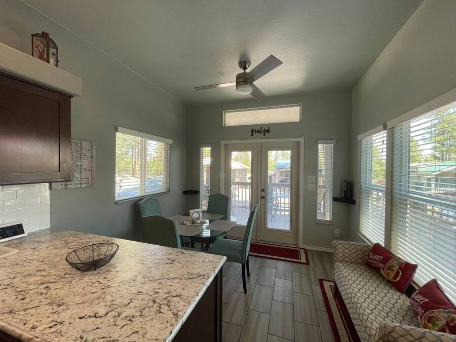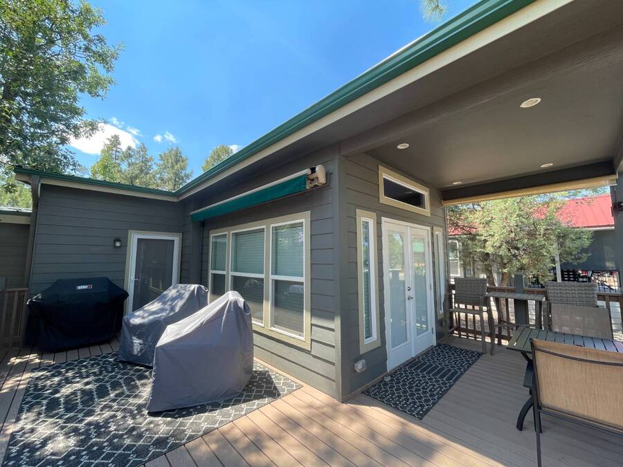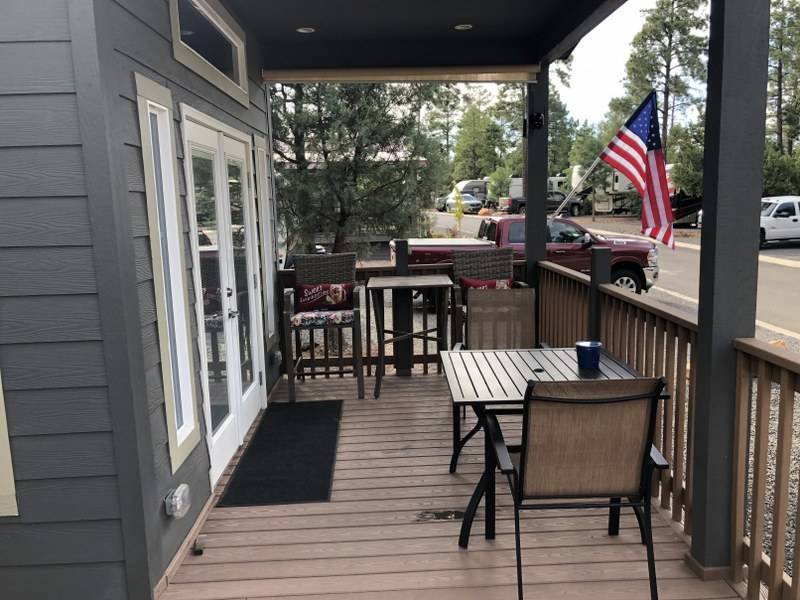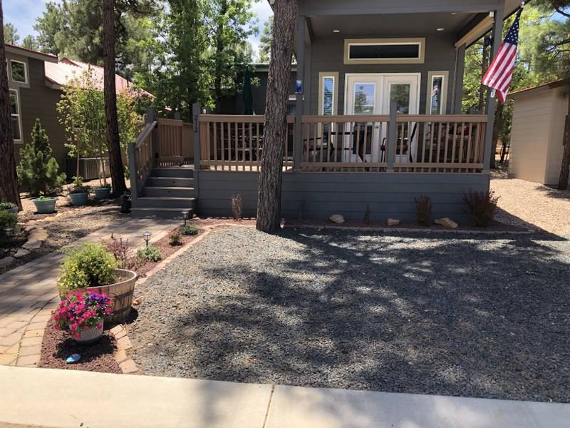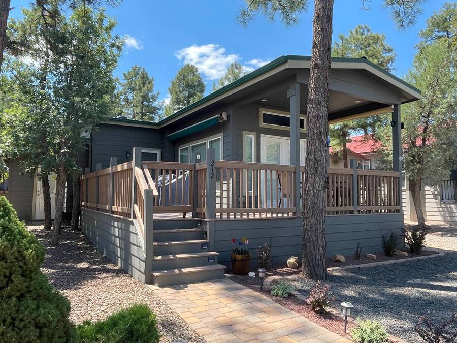 A premium furnished park model home that offers everything you need for comfort & convenience. This park model is 2 bedroom and 1 bathroom cottage model with a king size master bedroom, oversized drawer storage, mirrored closet doors, electric heating fireplace, oversized dining area windows, upgraded flooring, upgraded cabinets, full tiled back splash, stainless steel appliances, garbage disposal, ceiling fans with remotes, smart thermostat, beautifully landscaped, tree lined lot, solar landscape lighting, paver walkway, dual zone irrigation system, large covered front deck, extra large open wrap-around deck, new remote controlled motorized shade awning, and large attached storage shed with full electric and built in shelving. The 2nd bedroom/media room has a closet and exit to the deck. This home is located in the most highly sought after 55+ community in Show Low. The site is a comprehensive lease. Annual site fee covers the homesite as well as water, sewer, trash service & basic internet. This saves on the cost of real estate taxes, HOA fees and year-round utility costs. The community is a 55+ Park Model community located in the tall pines of Show Low, Arizona. As a year-round community you can enjoy all four seasons of the White Mountains, imagine yourself enjoying the cool mountain air, shaded by the tall pines and watching the deer stroll through the forest, all while only one mile from major shopping, dining and state of the art medical facilities. An array of outdoor activities can be found nearby too. The community's Rules & Regulations prohibit the use of the home as a rental.