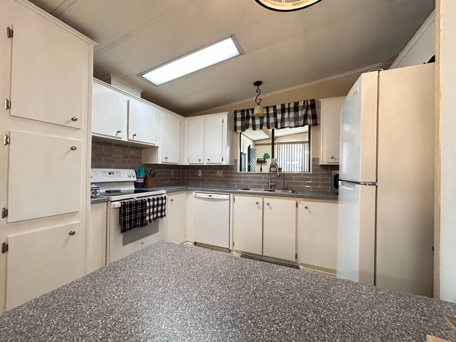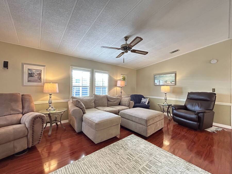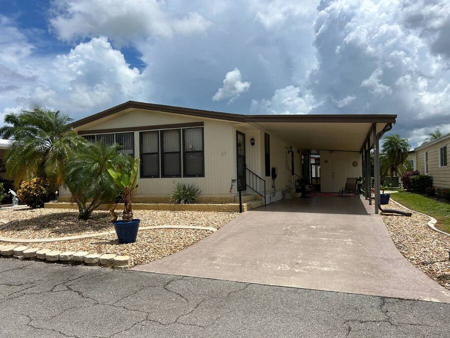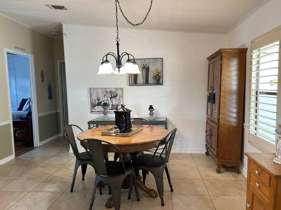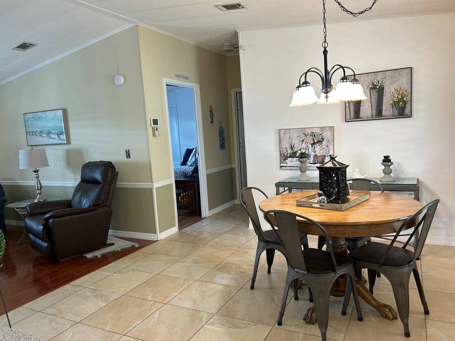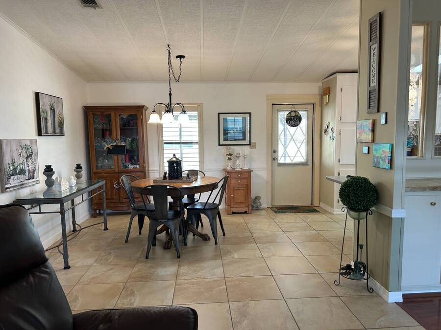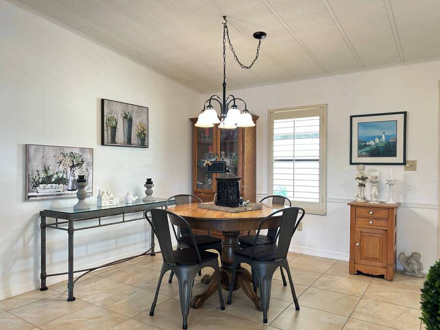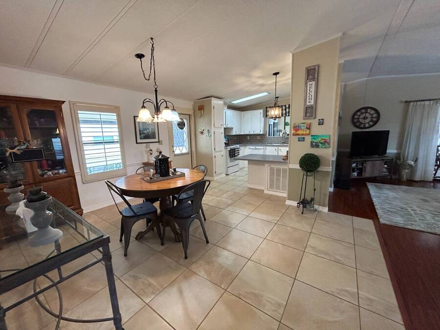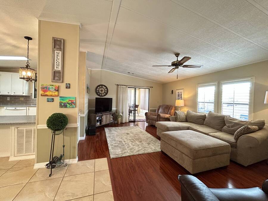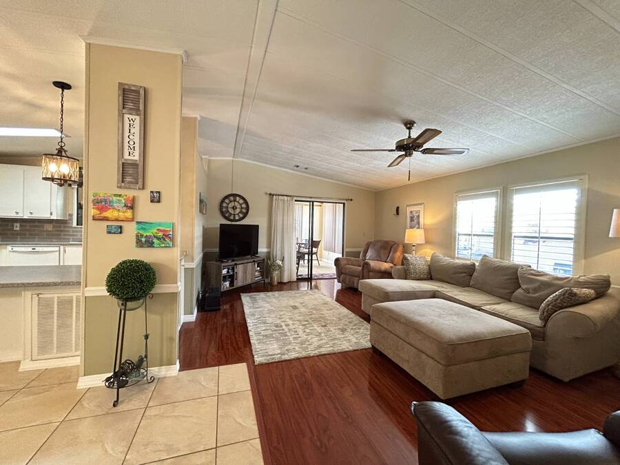 Charming 2-Bedroom, 2-Bath Home in Active Lifestyle Community Welcome to this beautifully maintained 1986 home offering 1344 sq. ft. of comfortable living space in a vibrant community filled with planned activities and opportunities to enjoy an active lifestyle. As you step inside, you'll be greeted by elegant tiled flooring in the kitchen and dining area, complemented by stunning flooring throughout the rest of the home. The kitchen has been recently upgraded with gorgeous stone countertops and stylish subway tile backsplash, making it both functional and eye-catching. The spacious living room is perfect for gathering with family and friends, while the front bonus room under air provides extra seating or a cozy space for guests to relax. The first bedroom offers a generous size with a convenient walk-in closet, and just across the hall, you'll find a full bathroom with a tub and shower enclosure. The primary suite is a true retreat, featuring a sliding closet, a walk-in closet, and a private en suite bath with dual vanities, a walk-in shower, and a charming transom window that fills the space with natural light. Additional highlights include plantation shutters, an outdoor shed with laundry (washer and dryer included), and a long carport with space for outdoor seating. This lovely home offers the perfect blend of comfort, style, and community living. Don't miss the chance to make it yours!